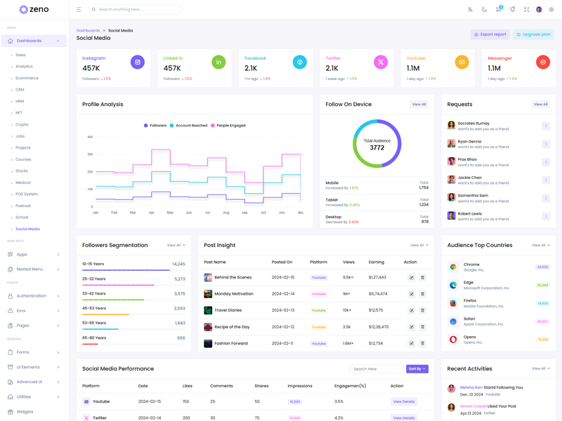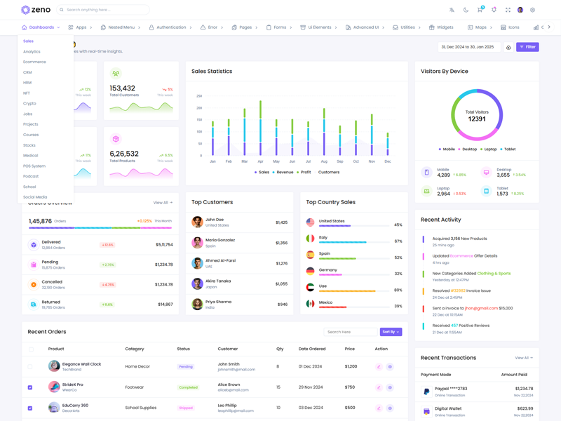 Zeno offers 16 attractive dashboards with various themes for users to customize the Premium Bootstrap Admin Template based on their preference.