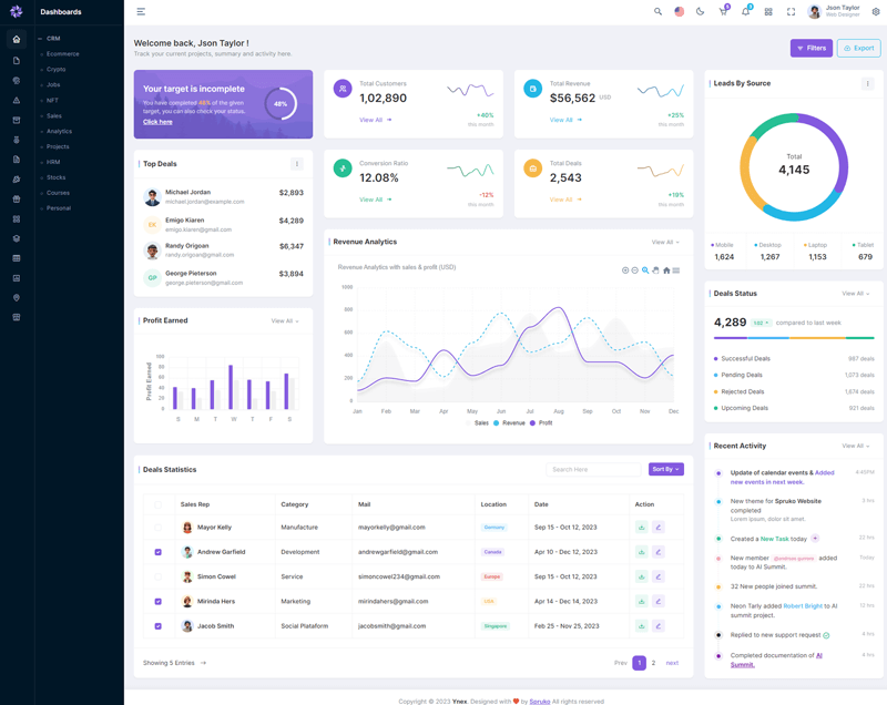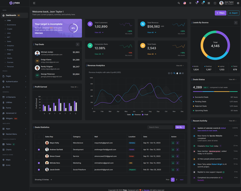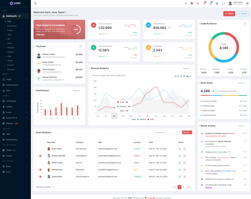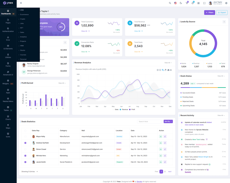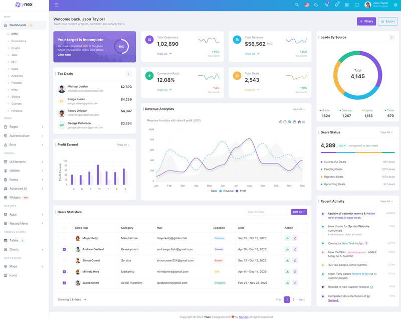 Ynex admin template comes with ready to use features. It has lots of ready-made features saves more time for developers.