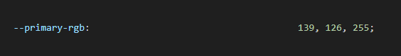public string ThemePrimary { get; set; } = ""; // '106, 91, 204', '100, 149, 237', '0, 123, 167', '10, 180, 255', '46, 81, 145'