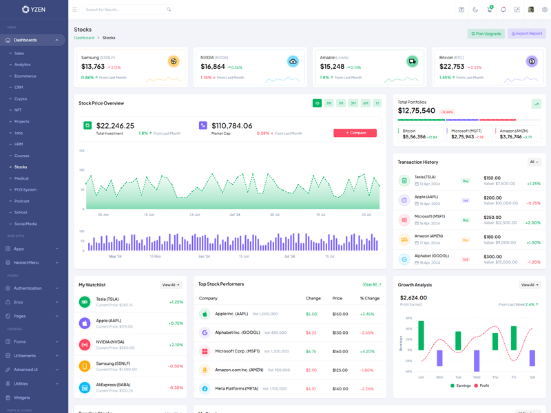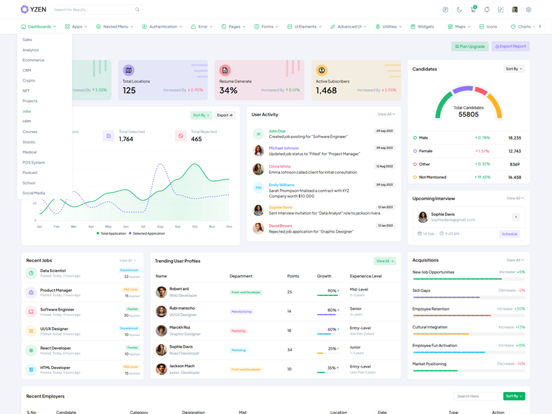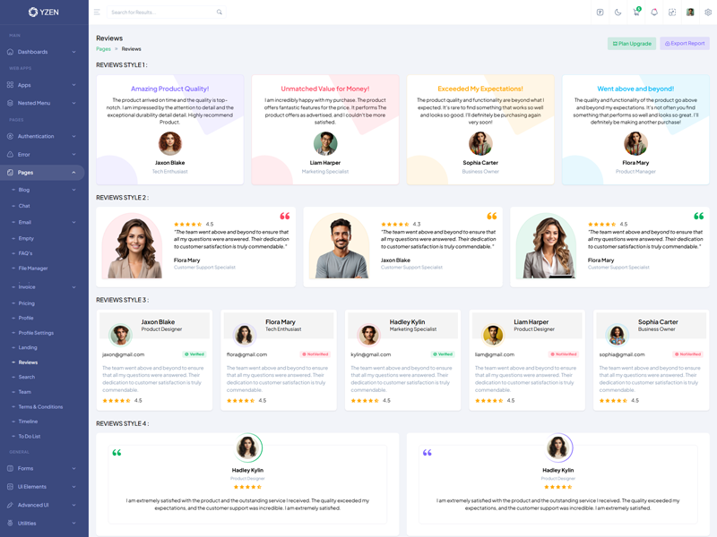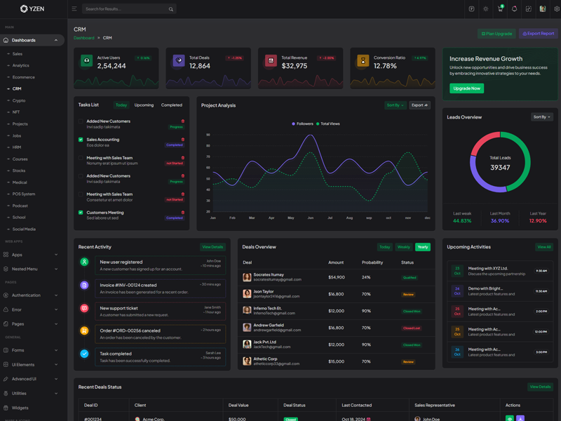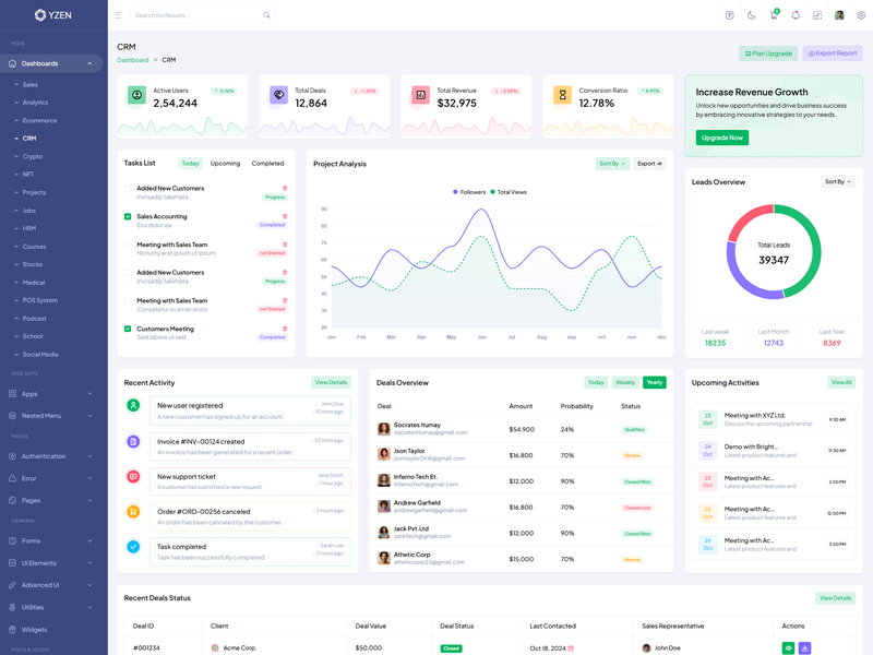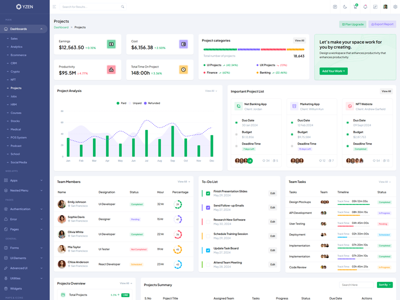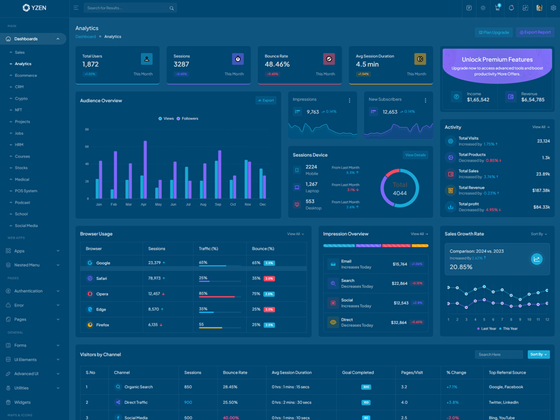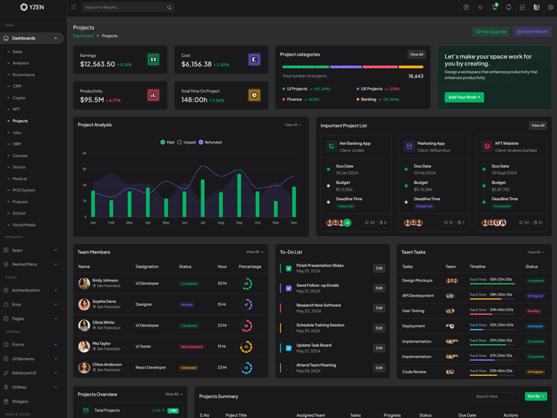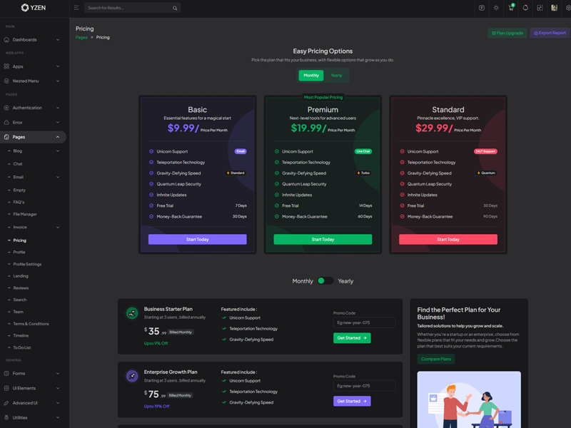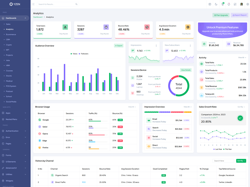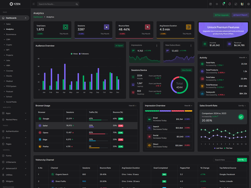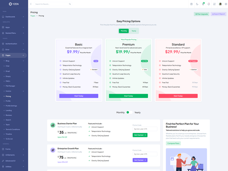 Yzen - Premium Admin & Dashboard Template boasts essential features such as design quality, compatibility with your front-end framework, responsiveness, ease of customization, comprehensive documentation, and dedicated support. Additionally, it includes integrated plugins and other supplementary features.