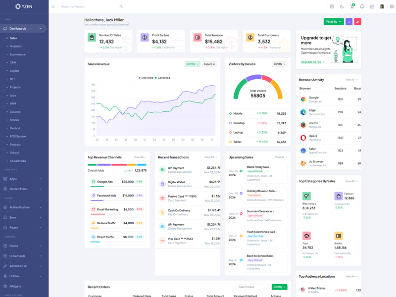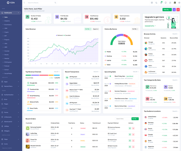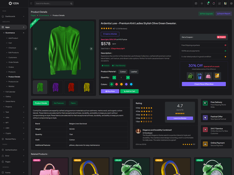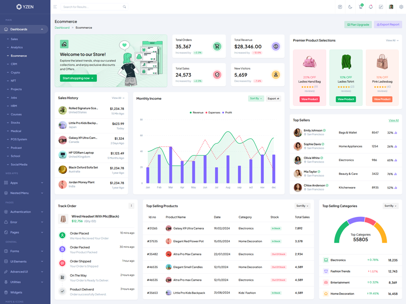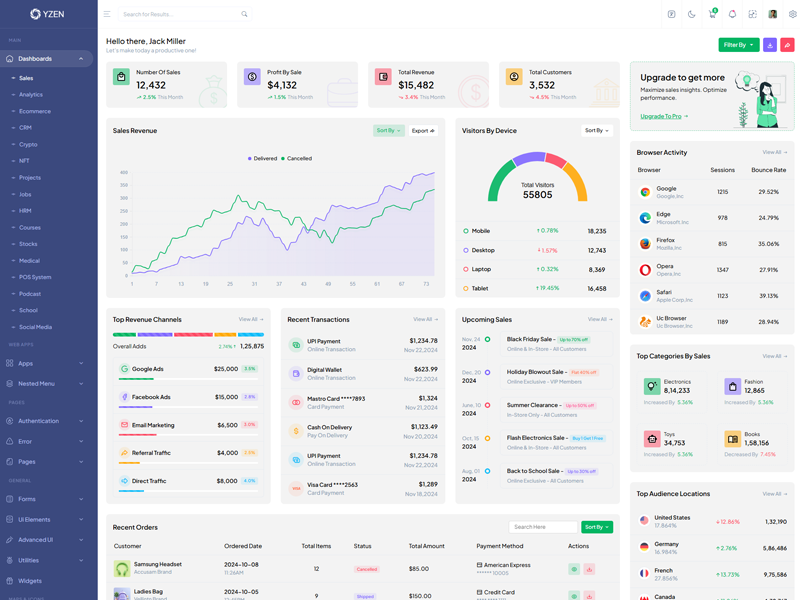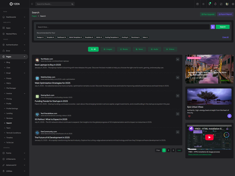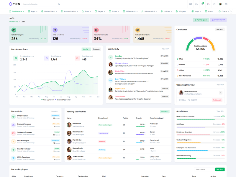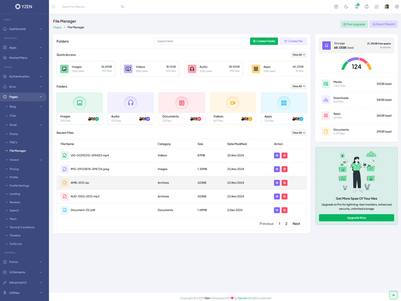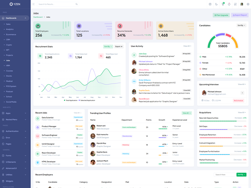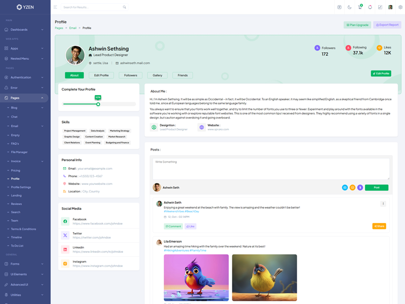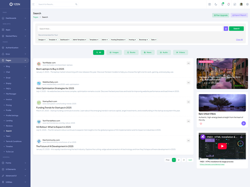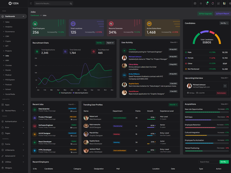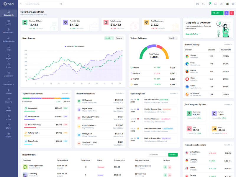 Yzen - Premium Admin & Dashboard Template boasts essential features such as design quality, compatibility with your front-end framework, responsiveness, ease of customization, comprehensive documentation, and dedicated support. Additionally, it includes integrated plugins and other supplementary features.
