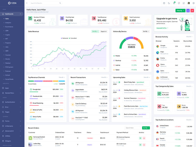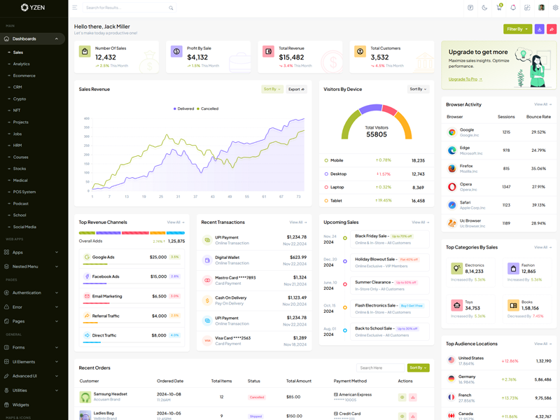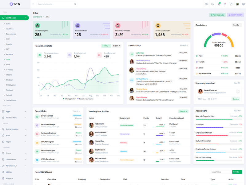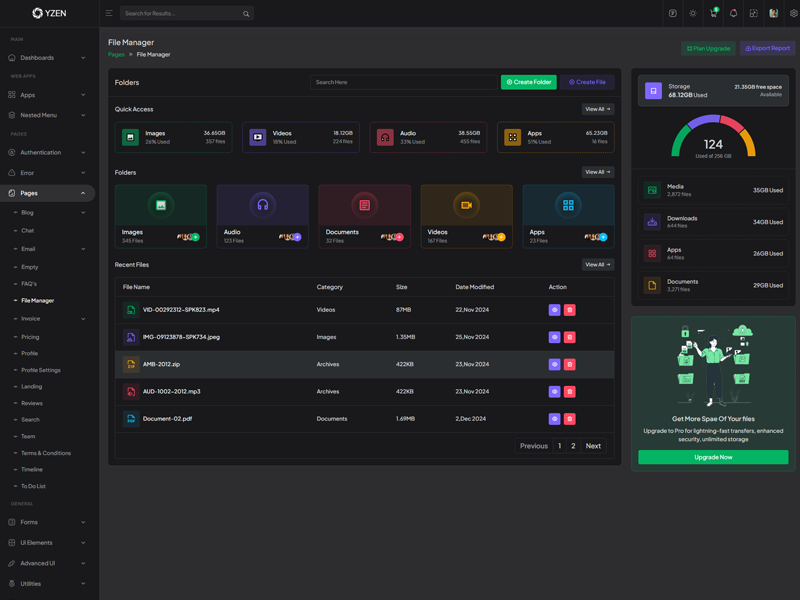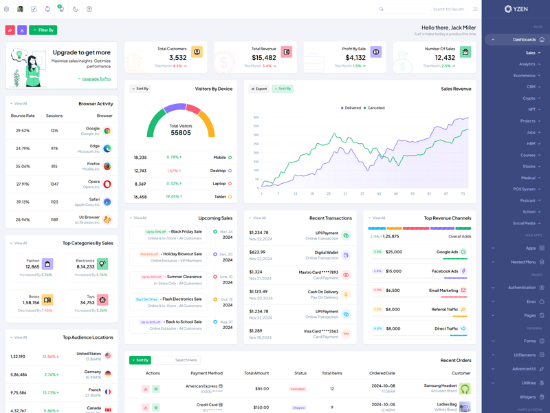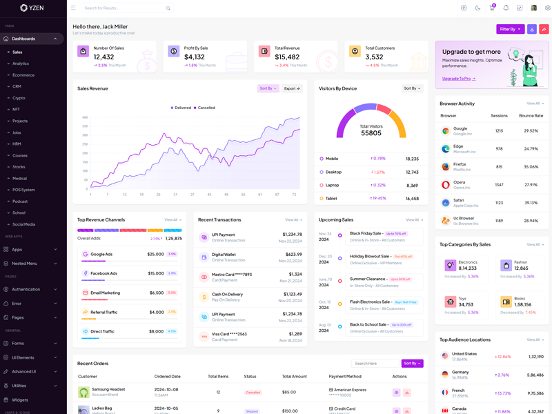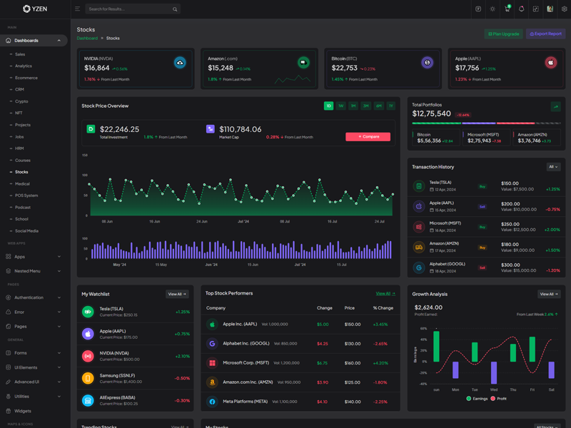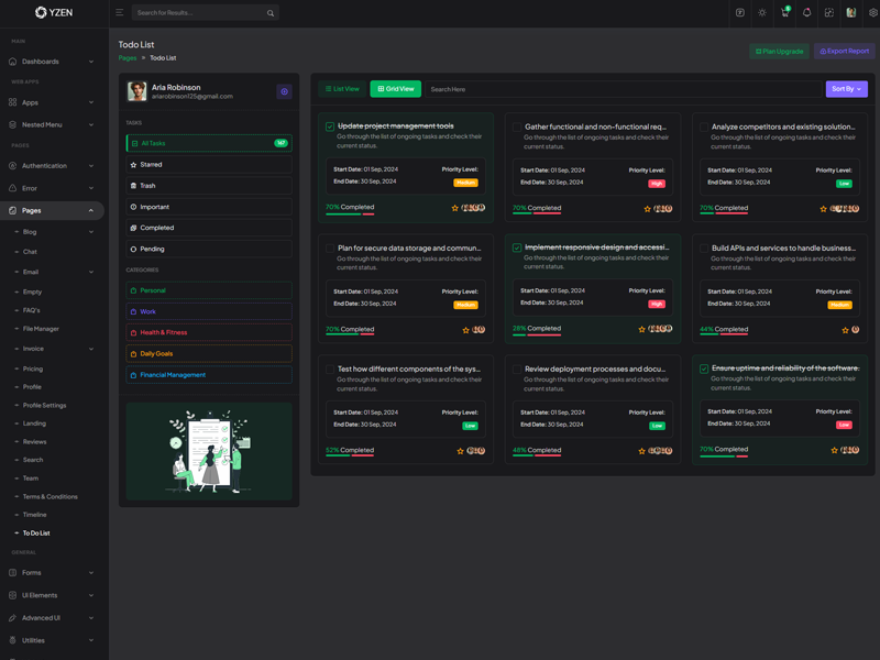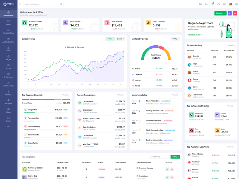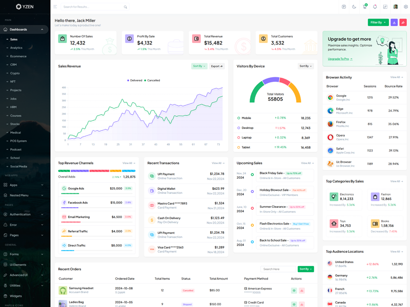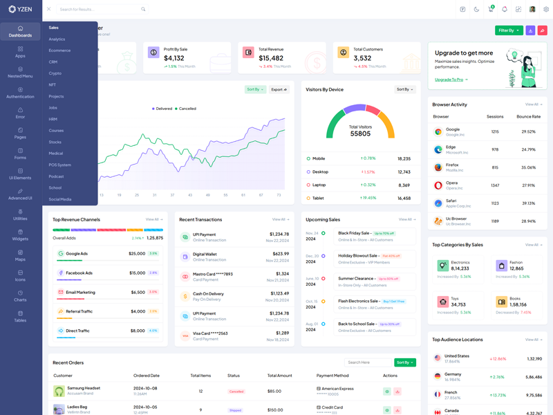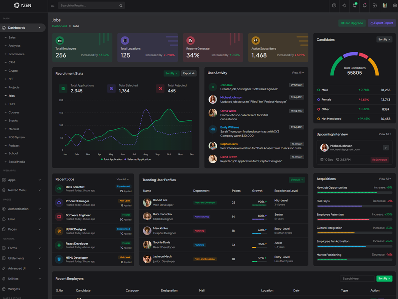 Yzen - Premium Admin & Dashboard Template boasts essential features such as design quality, compatibility with your front-end framework, responsiveness, ease of customization, comprehensive documentation, and dedicated support. Additionally, it includes integrated plugins and other supplementary features.