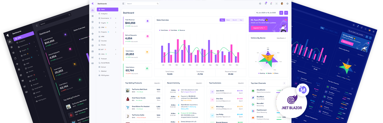 Vyzor – MudBlazor Web App Blazor Innovative Admin Dashboard Template offers top-tier design, seamless framework compatibility, full responsiveness, and easy customization. With beginner-friendly docs, dedicated support, and integrated plugins, Vyzor provides a powerful foundation for modern applications.