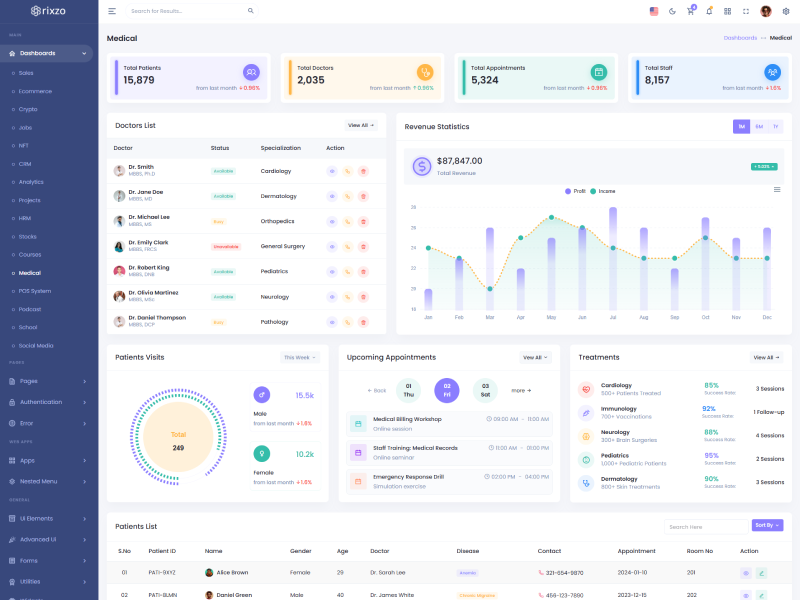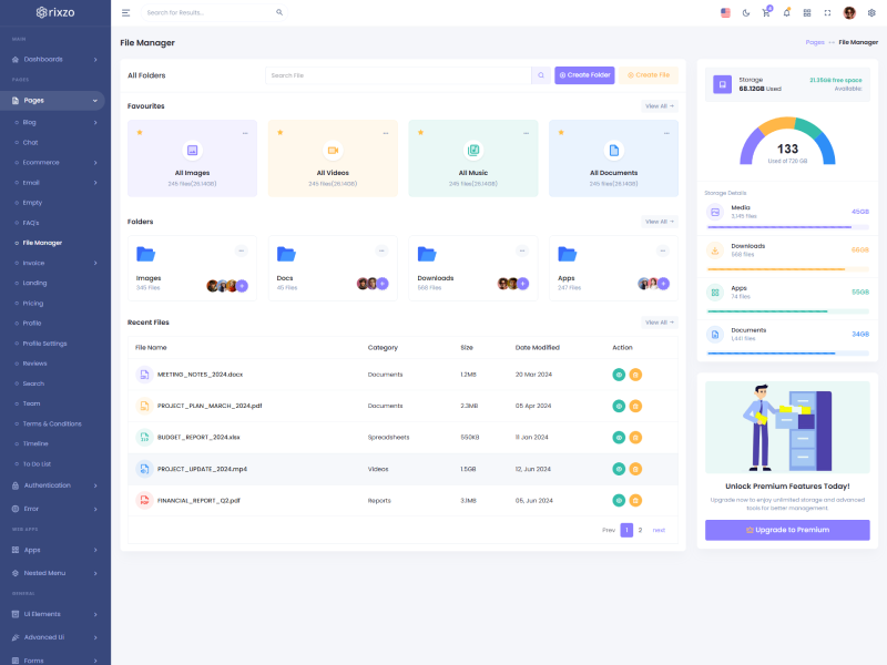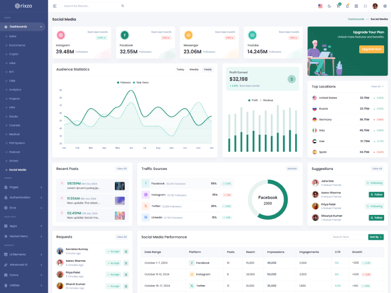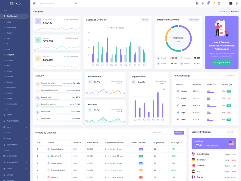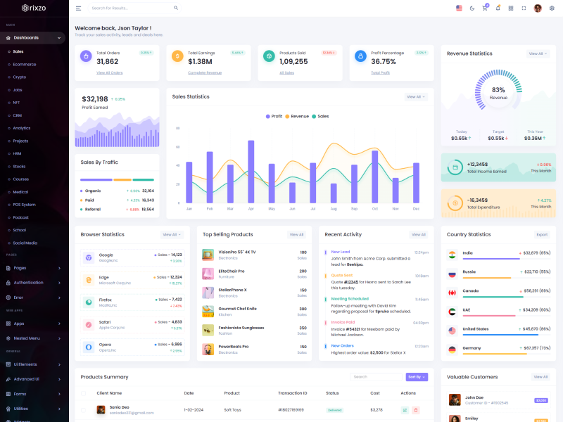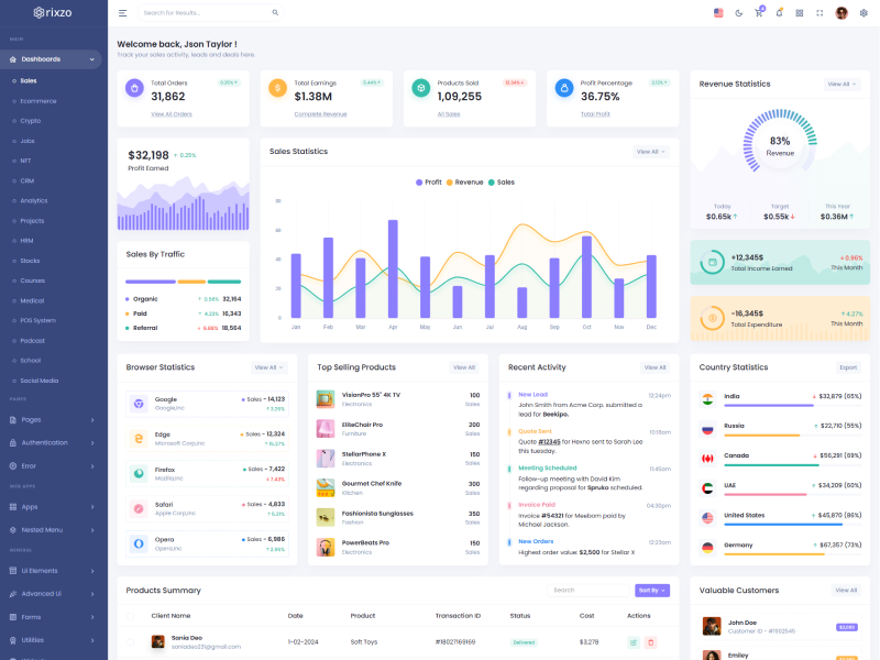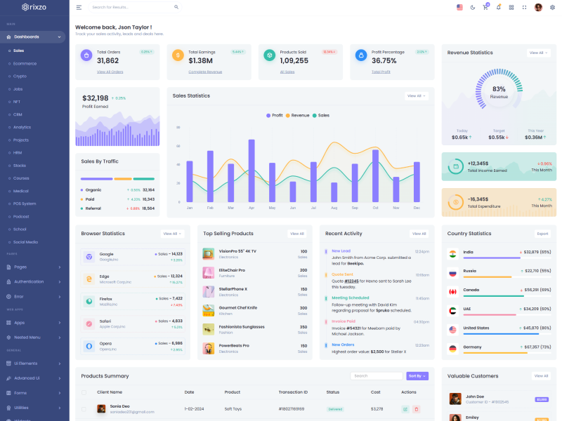 Rixzo - Django Premium Bootstrap 5 Admin & Dashboard Template boasts essential features such as design quality, compatibility with your front-end framework, responsiveness, ease of customization, comprehensive documentation, and dedicated support. Additionally, it includes integrated plugins and other supplementary features.