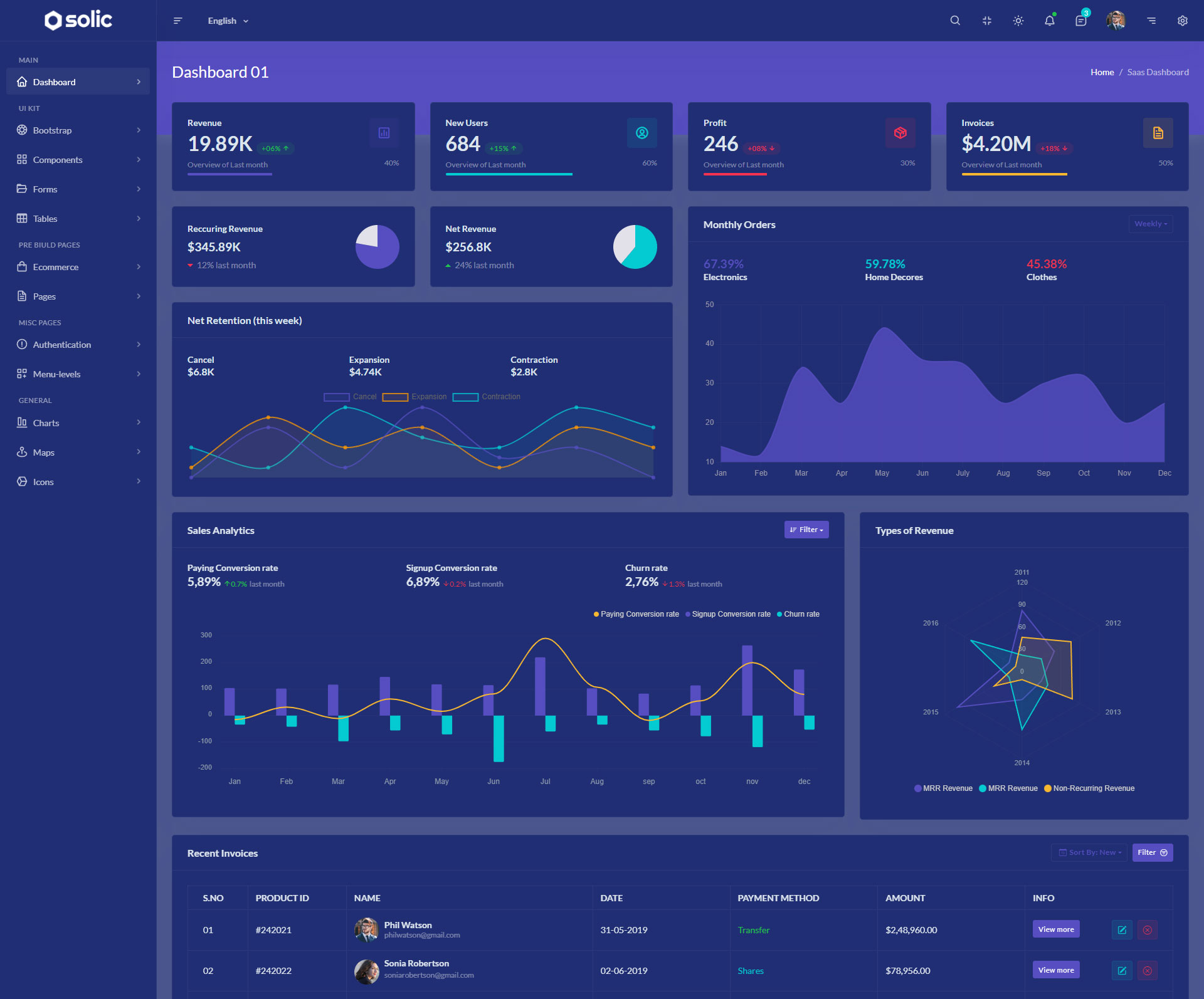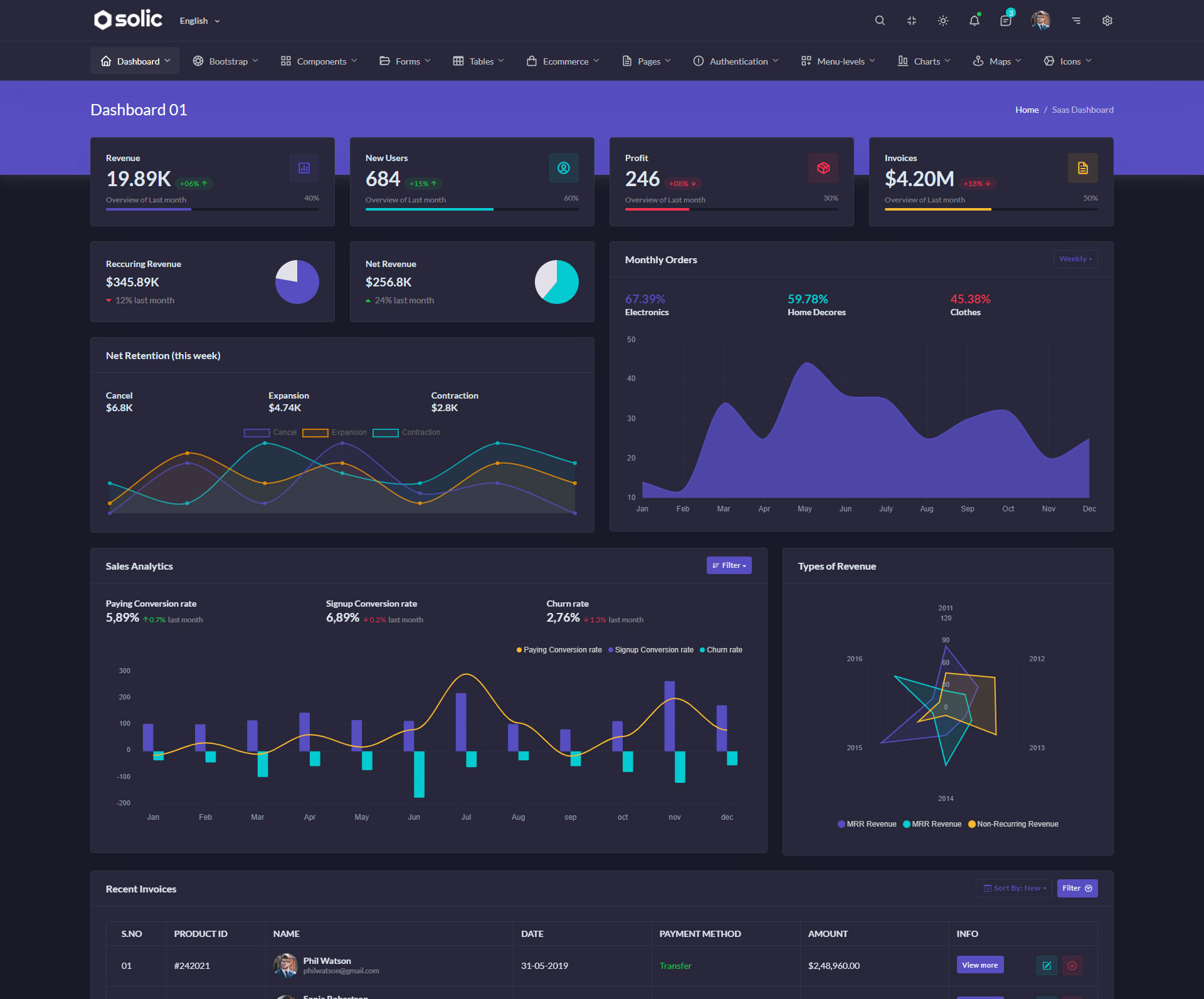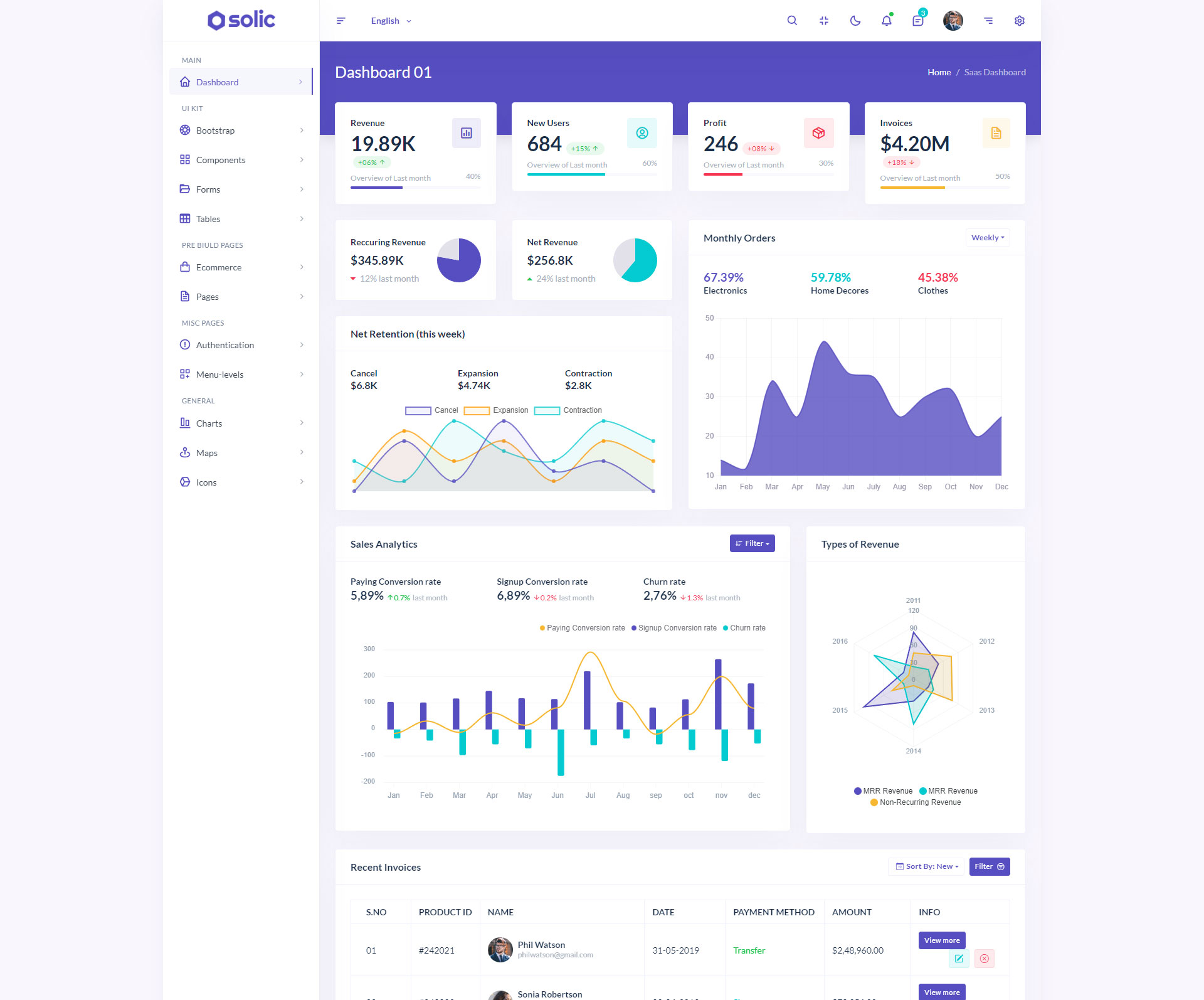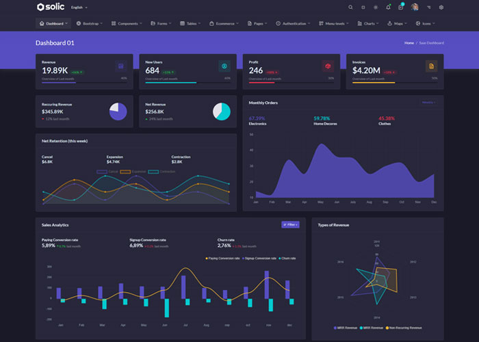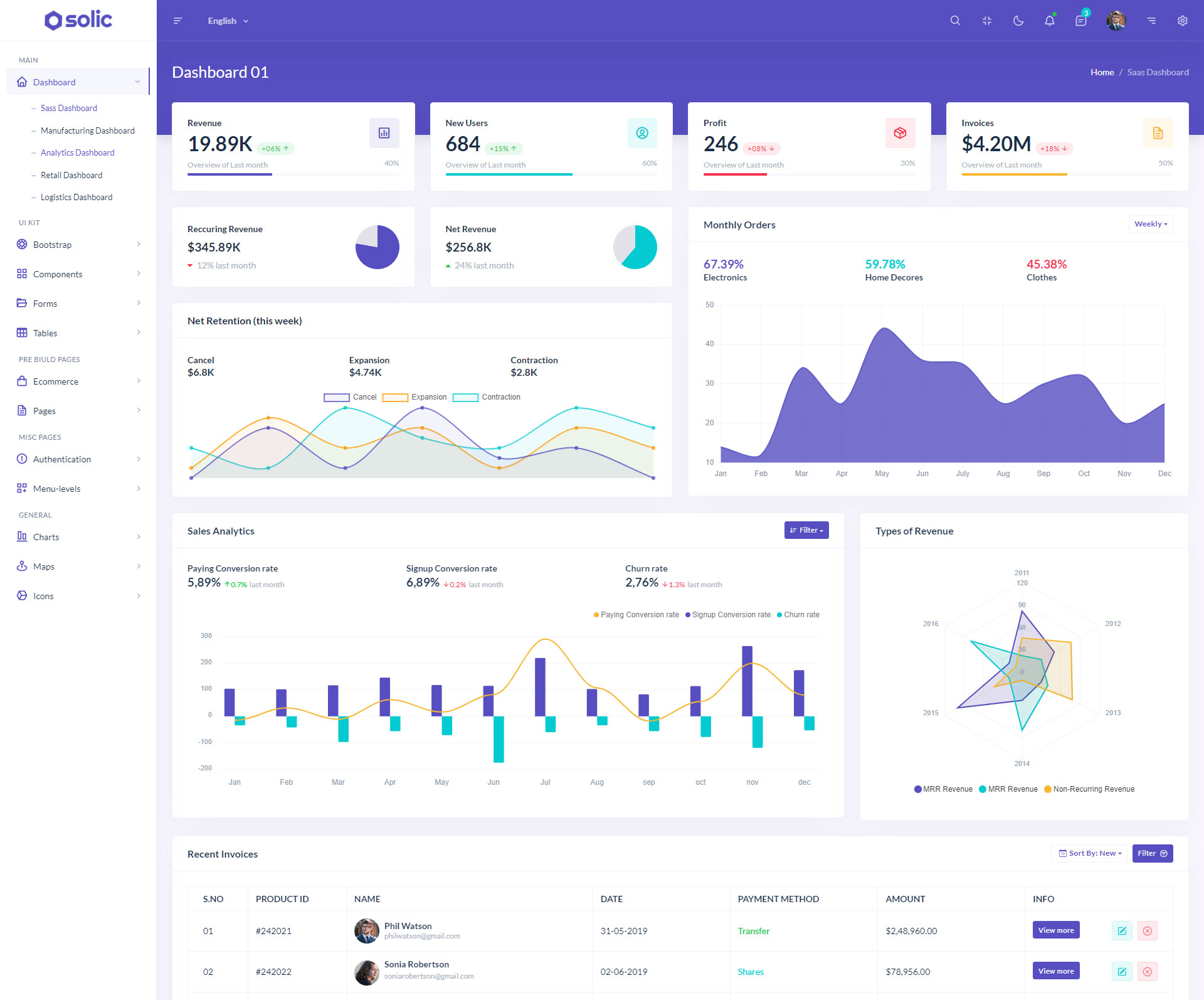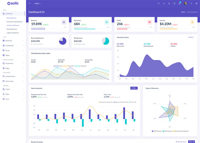 Solic Django admin template comes with of ready to use feature. It has lots of premade functionality which completely ready for any projects.