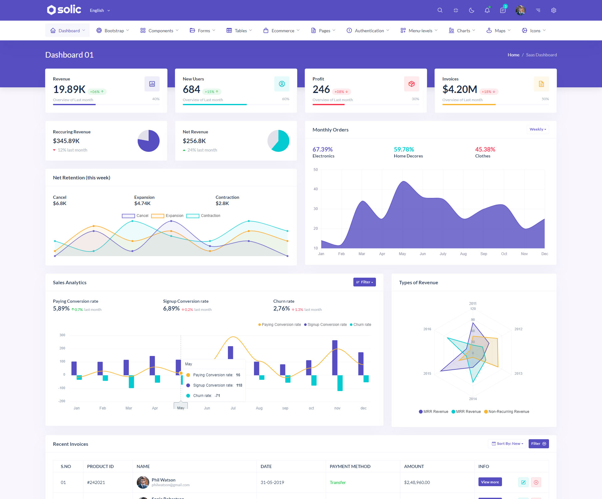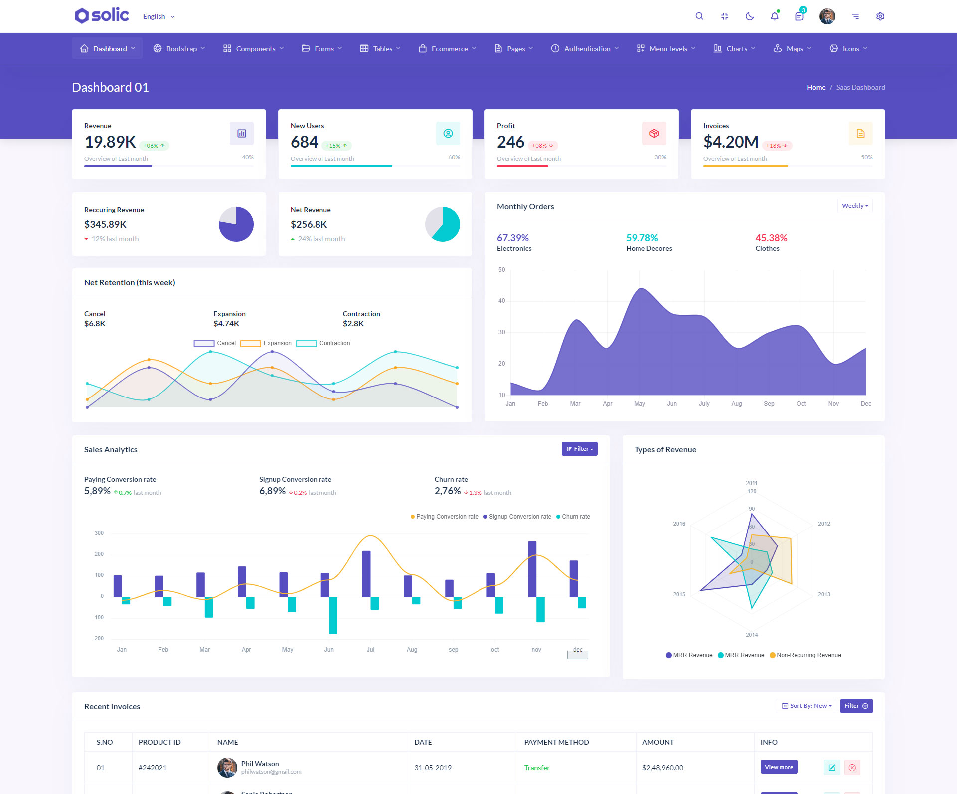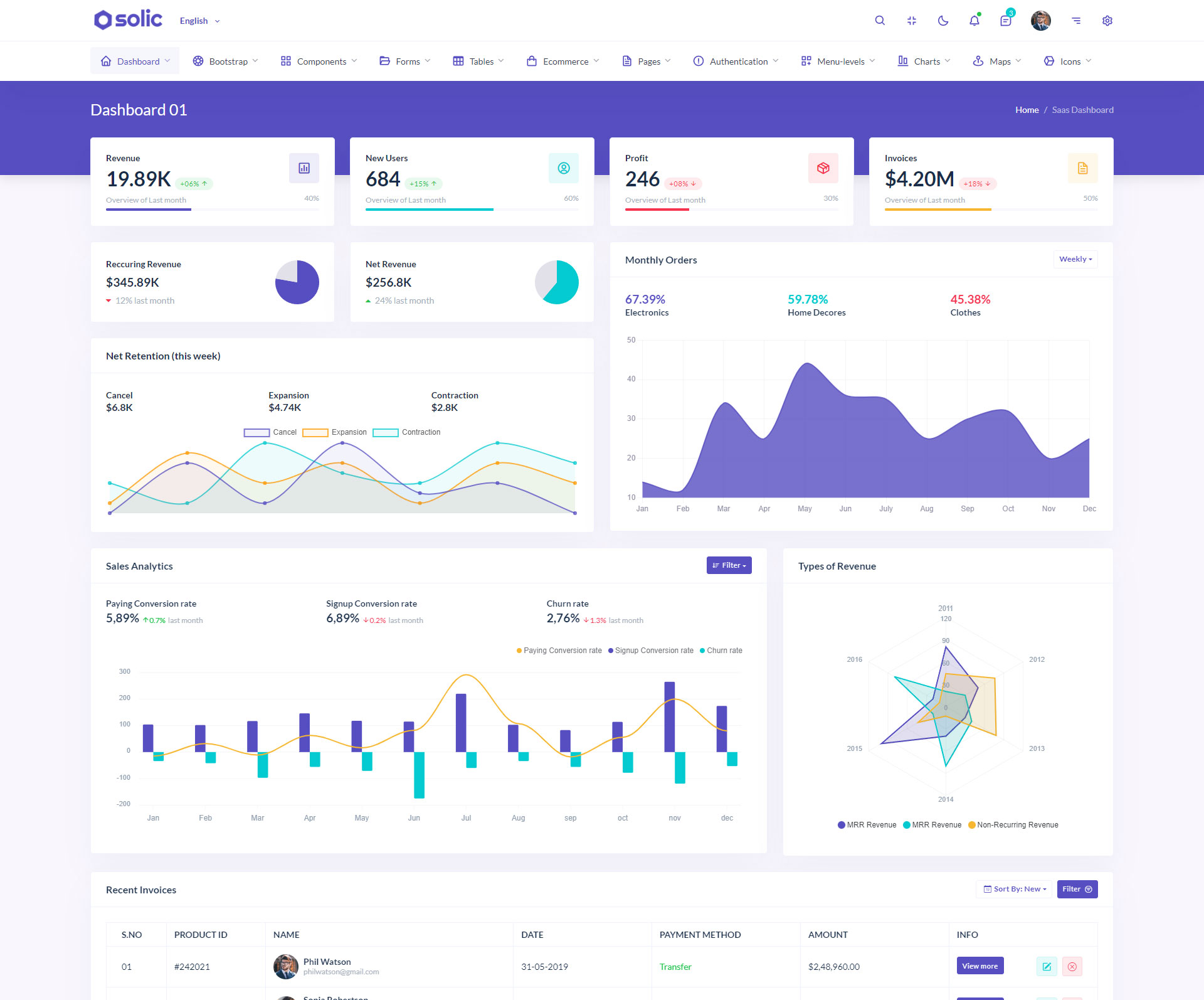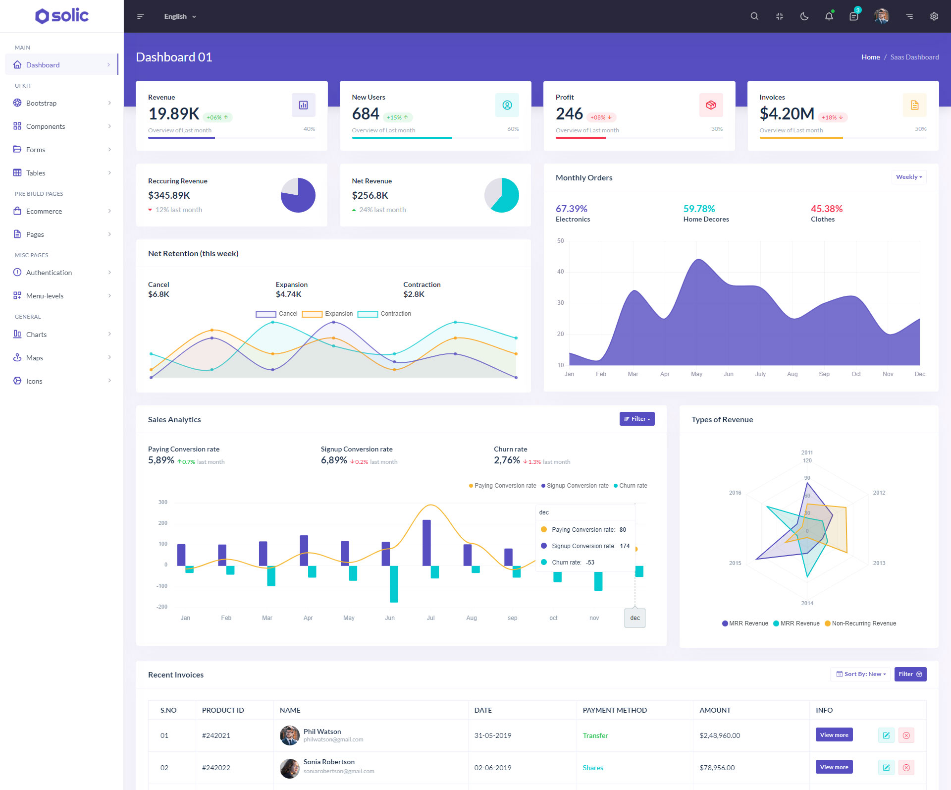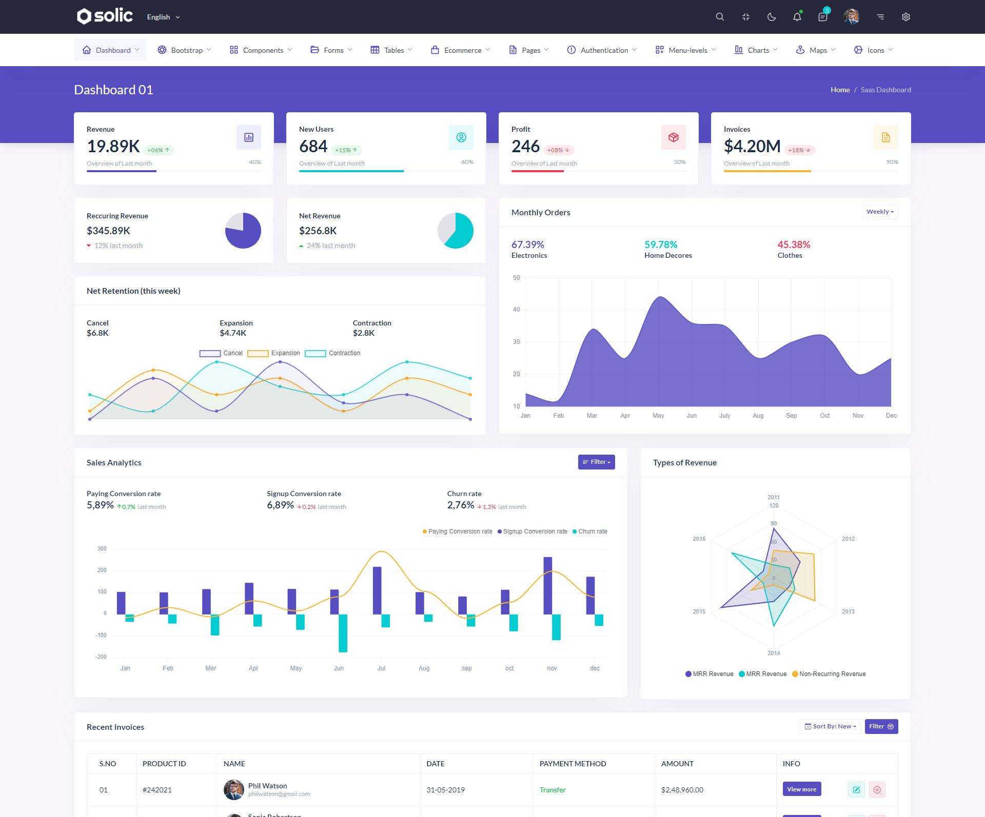 Solic Django admin template comes with of ready to use feature. It has lots of premade functionality which completely ready for any projects.