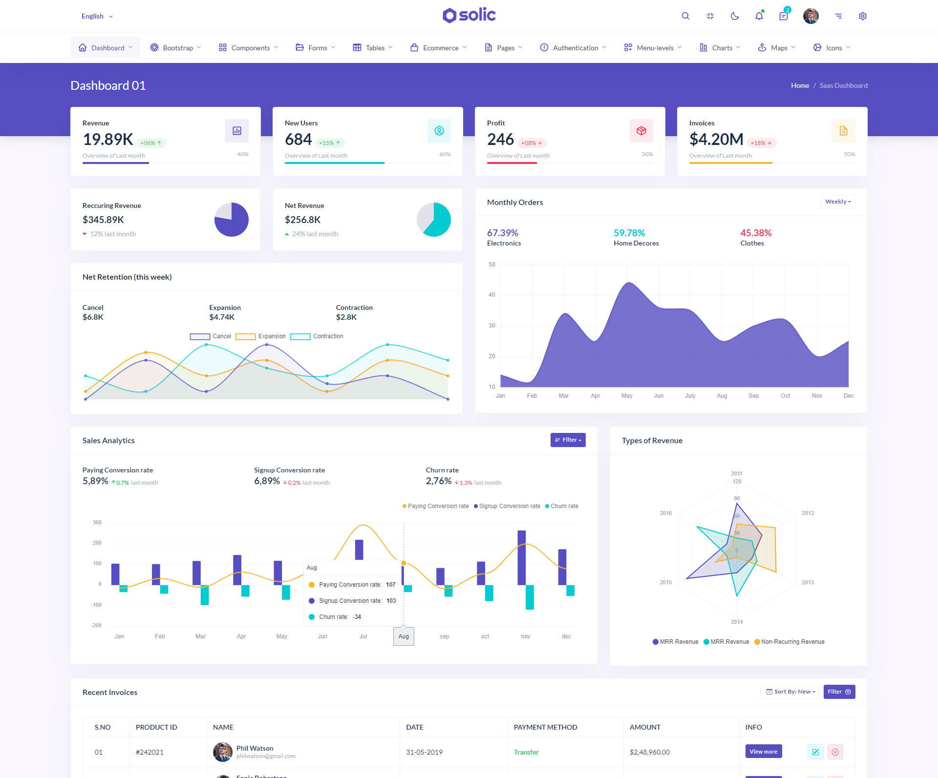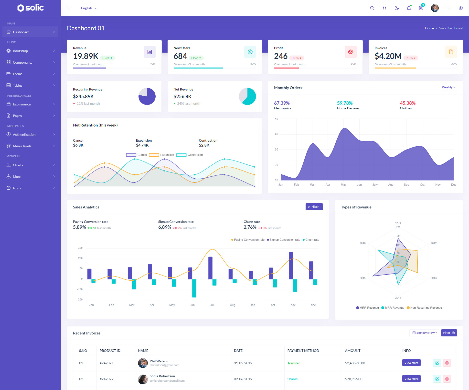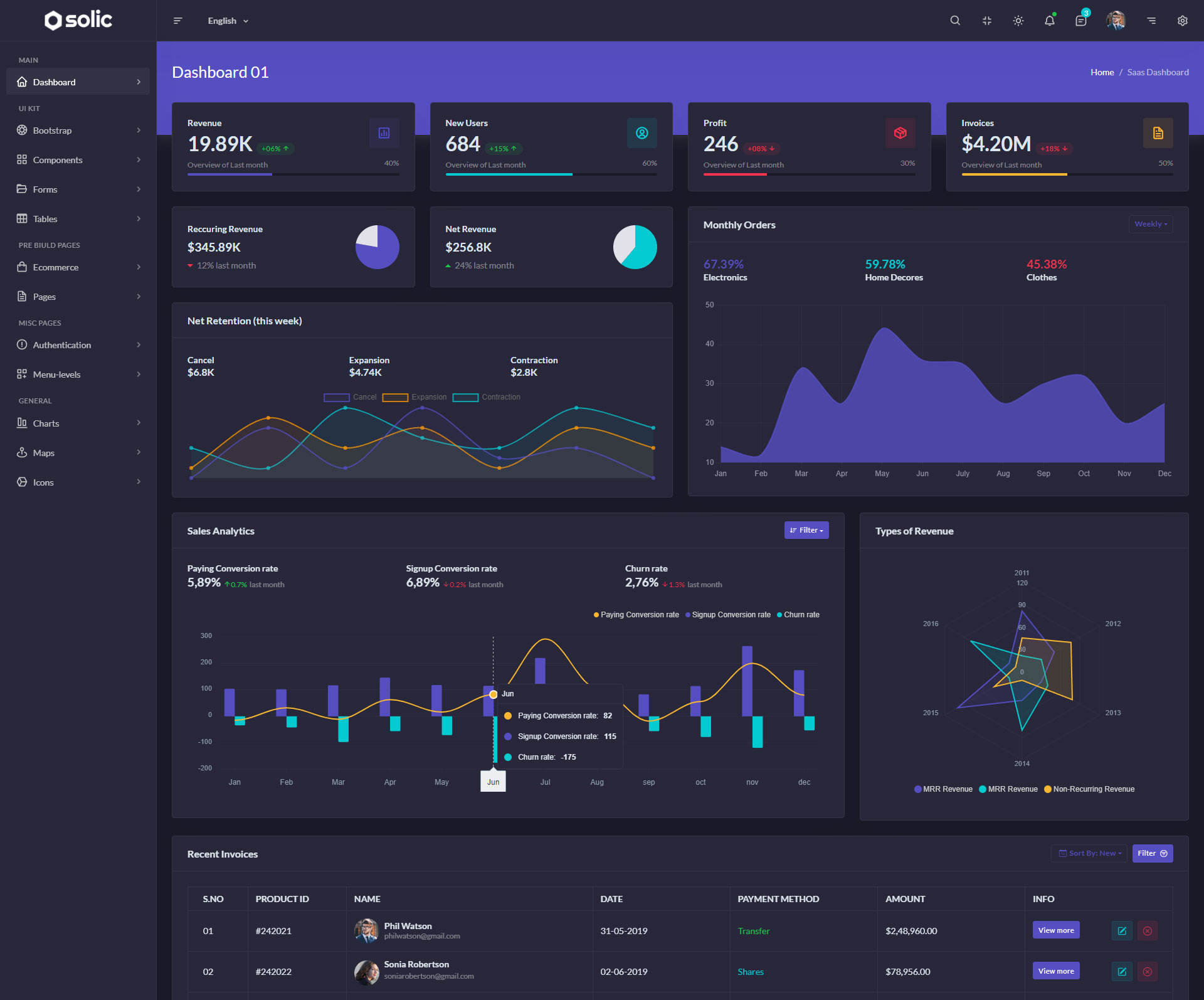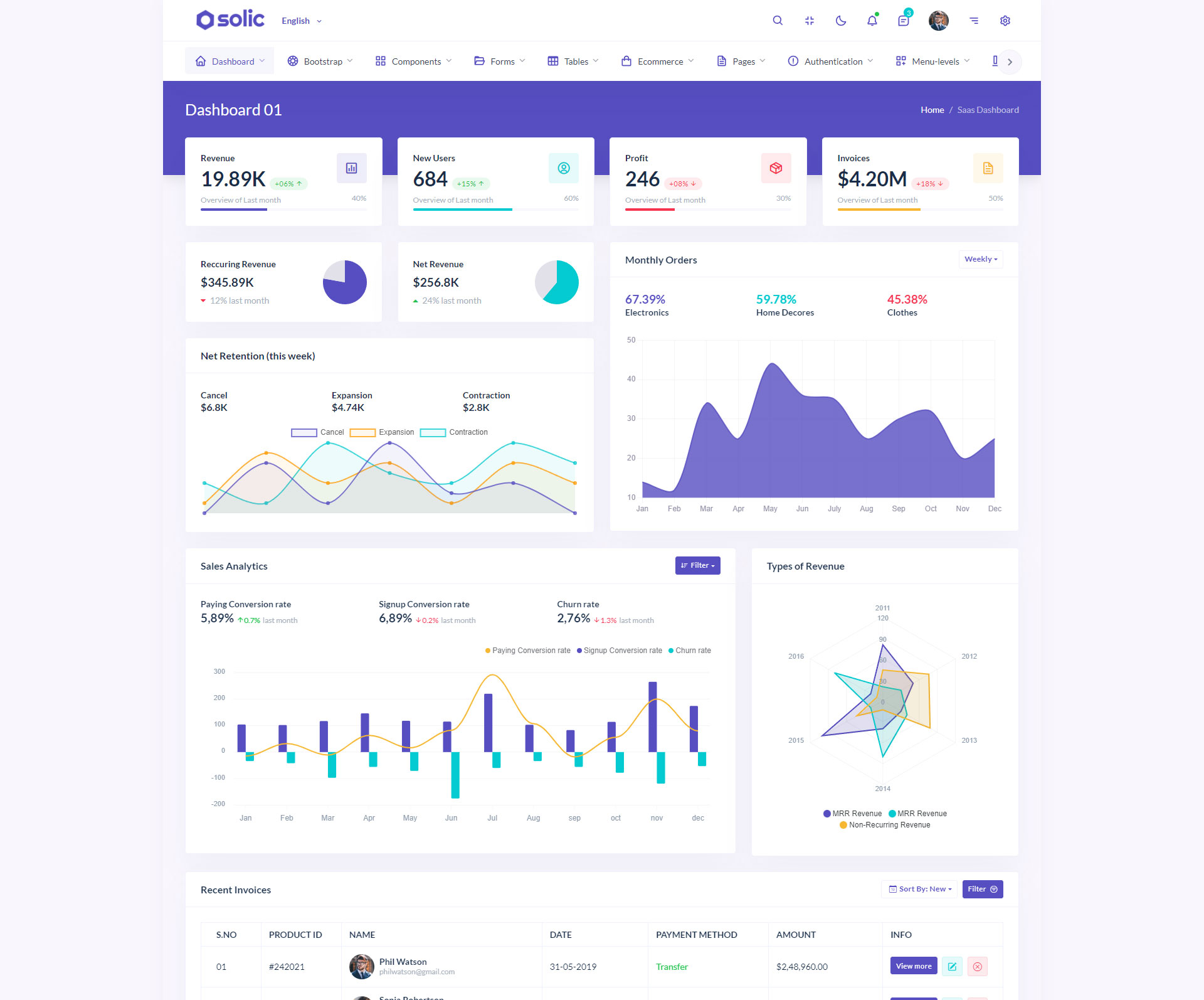 Solic Django admin template comes with of ready to use feature. It has lots of premade functionality which completely ready for any projects.