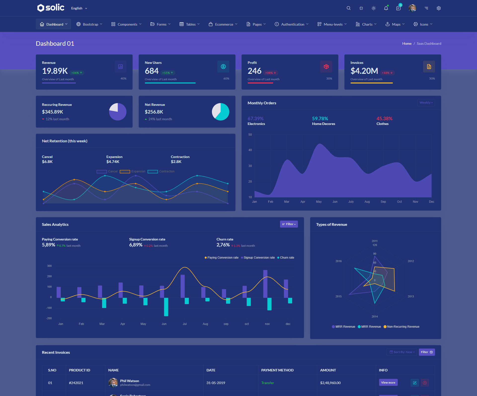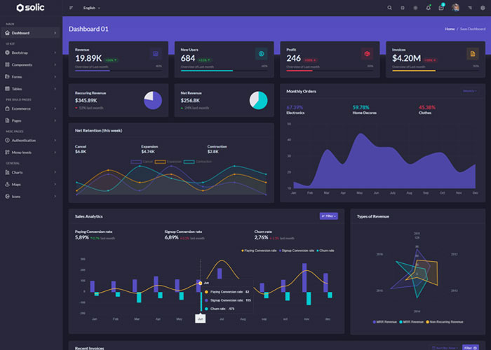 All Solic Django Admin template layouts are designed to appear seamlessly on any device. Solic Admin template admin template is fully responsive, built with the Bootstrap framework