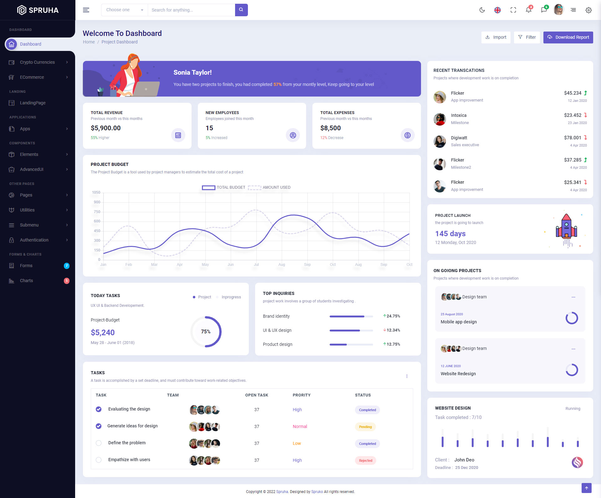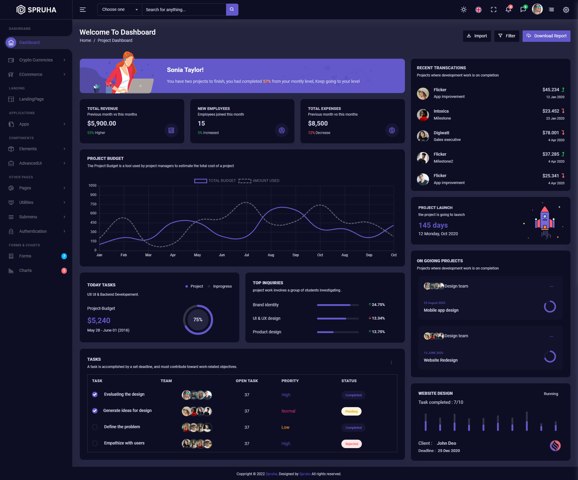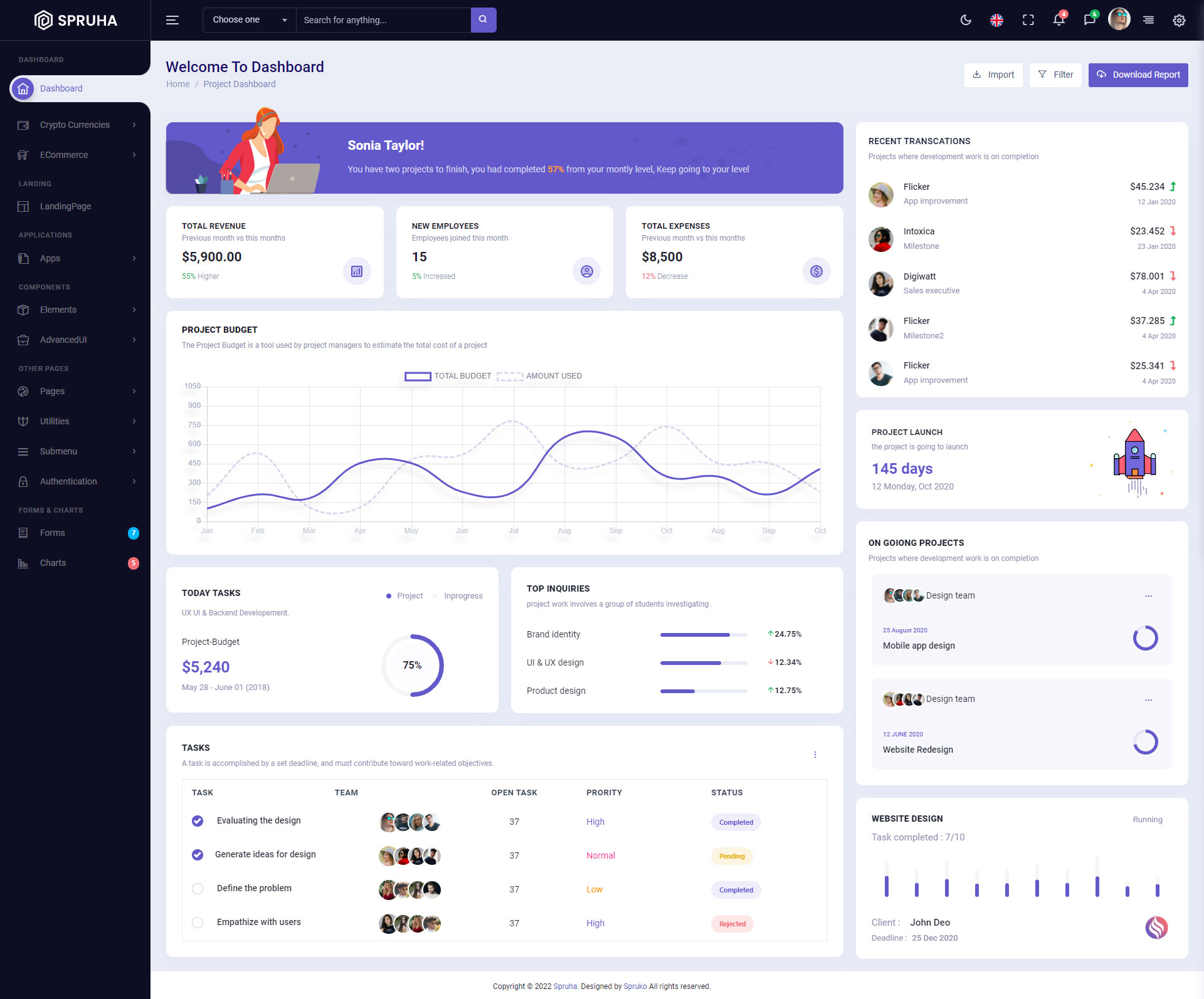 Spruha - Django Premium Bootstrap 5 Admin & Dashboard Template boasts essential features such as design quality, compatibility with your front-end framework, responsiveness, ease of customization, comprehensive documentation, and dedicated support. Additionally, it includes integrated plugins and other supplementary features.