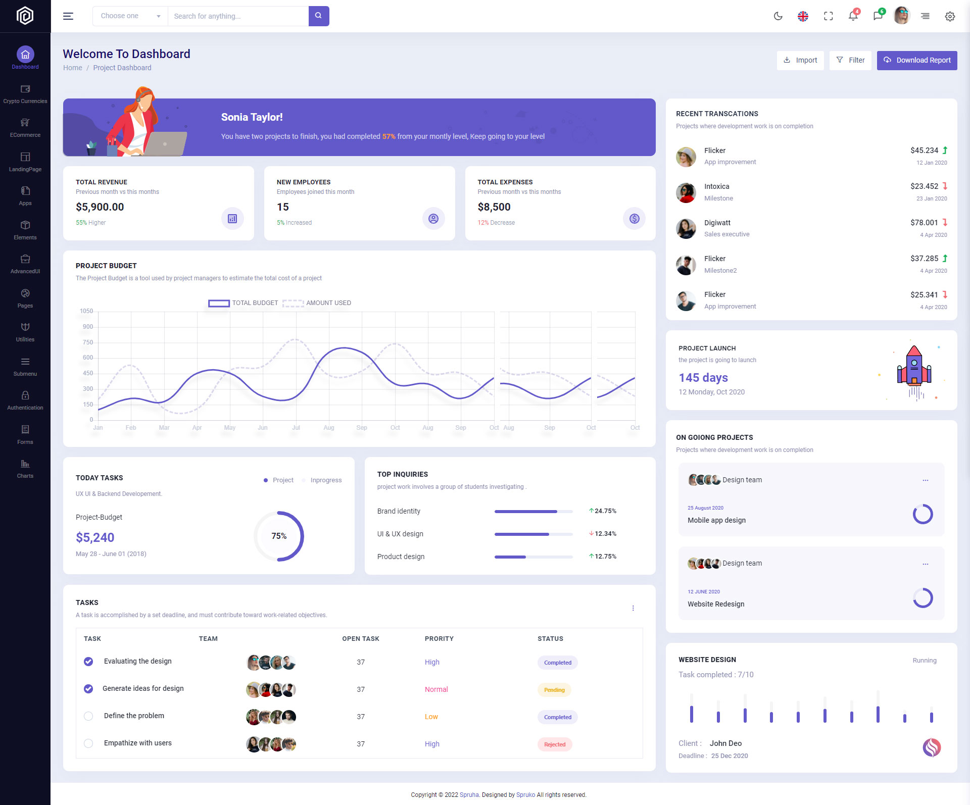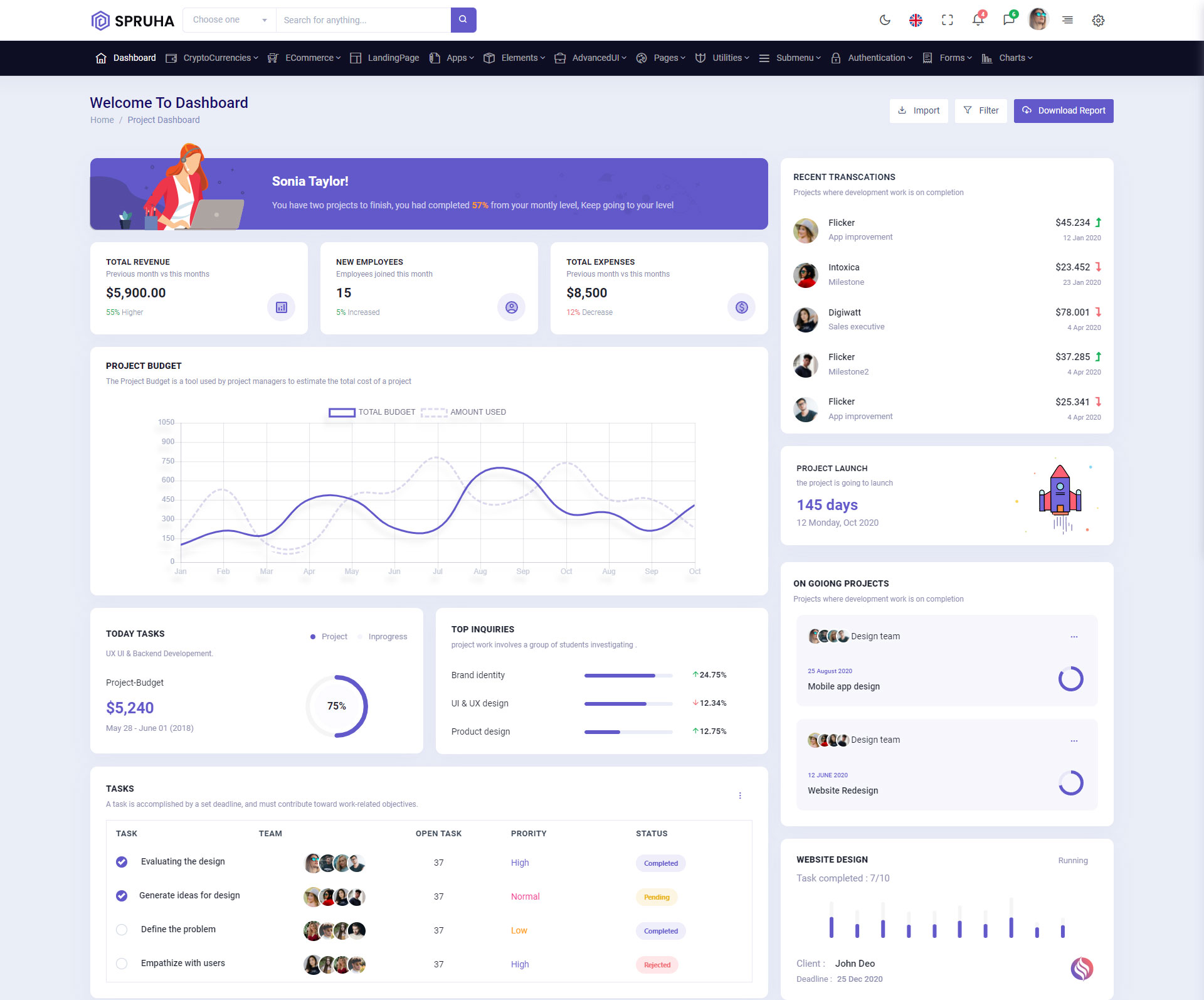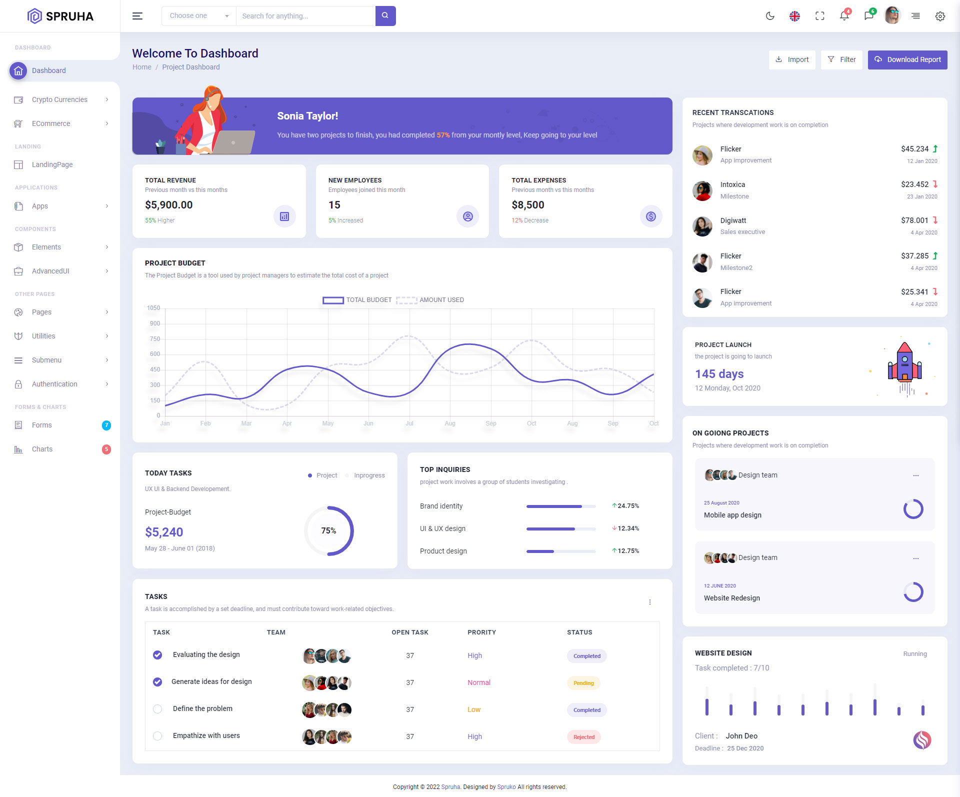 Spruha - Django Premium Bootstrap 5 Admin & Dashboard Template boasts essential features such as design quality, compatibility with your front-end framework, responsiveness, ease of customization, comprehensive documentation, and dedicated support. Additionally, it includes integrated plugins and other supplementary features.