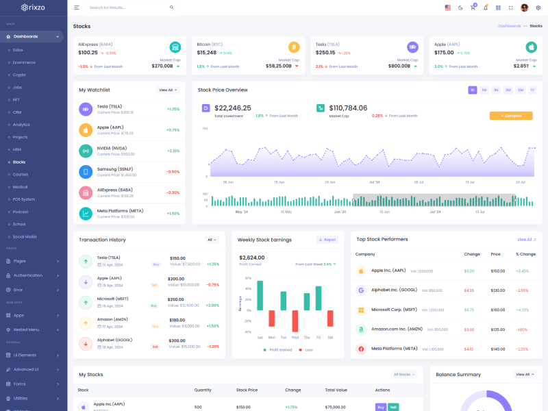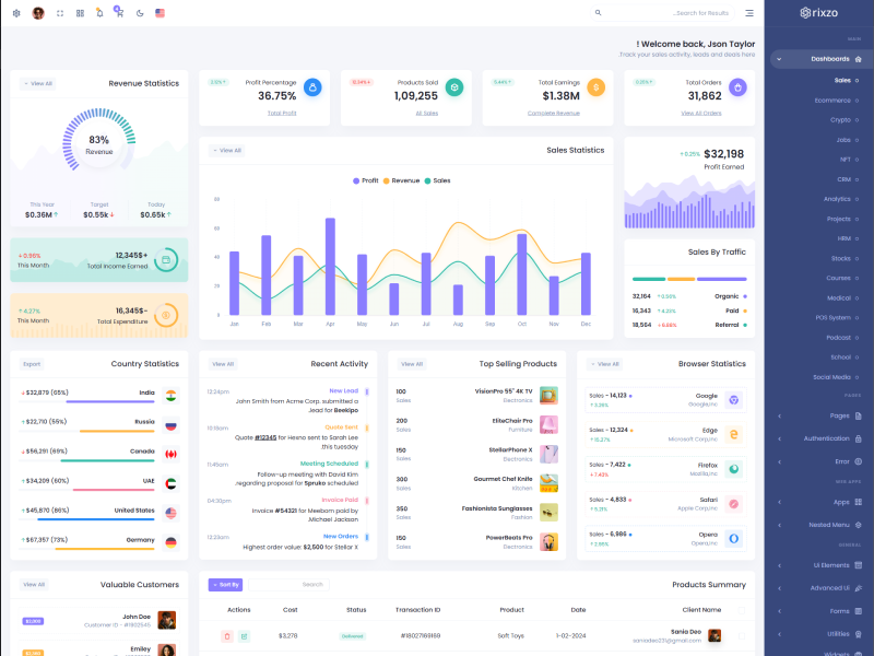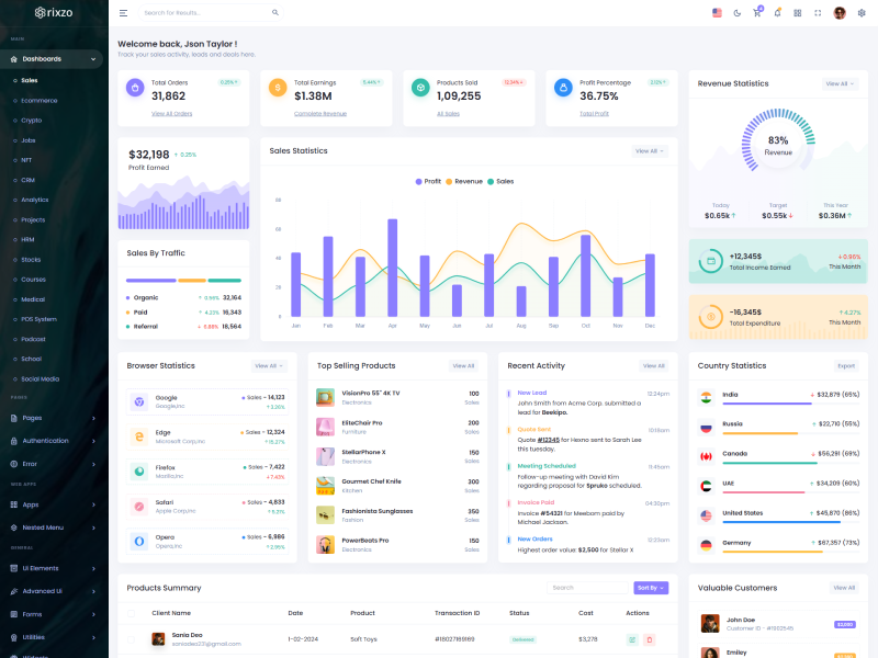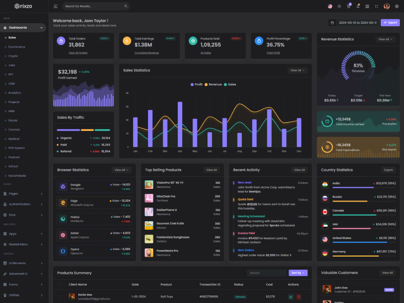 Rixzo - Flask Premium Bootstrap 5 Admin & Dashboard Template boasts essential features such as design quality, compatibility with your front-end framework, responsiveness, ease of customization, comprehensive documentation, and dedicated support. Additionally, it includes integrated plugins and other supplementary features.