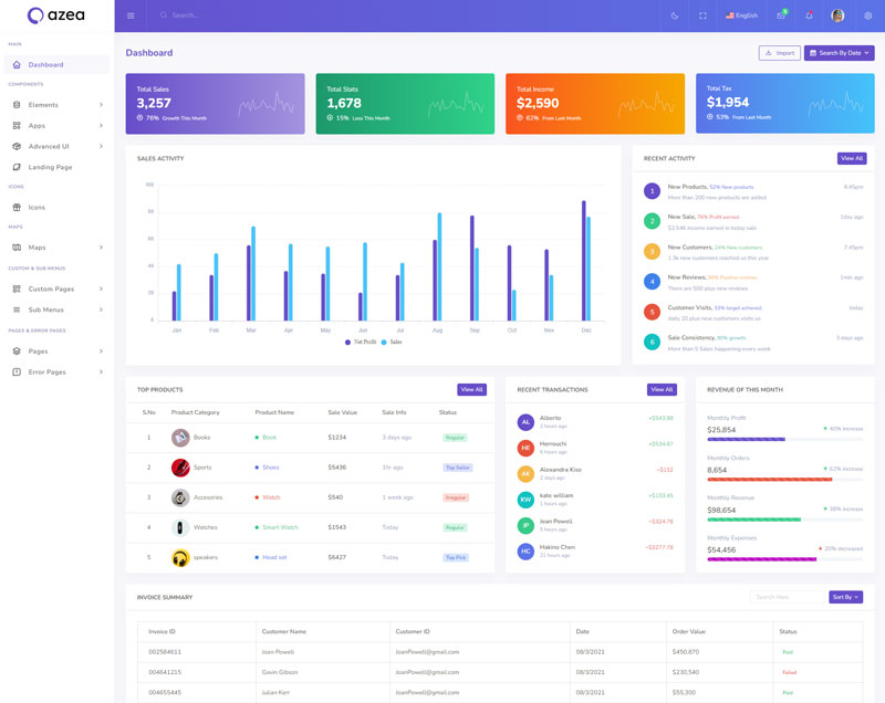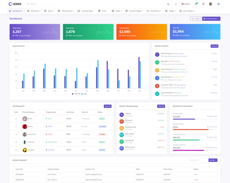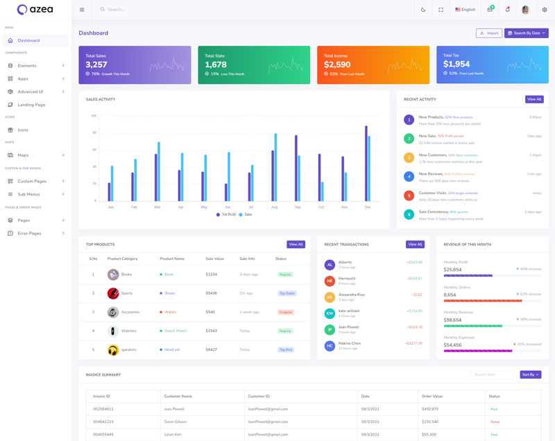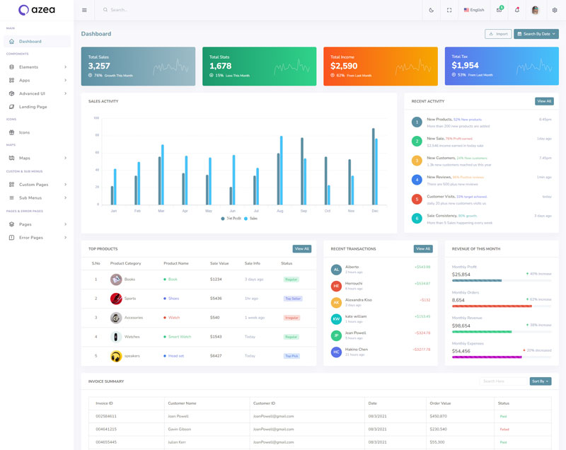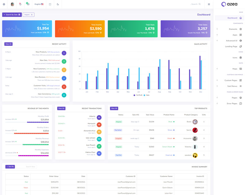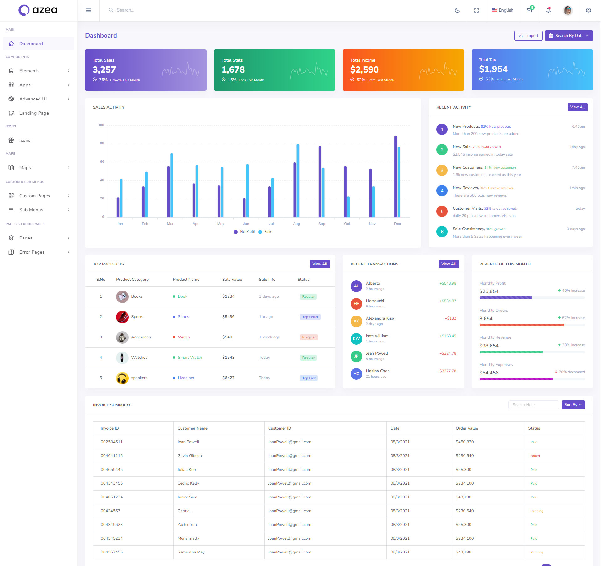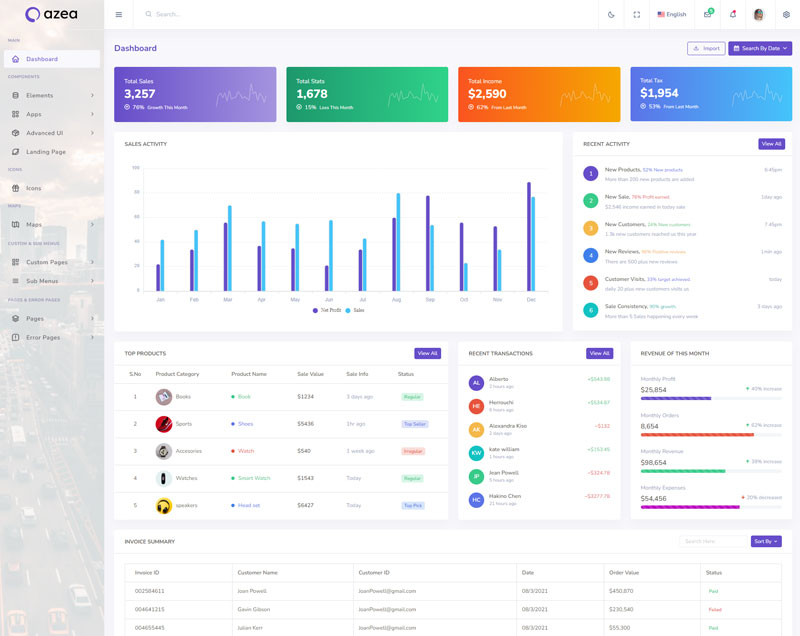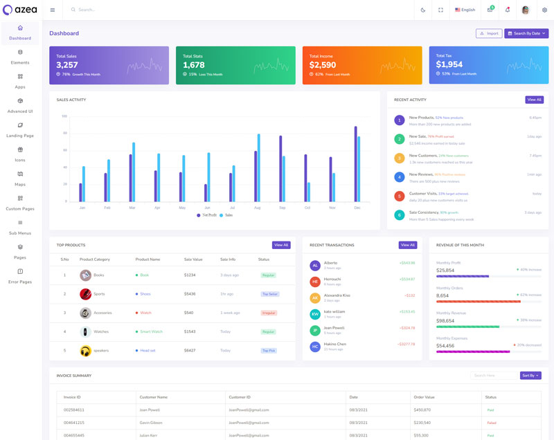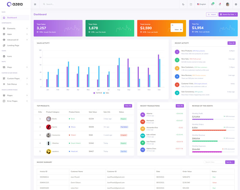 Explore the latest trending features incorporated into the Azea Admin template, showcasing how we have enhanced and designed our template. When it comes to design, we always keep a close watch on the most trending features.
