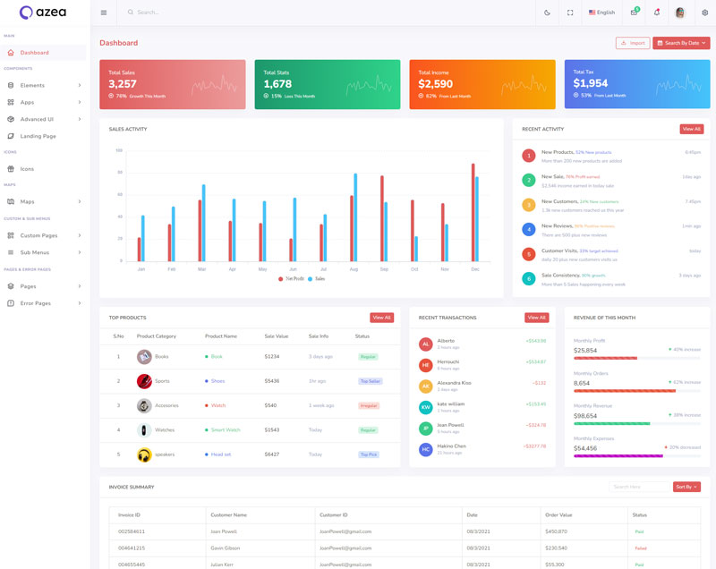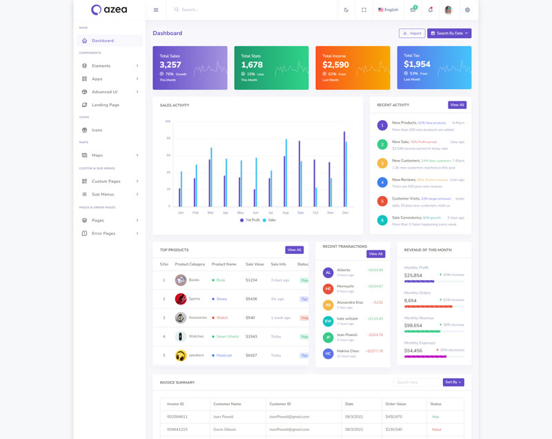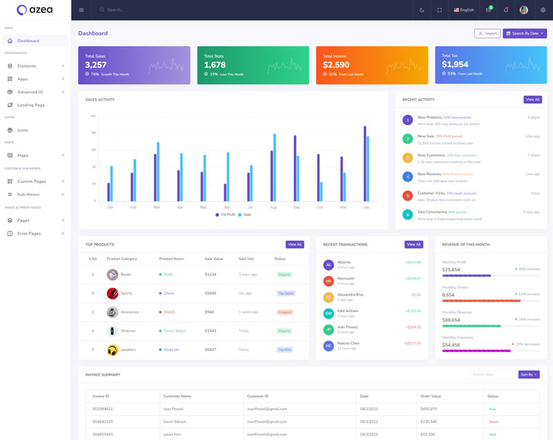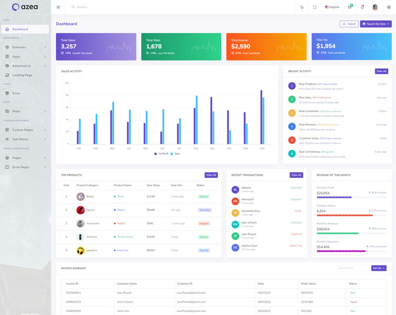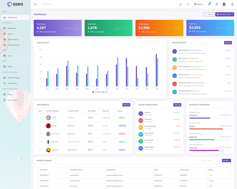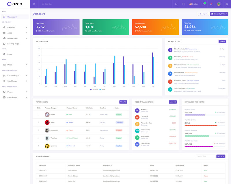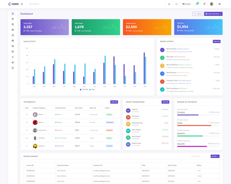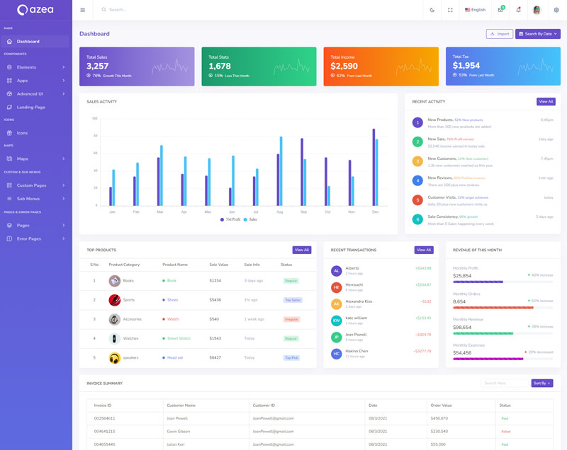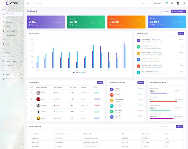 Explore the latest trending features incorporated into the Azea Admin template, showcasing how we have enhanced and designed our template. When it comes to design, we always keep a close watch on the most trending features.