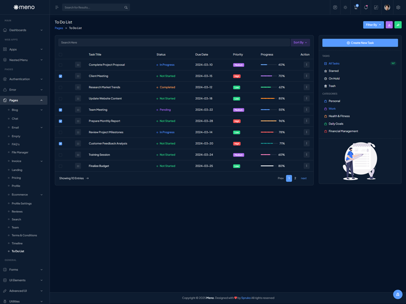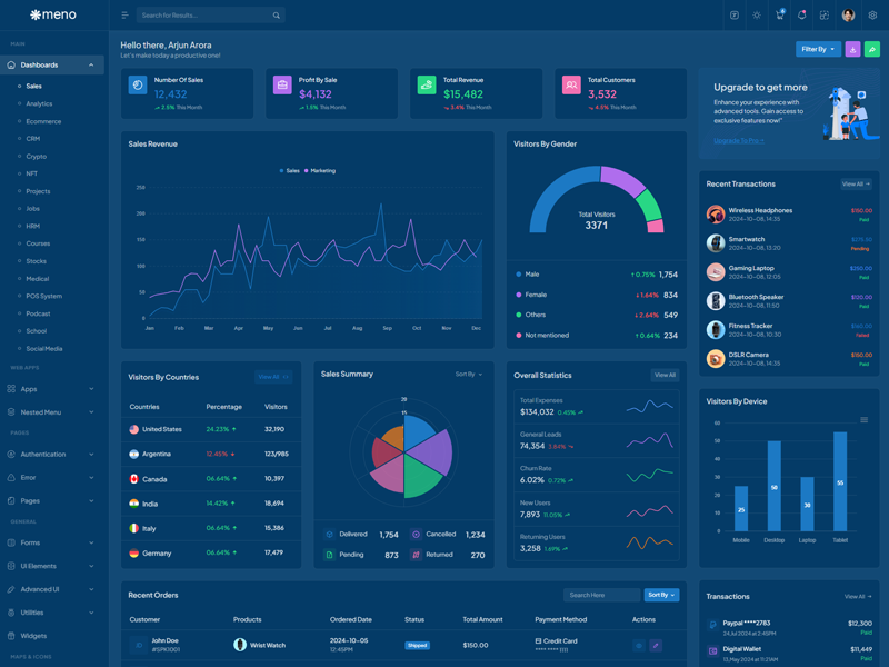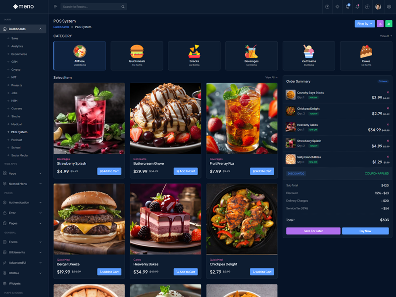 Meno - Premium Bootstrap 5 HTML 5 Admin & Dashboard Template boasts essential features such as design quality, compatibility with your front-end framework, responsiveness, ease of customization, comprehensive documentation, and dedicated support. Additionally, it includes integrated plugins and other supplementary features.
