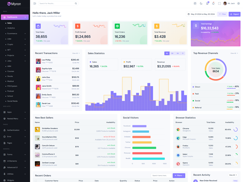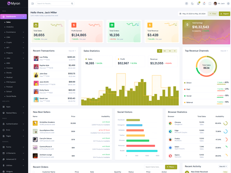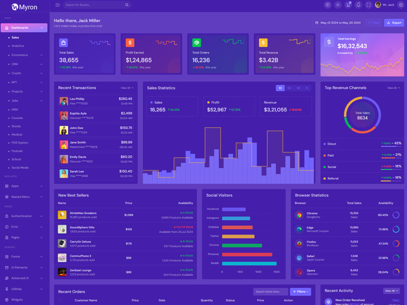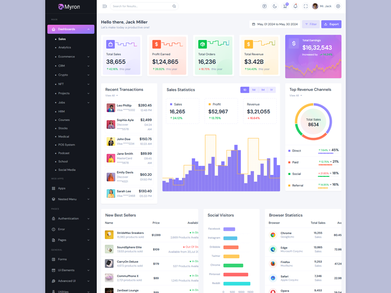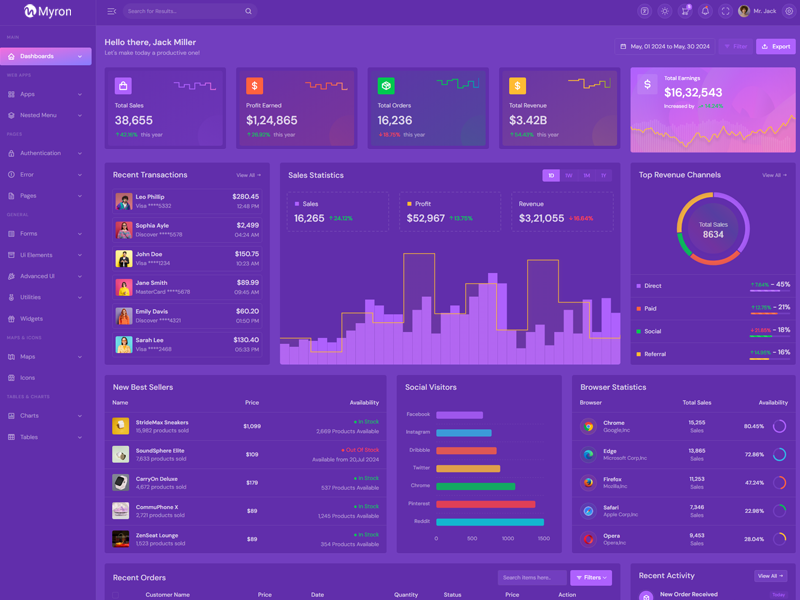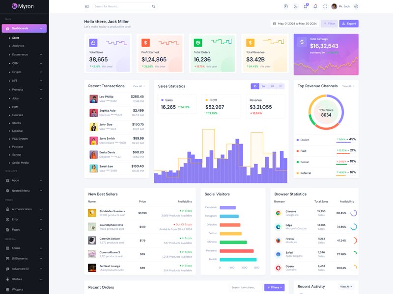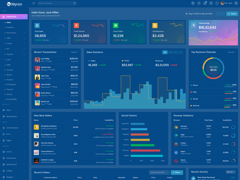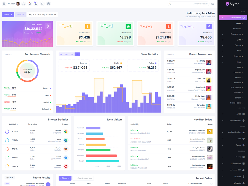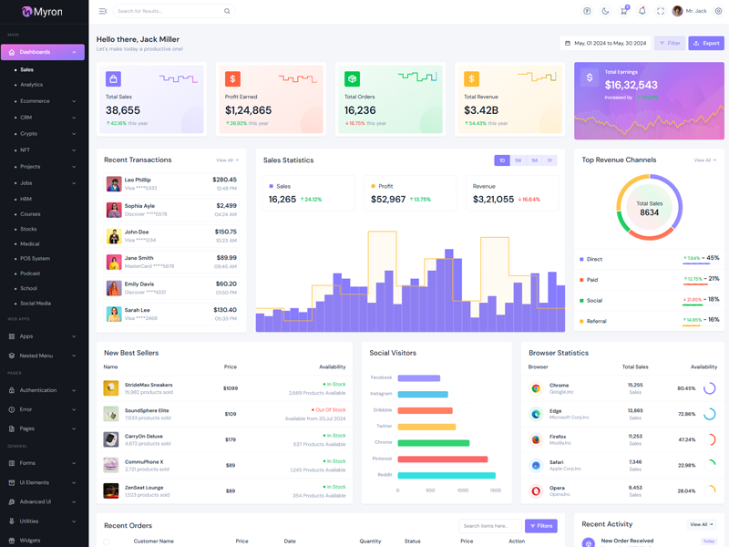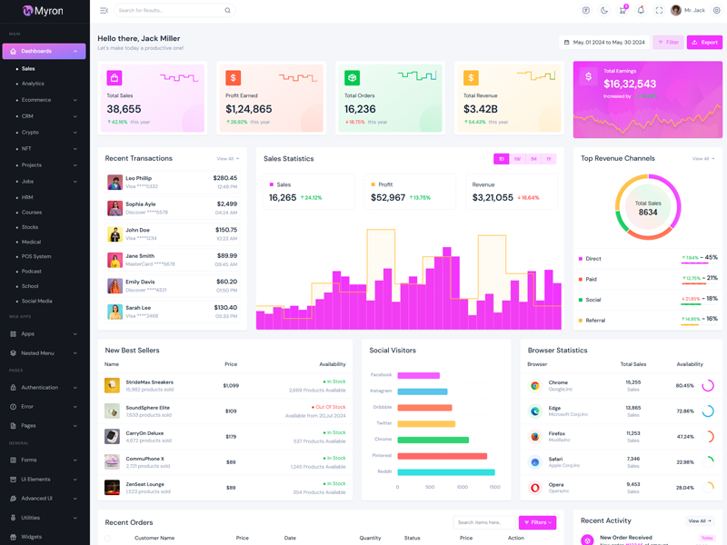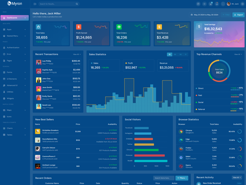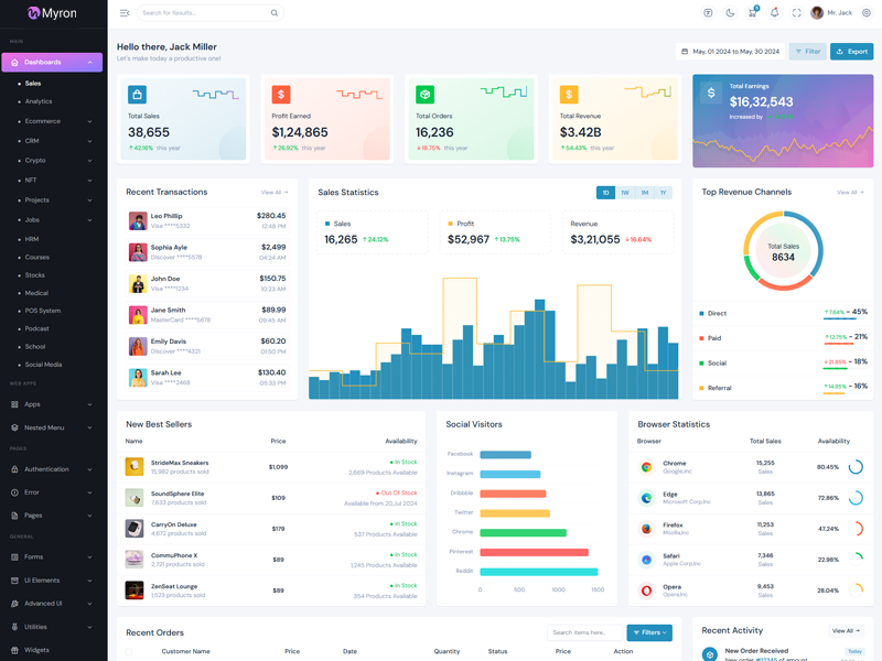 Myron – Innovative Boostrap Admin Dashboard Template offers top-tier design, seamless framework compatibility, full responsiveness, and easy customization. With beginner-friendly docs, dedicated support, and integrated plugins, Myron provides a powerful foundation for modern applications.