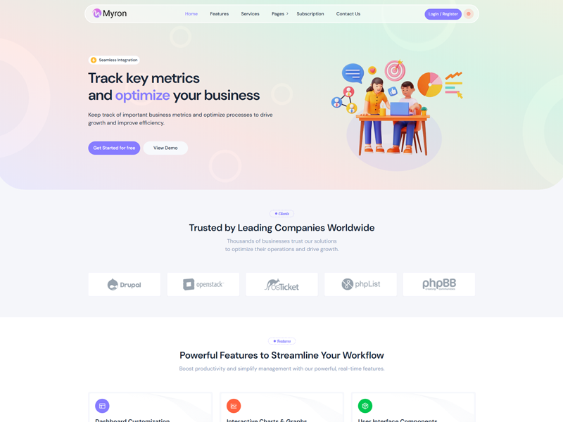 Myron offers 16 visually appealing dashboards with multiple themes for easy personalization, combining advanced features and a user-friendly interface for seamless customization.