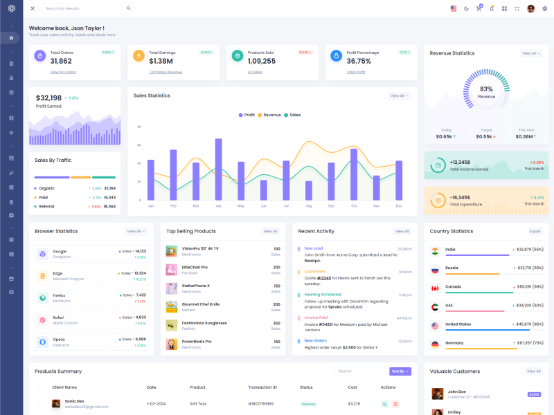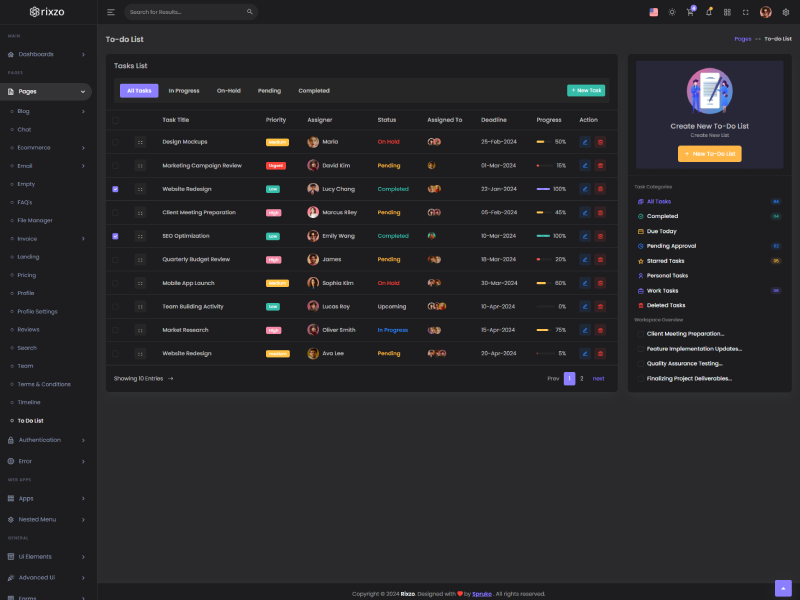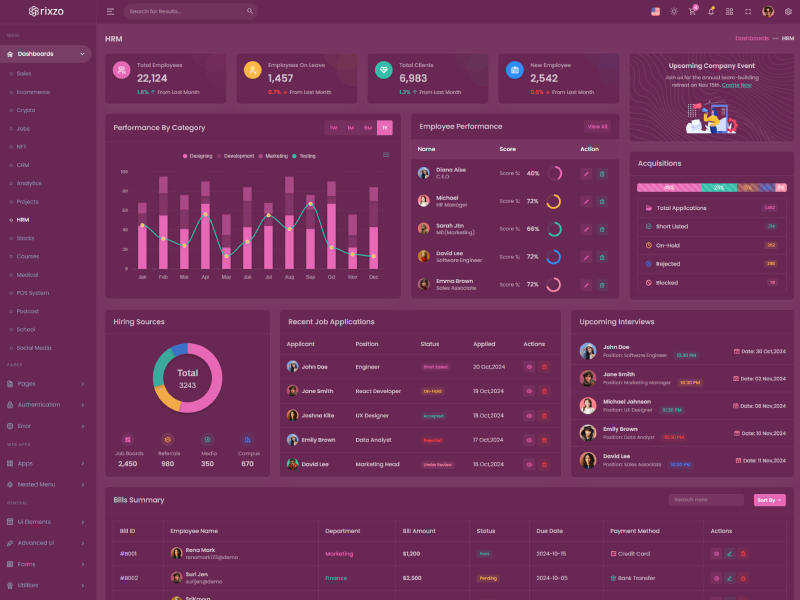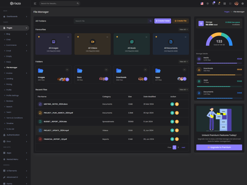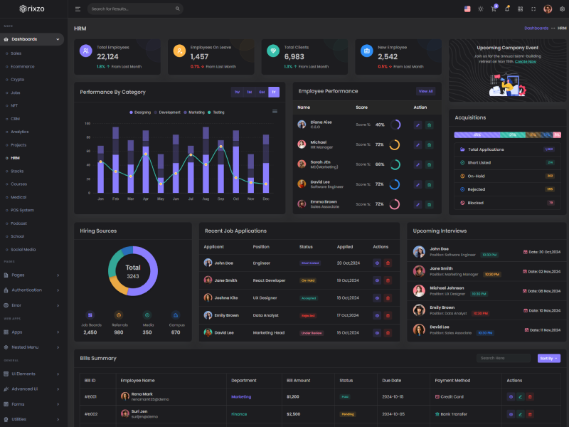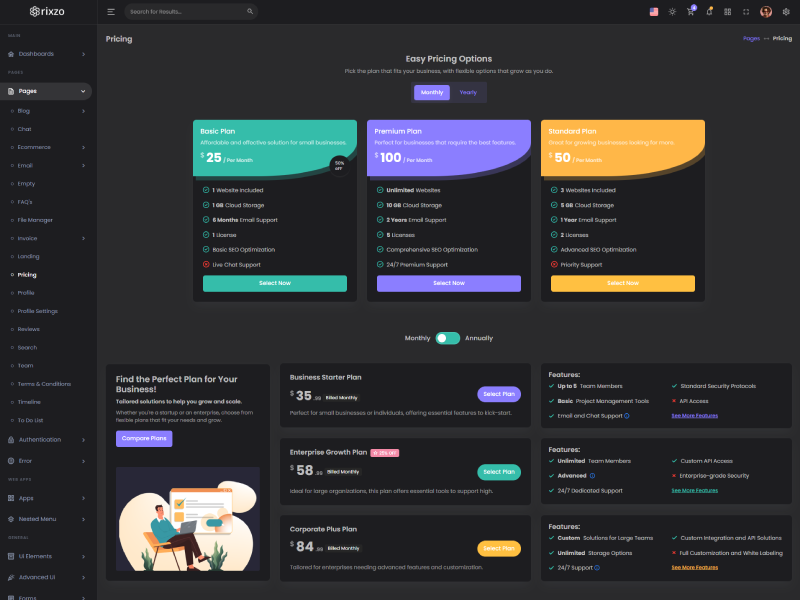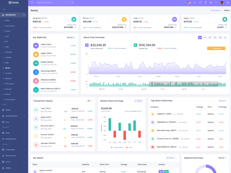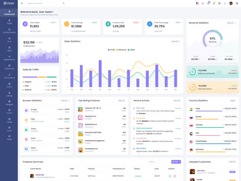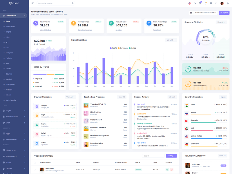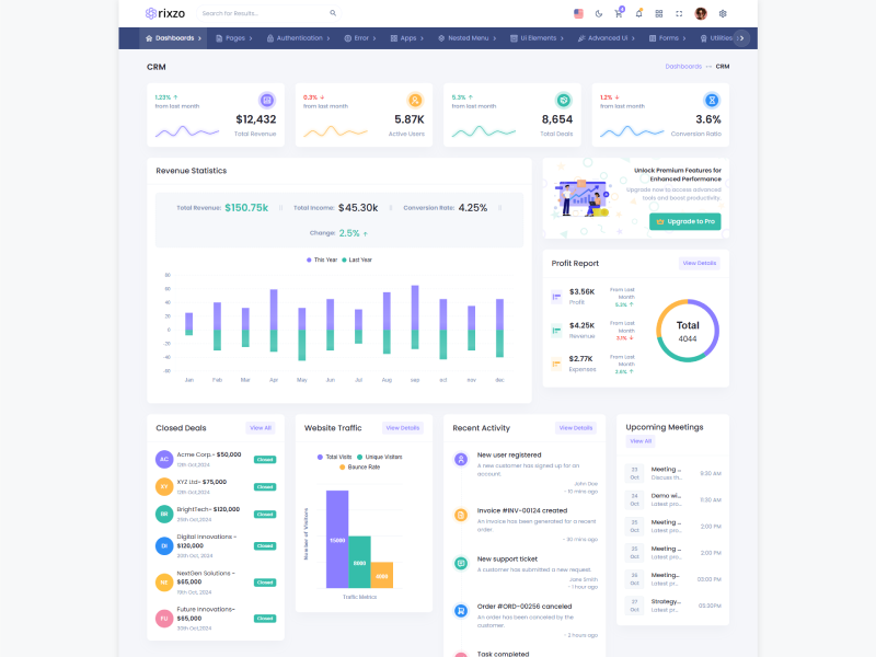 Rixzo - Premium Bootstrap 5 HTML 5 Admin & Dashboard Template boasts essential features such as design quality, compatibility with your front-end framework, responsiveness, ease of customization, comprehensive documentation, and dedicated support. Additionally, it includes integrated plugins and other supplementary features.