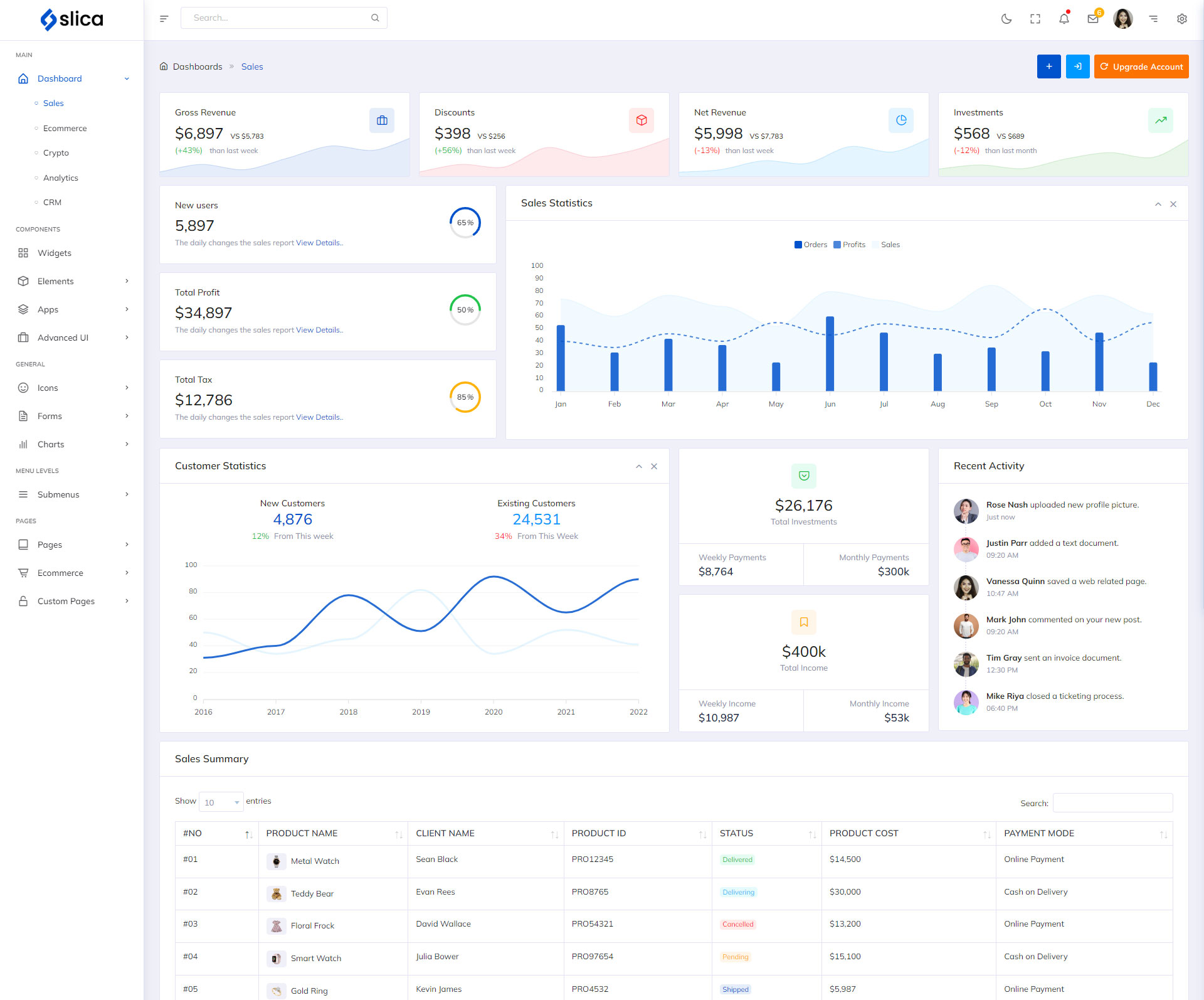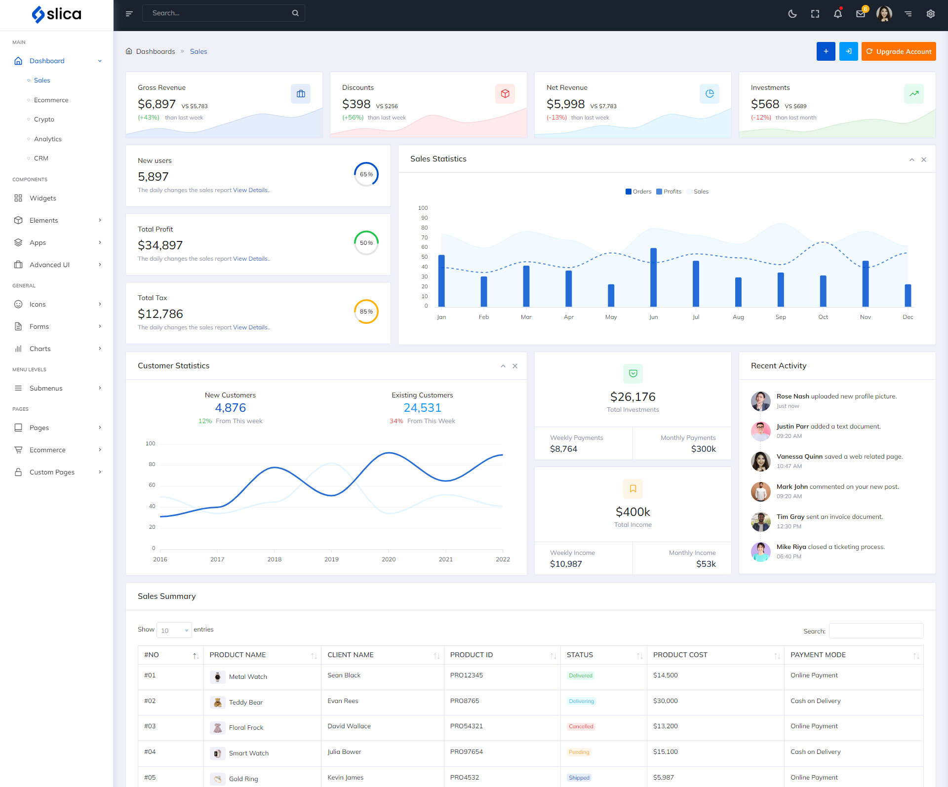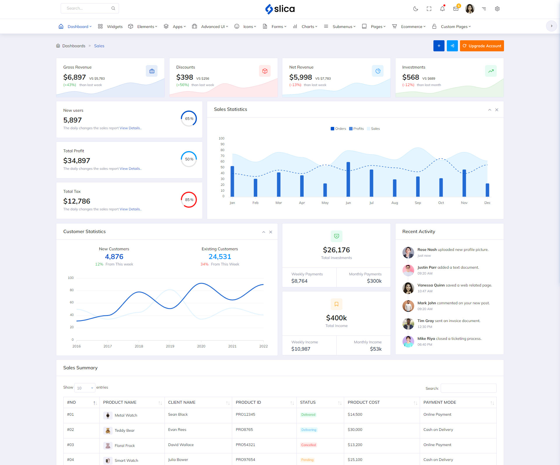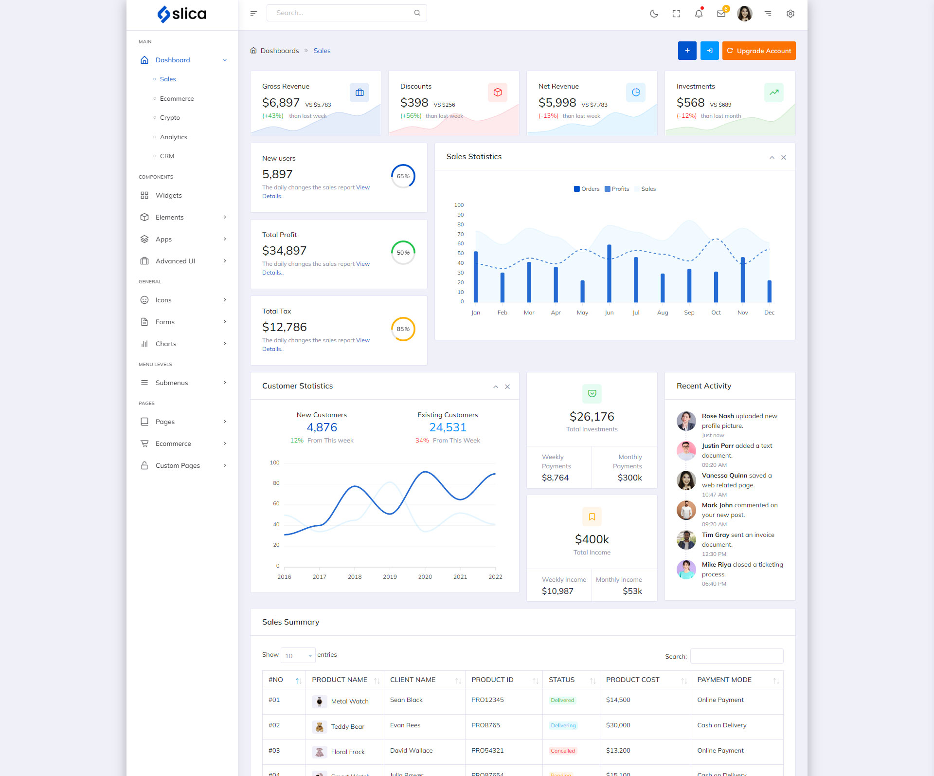 Slica - Premium Bootstrap 5 HTML 5 Admin & Dashboard Template boasts essential features such as design quality, compatibility with your front-end framework, responsiveness, ease of customization, comprehensive documentation, and dedicated support. Additionally, it includes integrated plugins and other supplementary features.