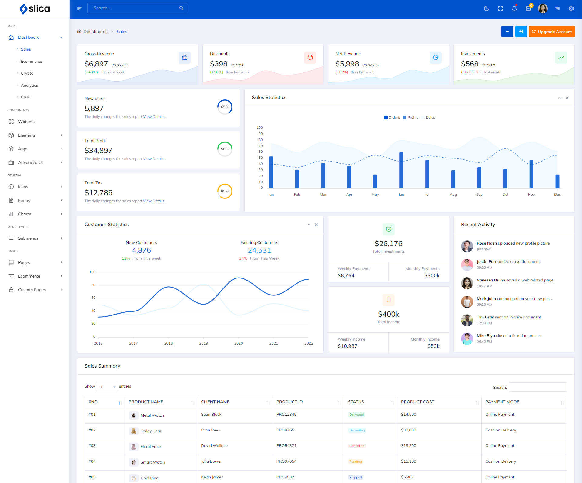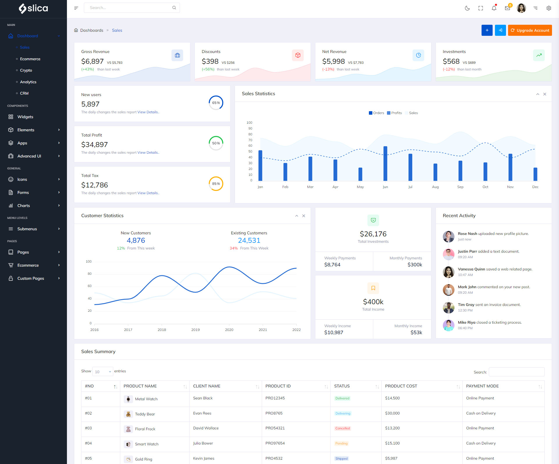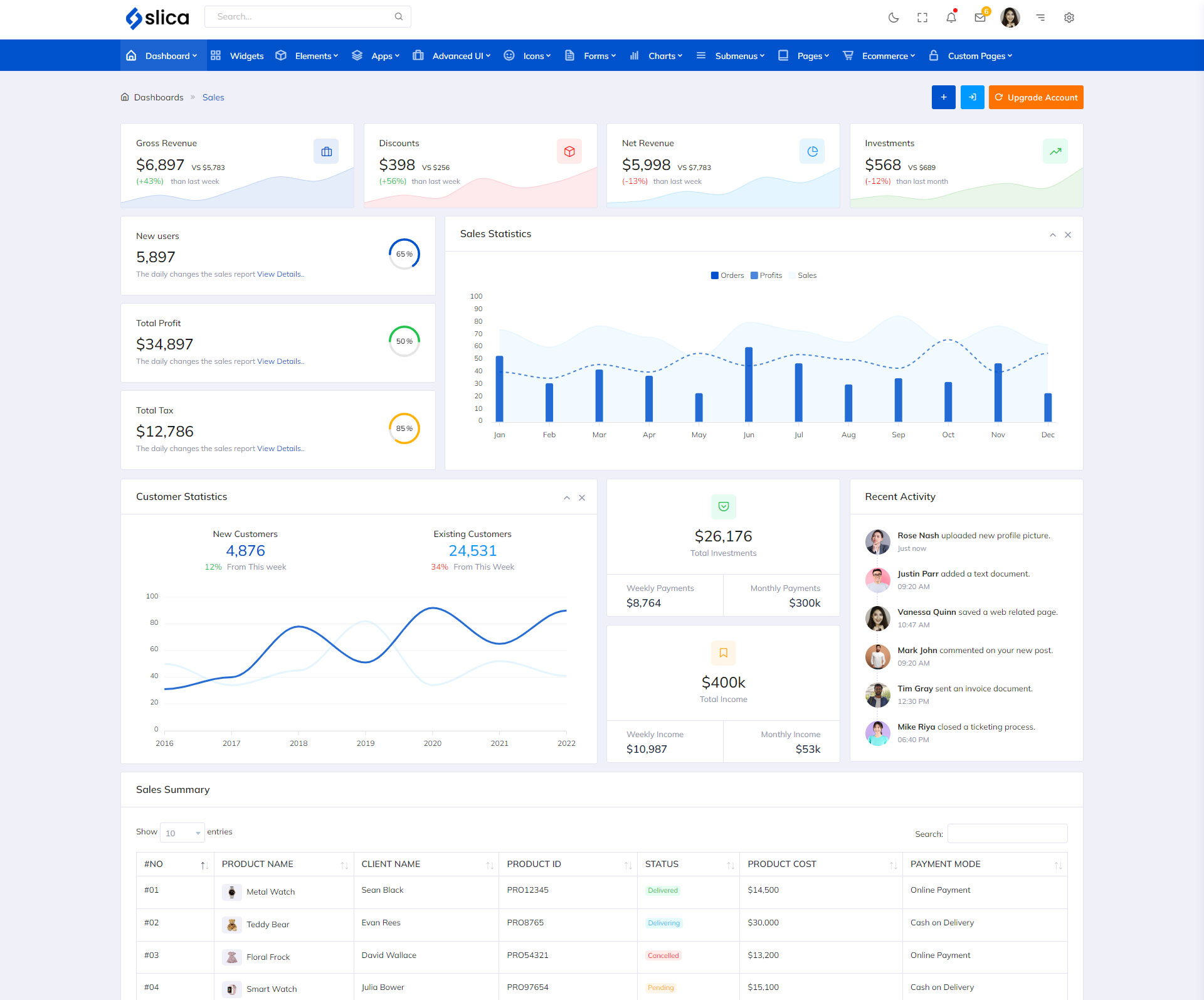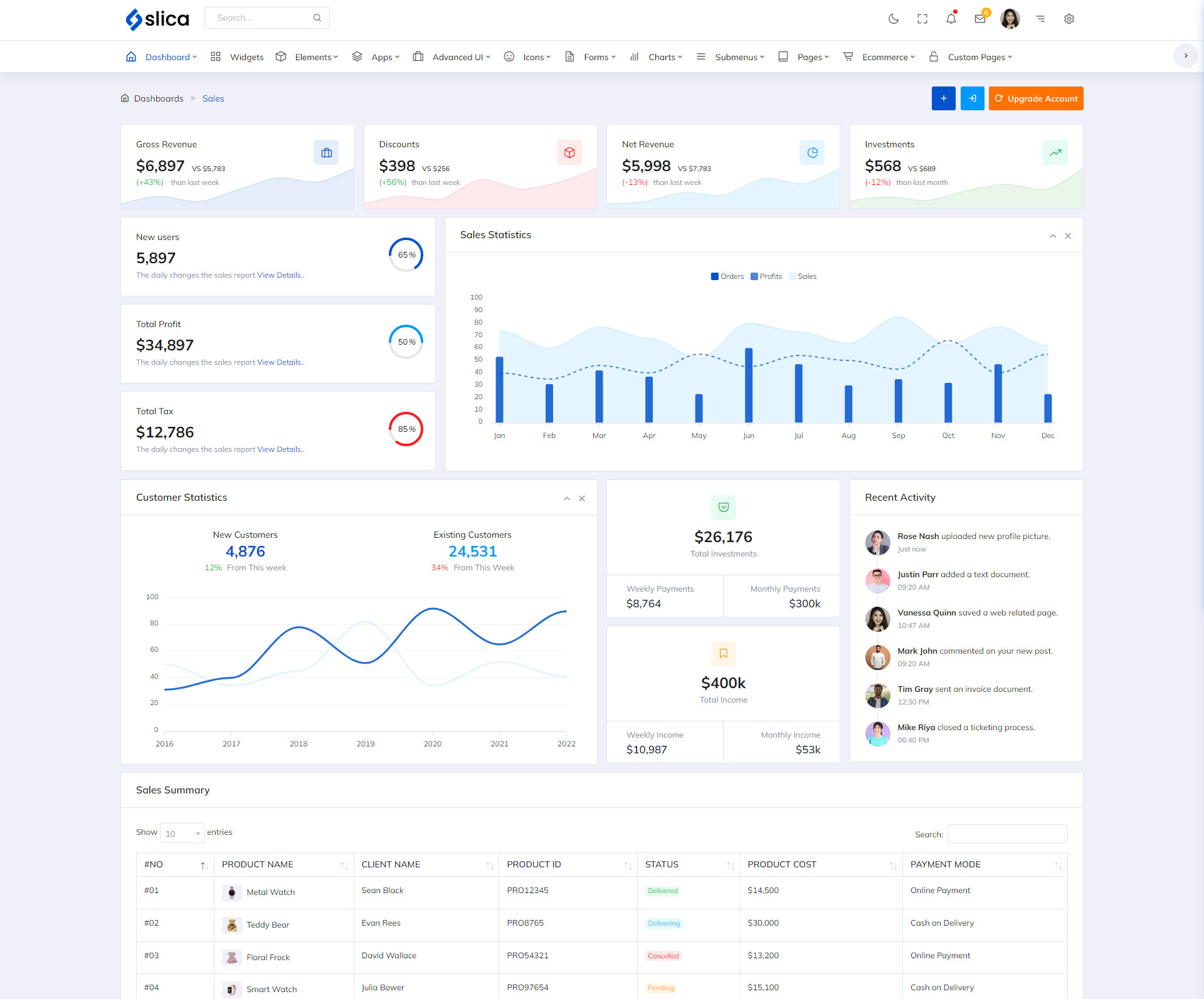 Slica - Premium Bootstrap 5 HTML 5 Admin & Dashboard Template boasts essential features such as design quality, compatibility with your front-end framework, responsiveness, ease of customization, comprehensive documentation, and dedicated support. Additionally, it includes integrated plugins and other supplementary features.