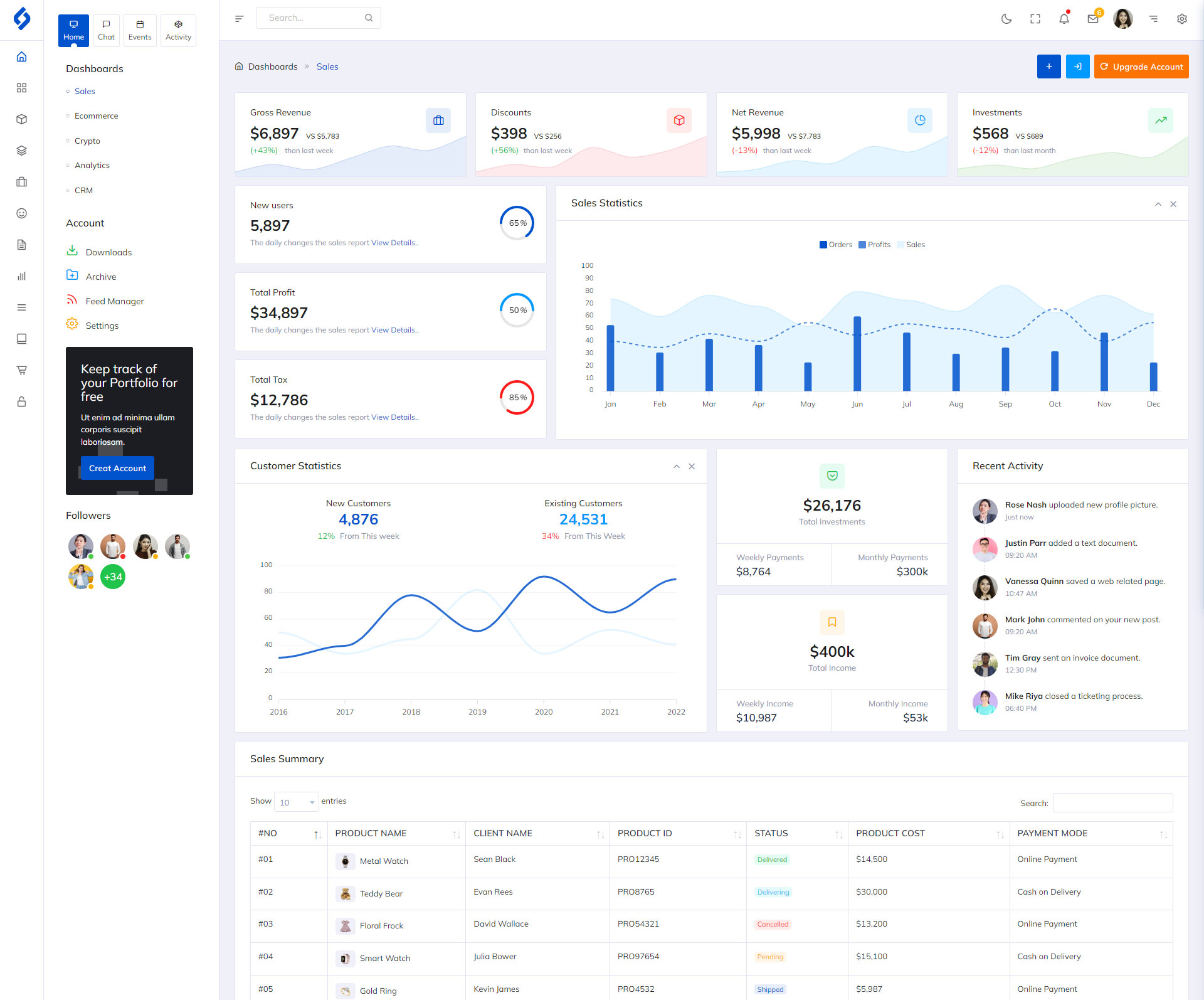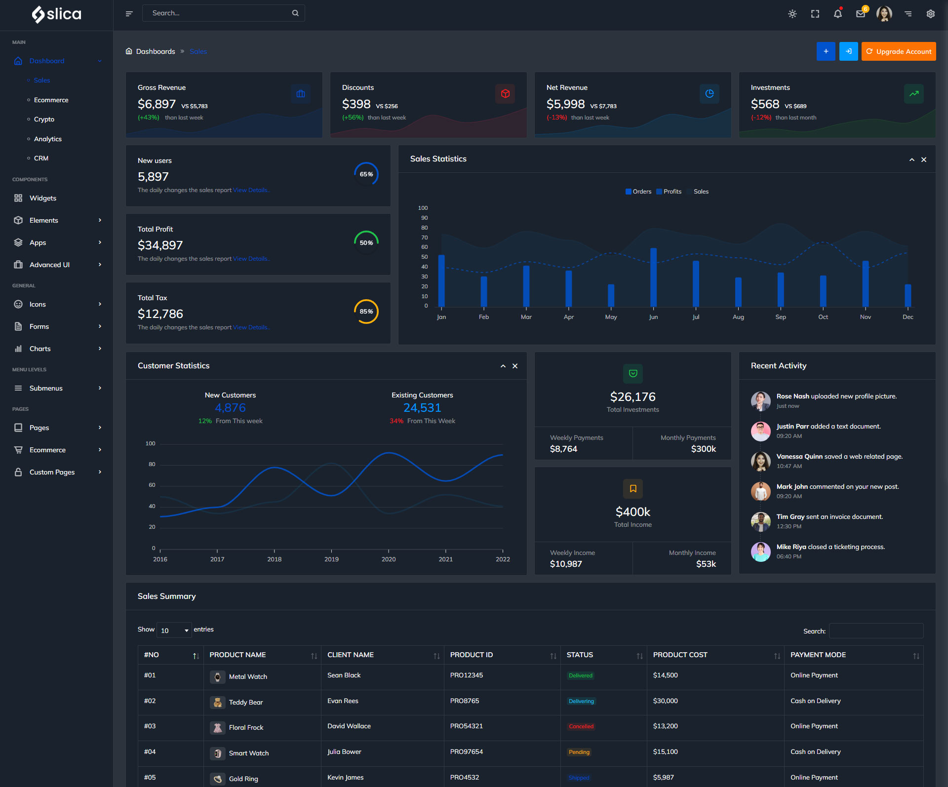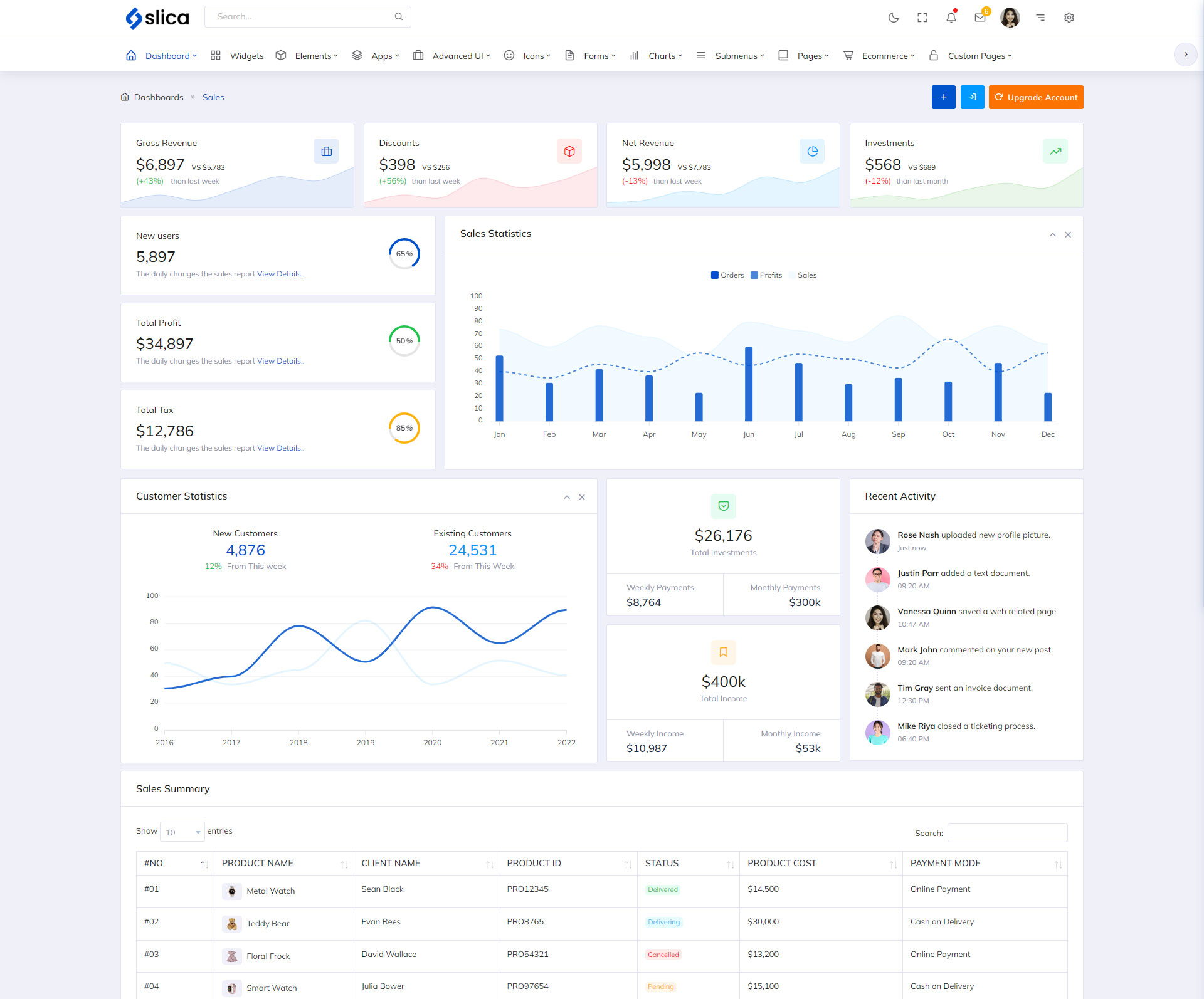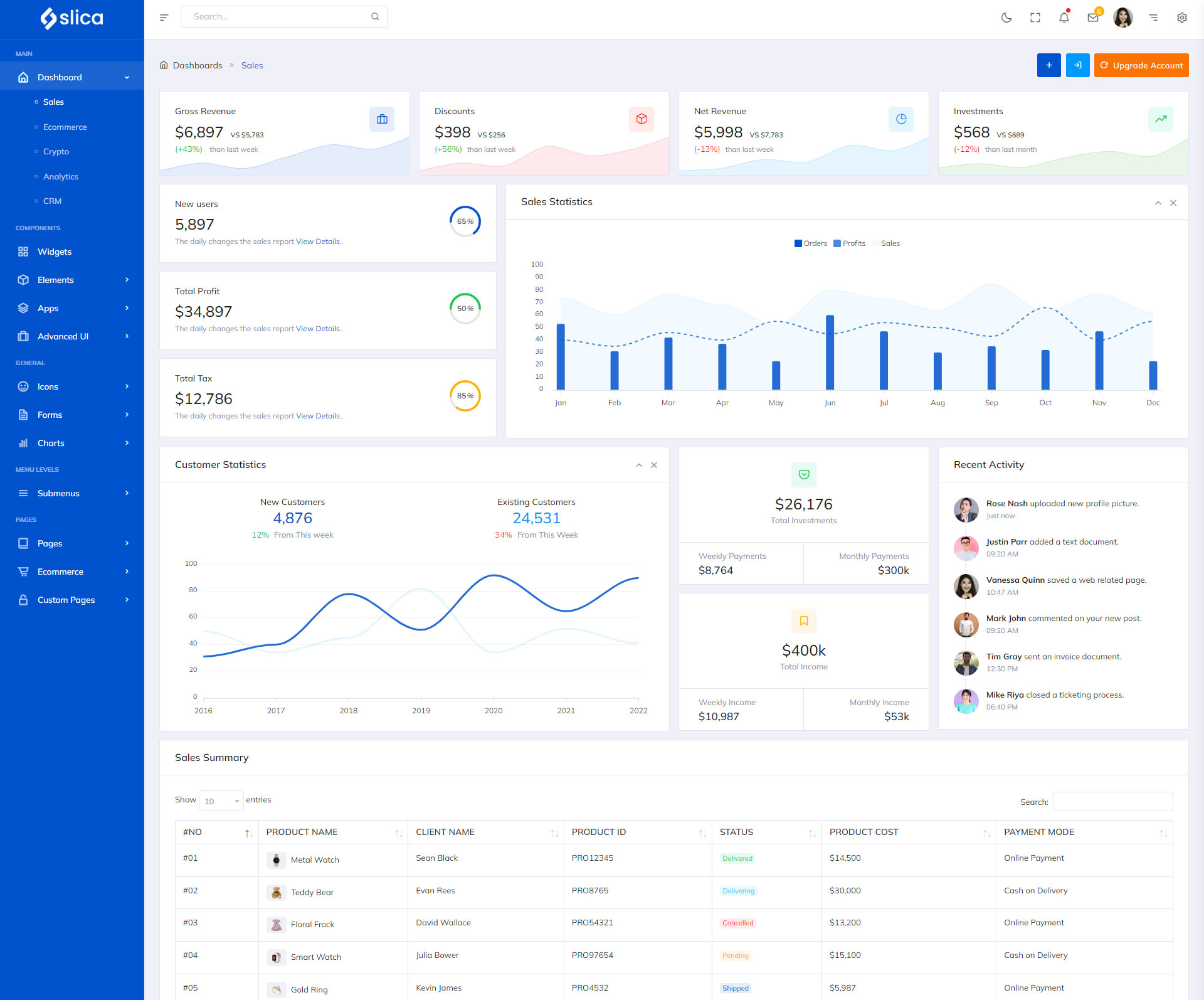 Slica - Premium Bootstrap 5 HTML 5 Admin & Dashboard Template boasts essential features such as design quality, compatibility with your front-end framework, responsiveness, ease of customization, comprehensive documentation, and dedicated support. Additionally, it includes integrated plugins and other supplementary features.