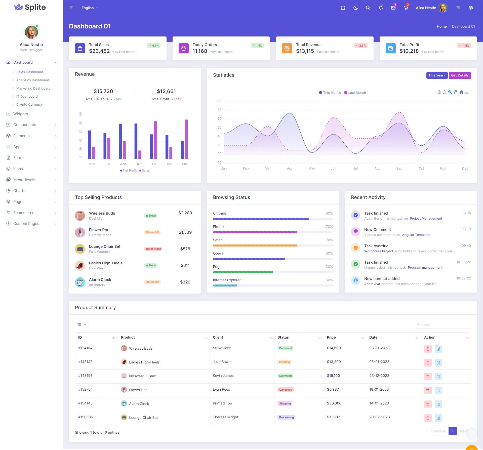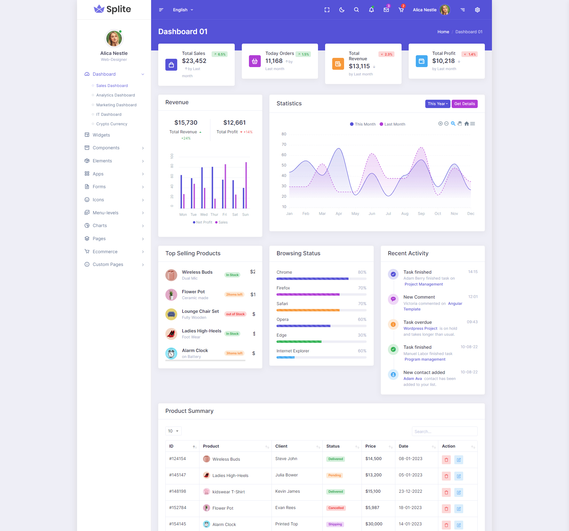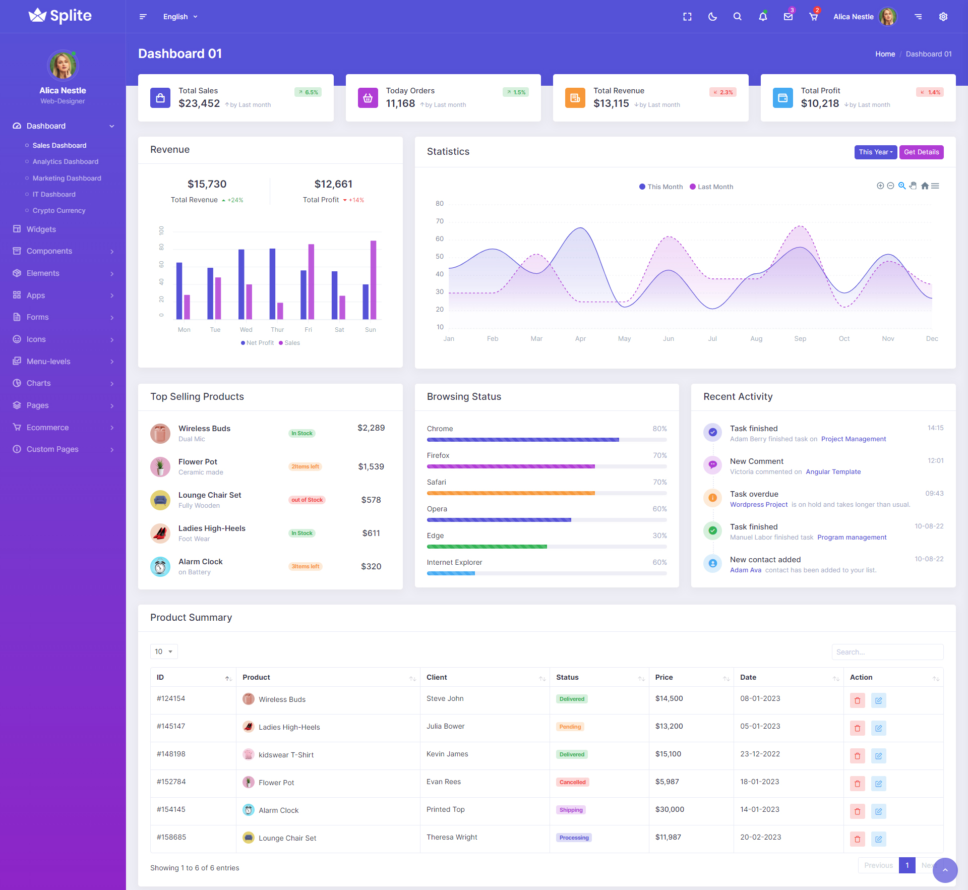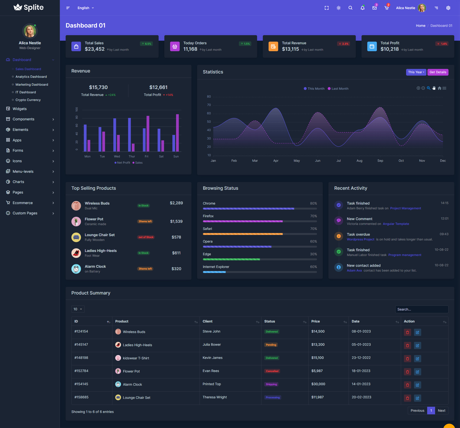 Splite - Premium Bootstrap 5 HTML 5 Admin & Dashboard Template boasts essential features such as design quality, compatibility with your front-end framework, responsiveness, ease of customization, comprehensive documentation, and dedicated support. Additionally, it includes integrated plugins and other supplementary features.