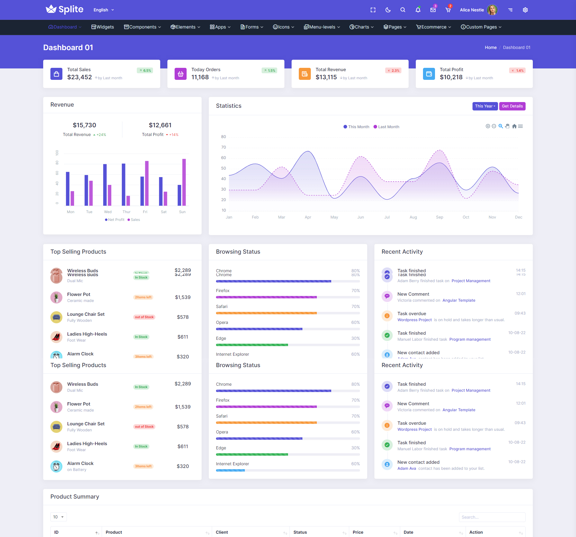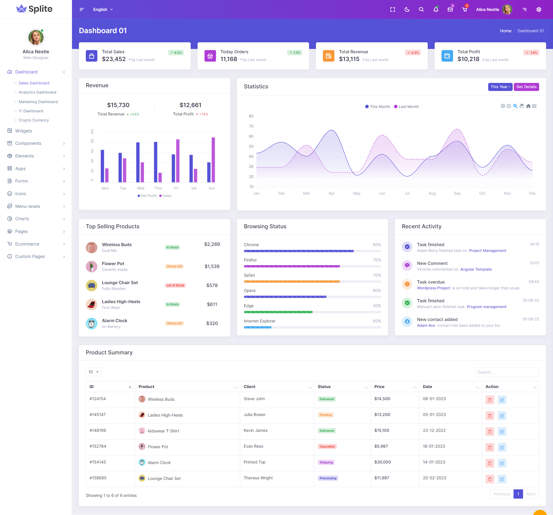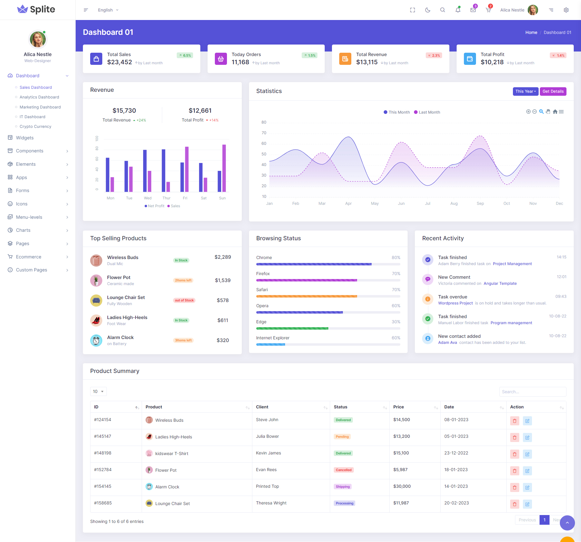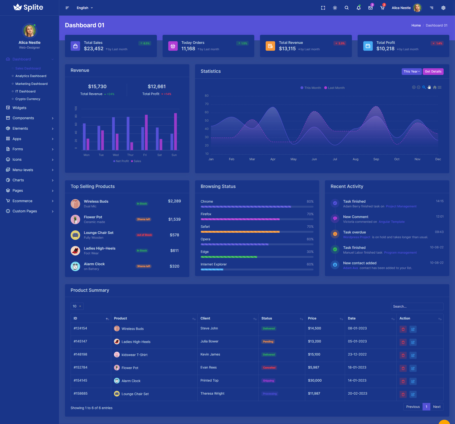 Splite - Premium Bootstrap 5 HTML 5 Admin & Dashboard Template boasts essential features such as design quality, compatibility with your front-end framework, responsiveness, ease of customization, comprehensive documentation, and dedicated support. Additionally, it includes integrated plugins and other supplementary features.