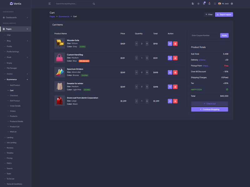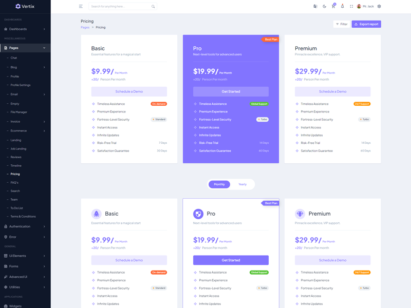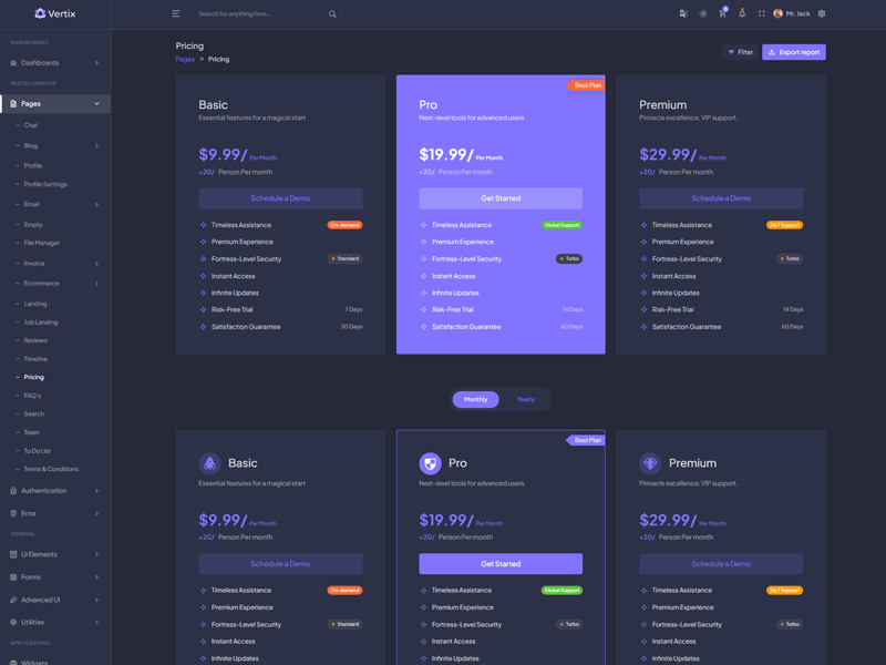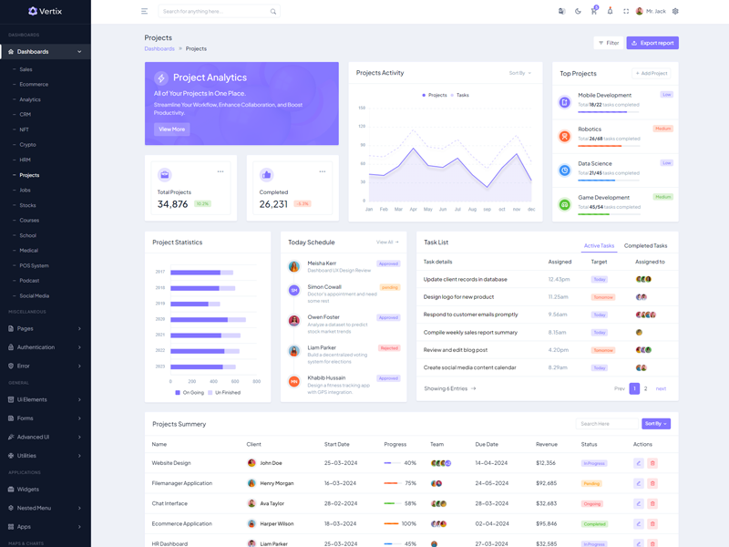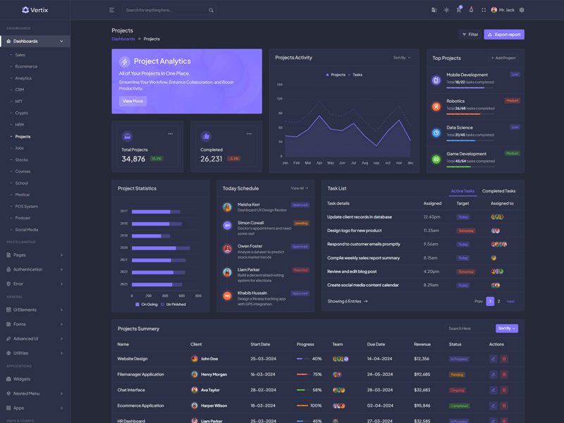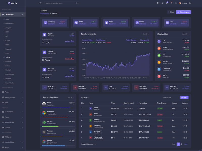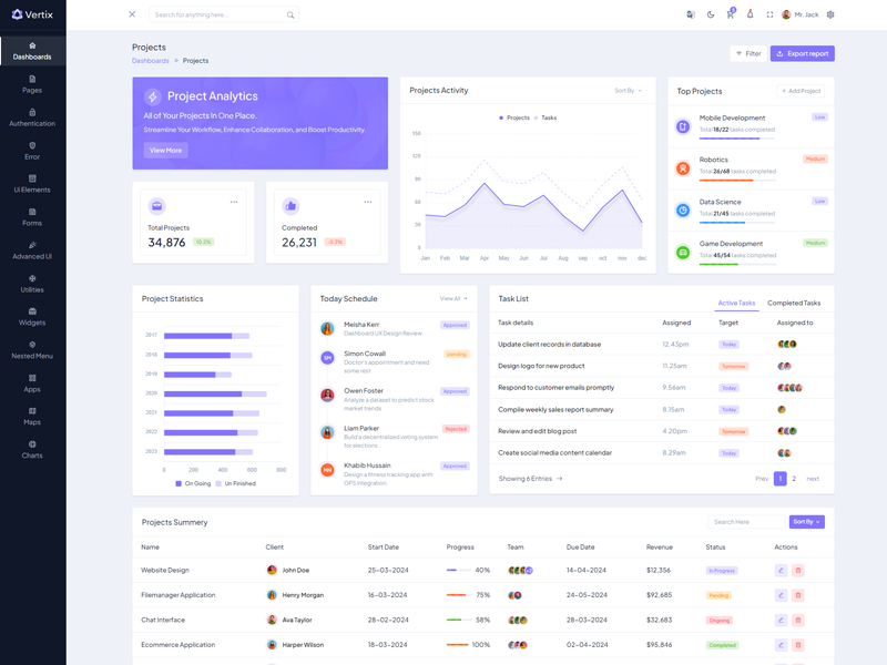 Vertix - Premium Bootstrap 5 HTML 5 Admin & Dashboard Template boasts essential features such as design quality, compatibility with your front-end framework, responsiveness, ease of customization, comprehensive documentation, and dedicated support. Additionally, it includes integrated plugins and other supplementary features.
