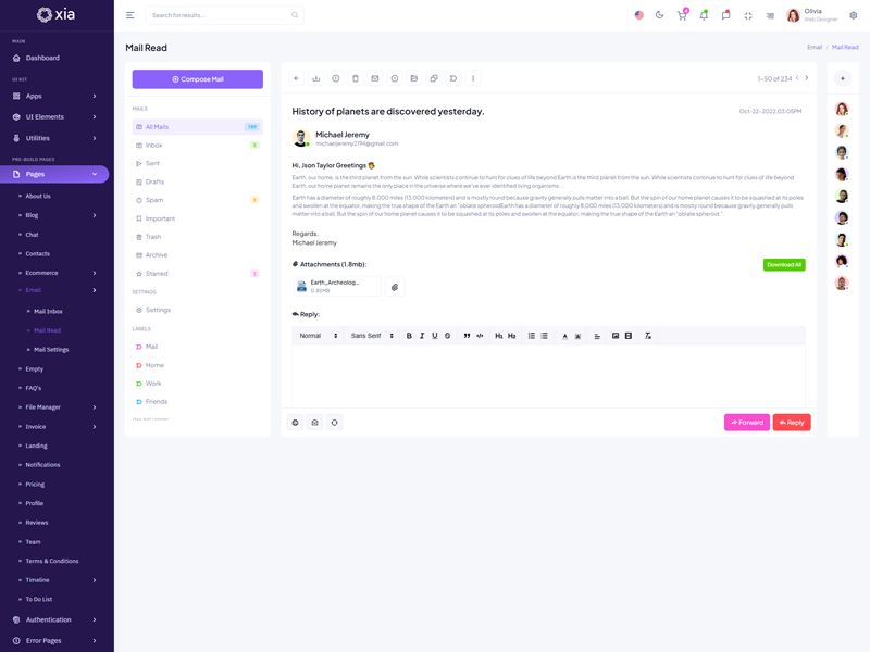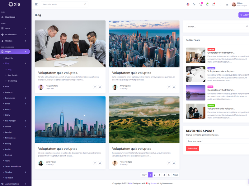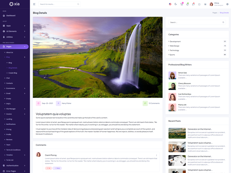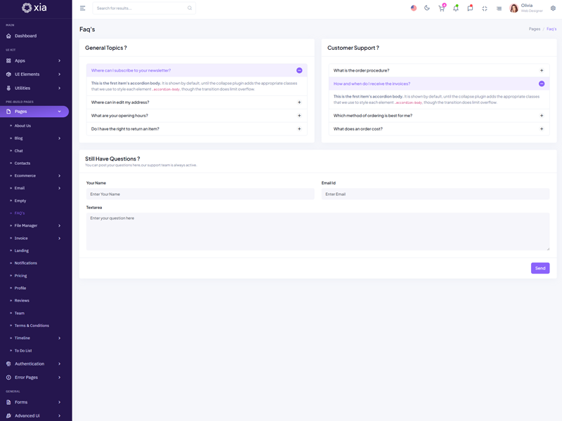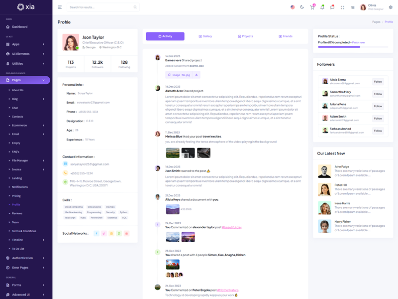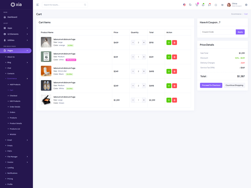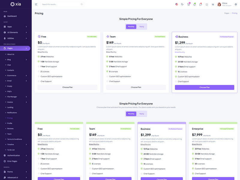 Xia - Premium Admin & Dashboard Template boasts essential features such as design quality, compatibility with your front-end framework, responsiveness, ease of customization, comprehensive documentation, and dedicated support. Additionally, it includes integrated plugins and other supplementary features.