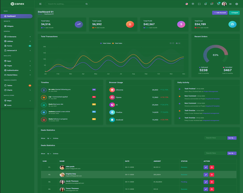 Zanex - Premium Bootstrap 5 HTML 5 Admin & Dashboard Template boasts essential features such as design quality, compatibility with your front-end framework, responsiveness, ease of customization, comprehensive documentation, and dedicated support. Additionally, it includes integrated plugins and other supplementary features.