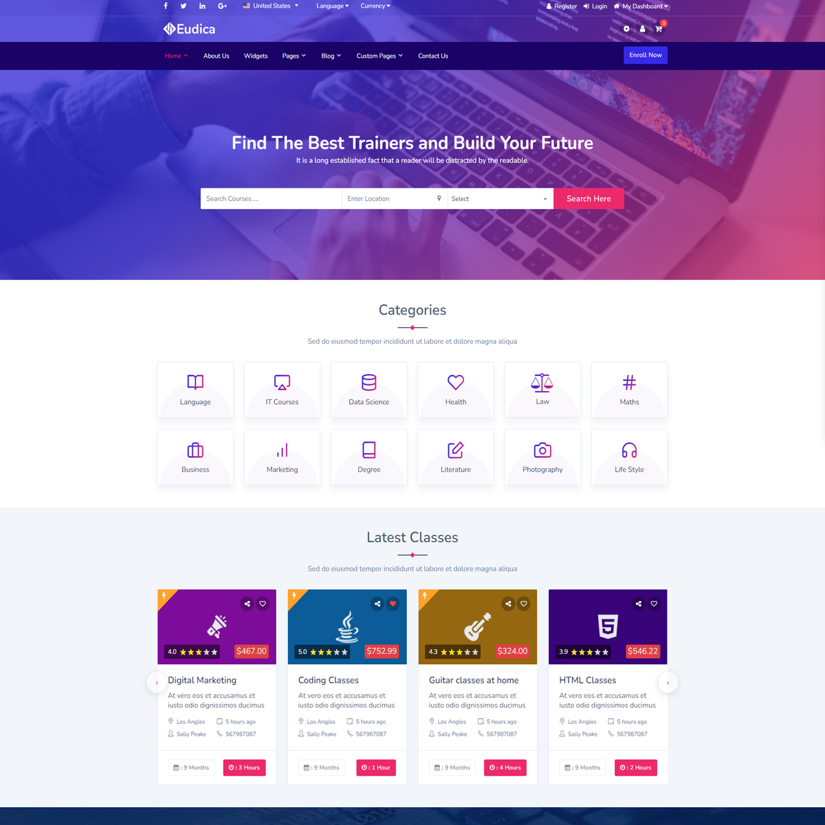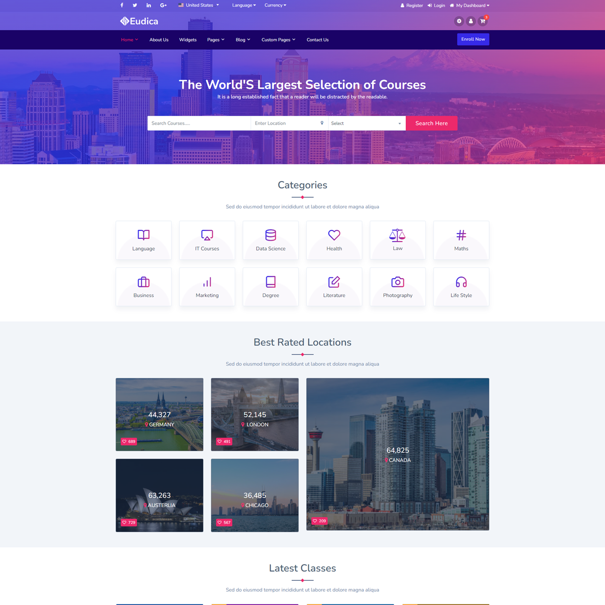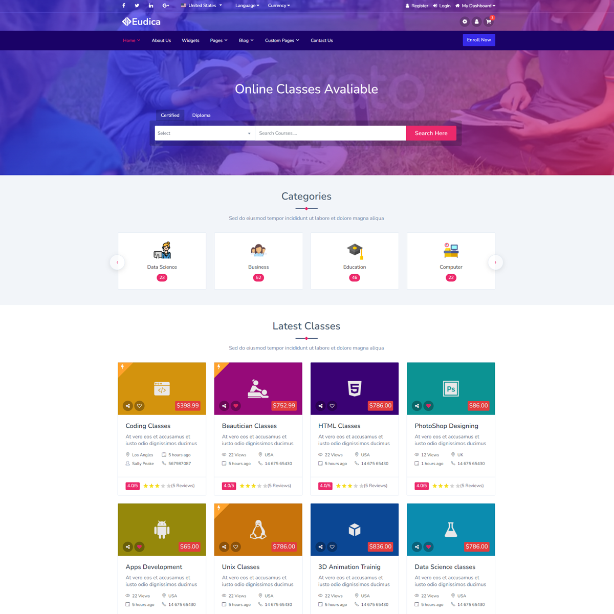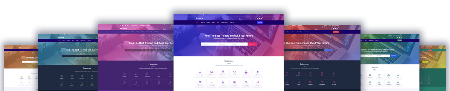 Eudica - Online Education & Learning Courses HTML CSS Responsive Template is available with 9 home pages . So that users can choose their best theme and customize the Eudica Listing template according to their choice.