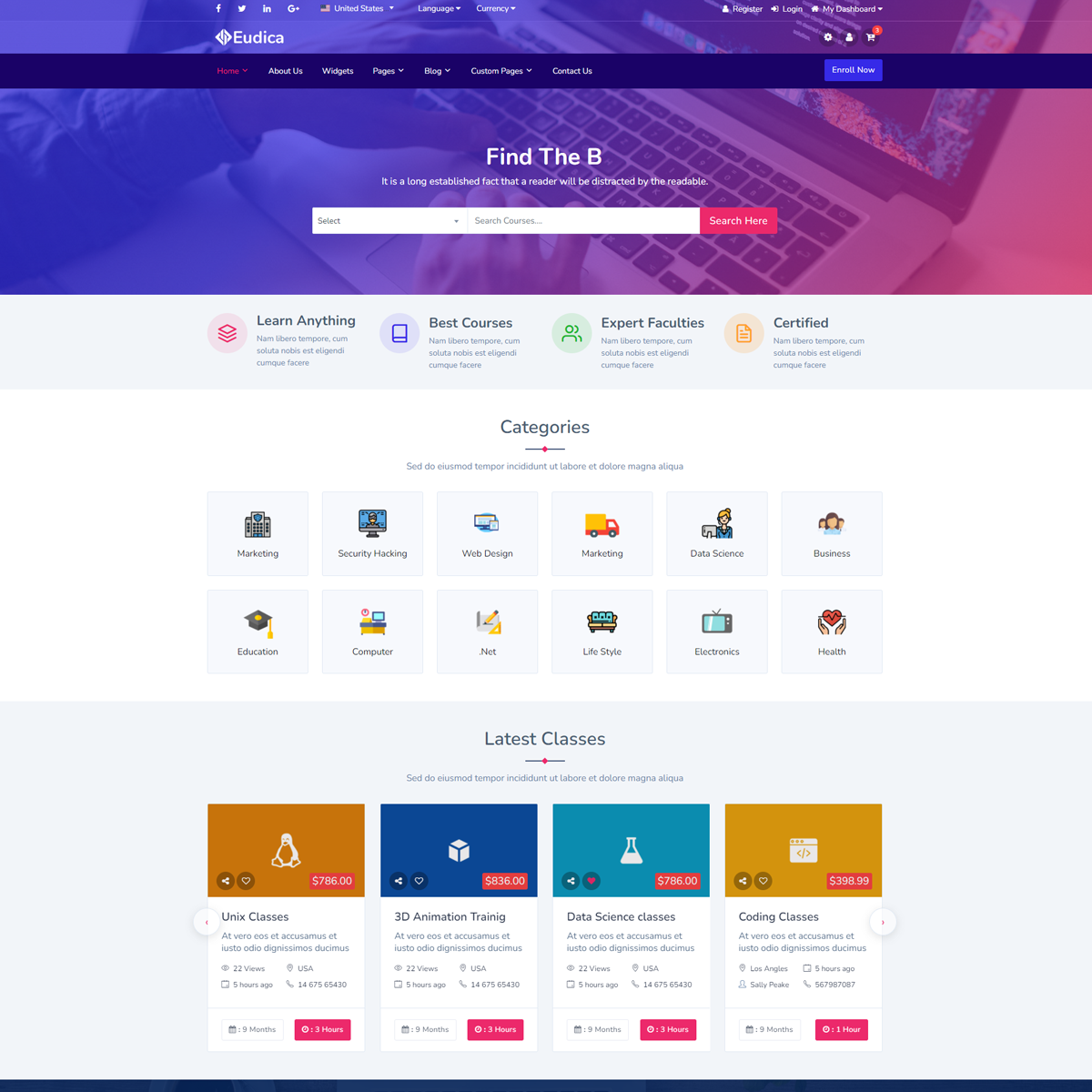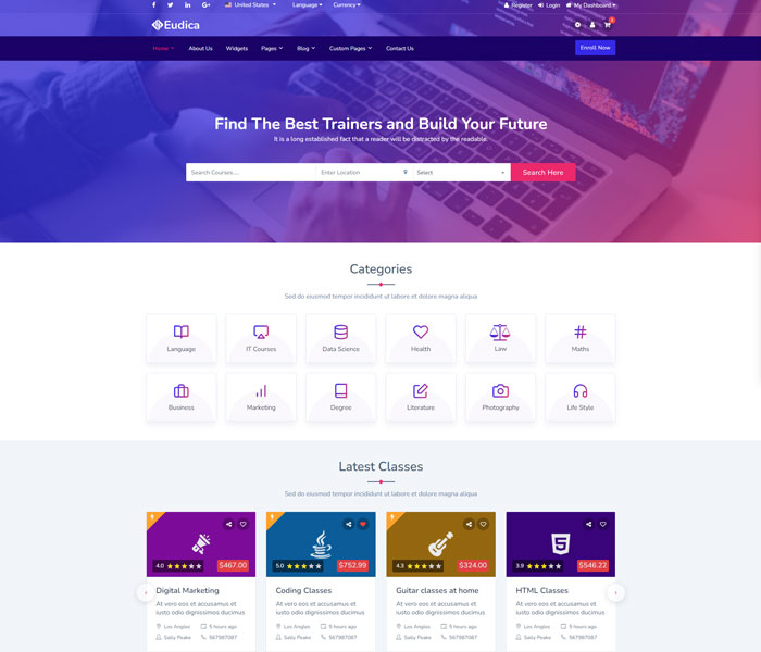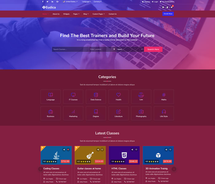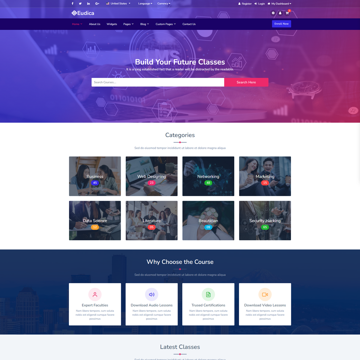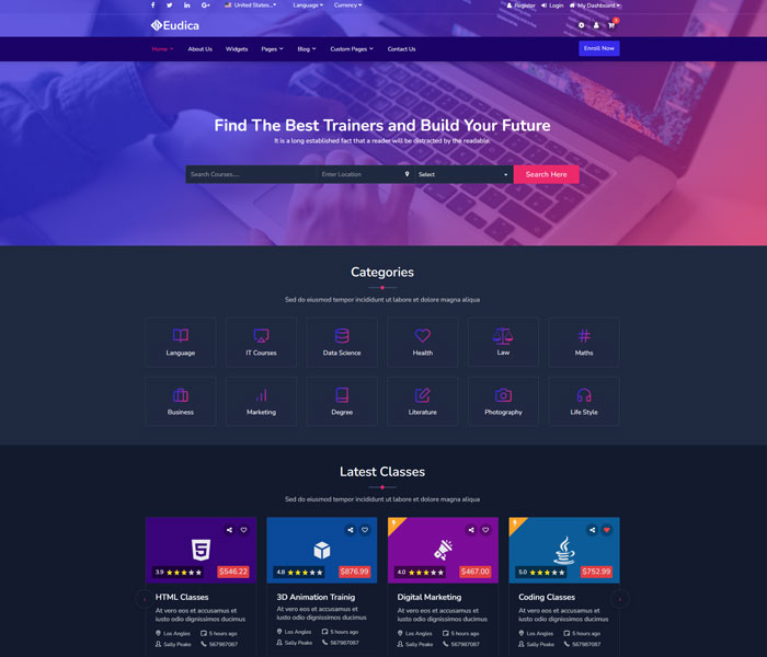 Eudica - Online Education & Learning Courses HTML CSS Responsive Template is available with 9 home pages . So that users can choose their best theme and customize the Eudica Listing template according to their choice.