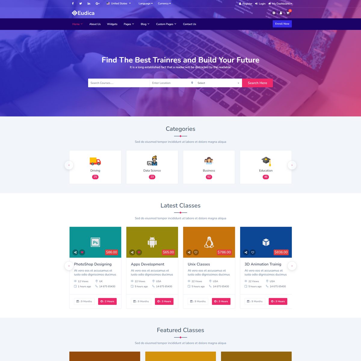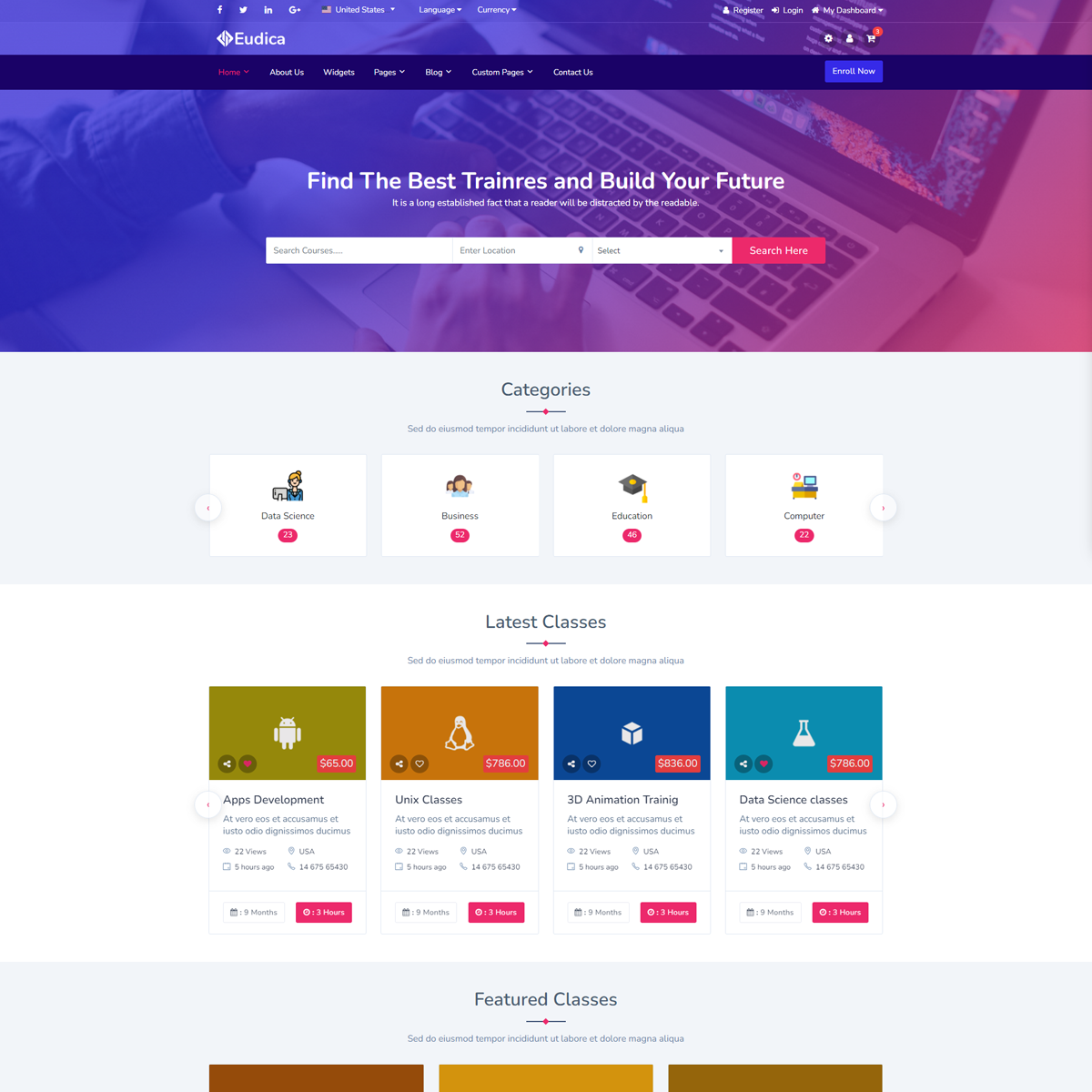 Eudica Online Education & Learning Courses Listing Template comes with ready to use features. It has lots of ready-made features saves more time for developers.