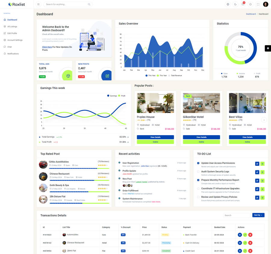 Roxlist - Premium Bootstrap 5 HTML 5 Listing & Dashboard Template boasts essential features such as design quality, compatibility with your front-end framework, responsiveness, ease of customization, comprehensive documentation, and dedicated support. Additionally, it includes integrated plugins and other supplementary features.