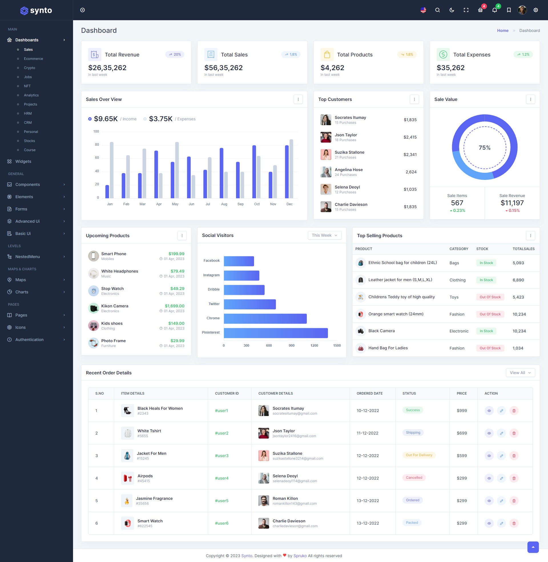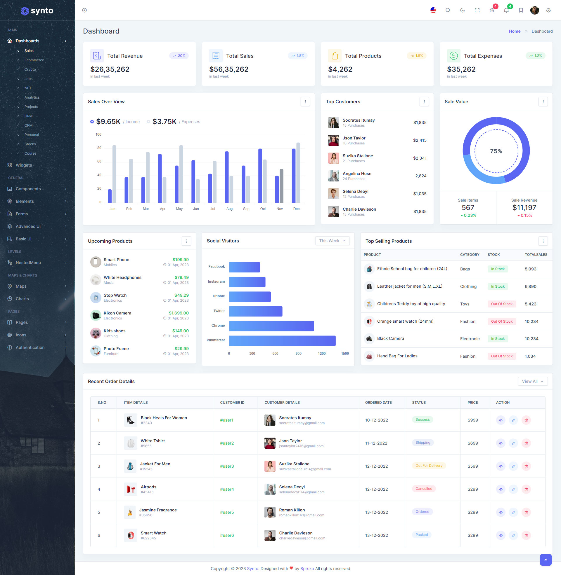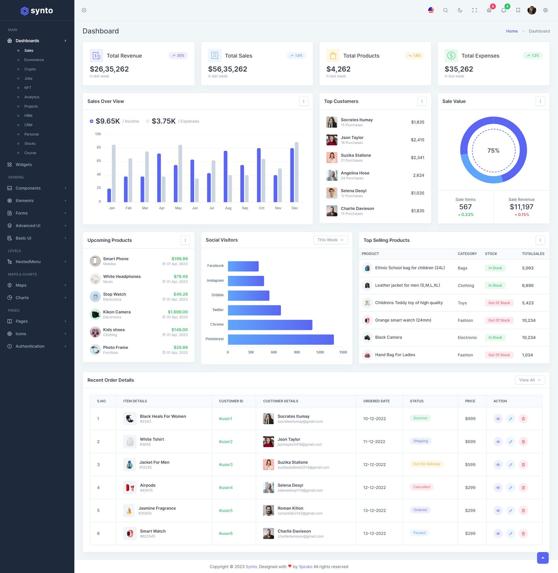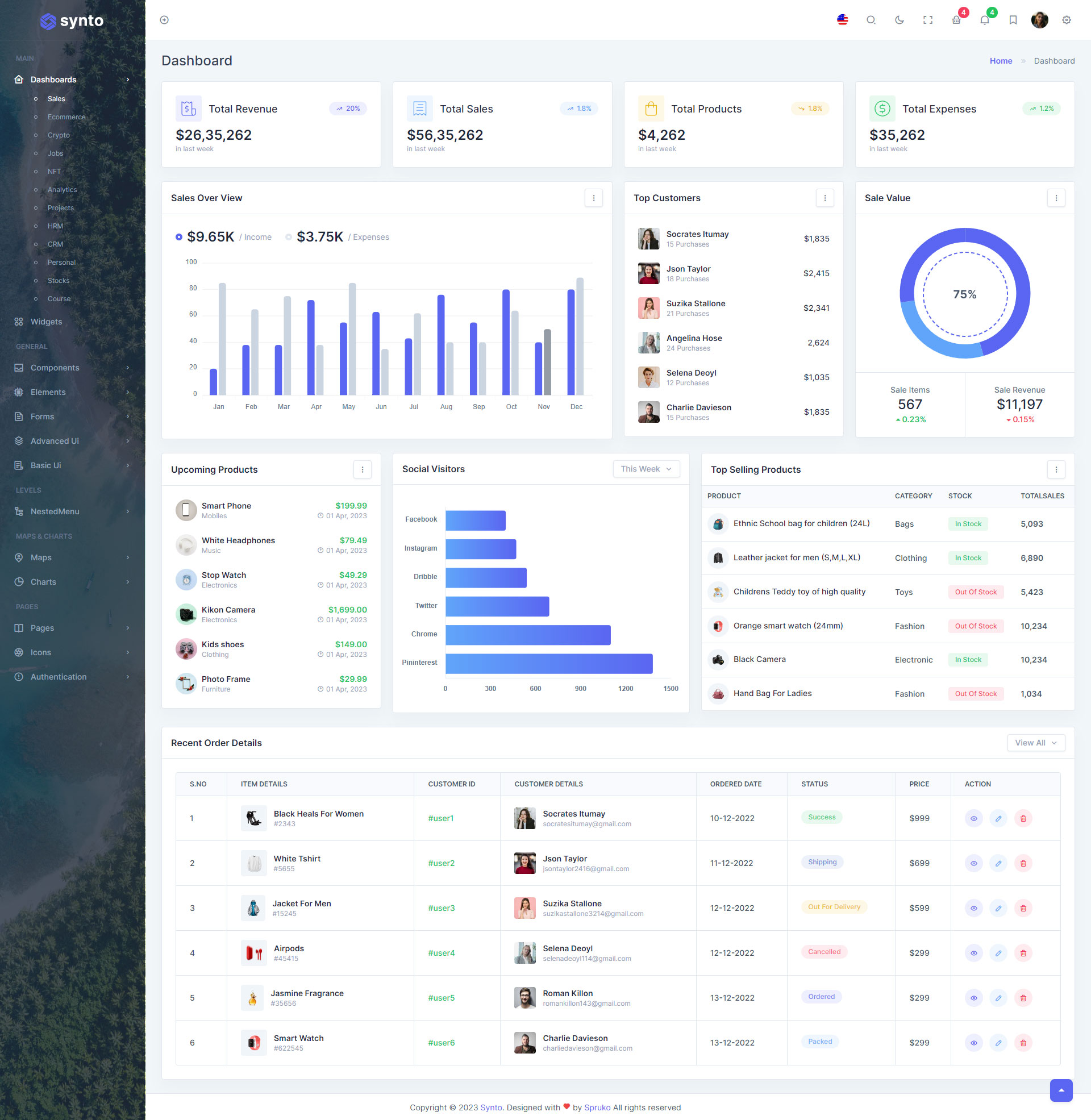 Synto - Now you can use this admin template to design stunning dashboards that will wow your target viewers or users to no end. To create a good and well-structured dashboard, you need to start from scratch with HTML, SCSS, CSS, and JS and with lots of coding, but by using this Synto -Admin template, you can customise your dashboard effortlessly within no time.