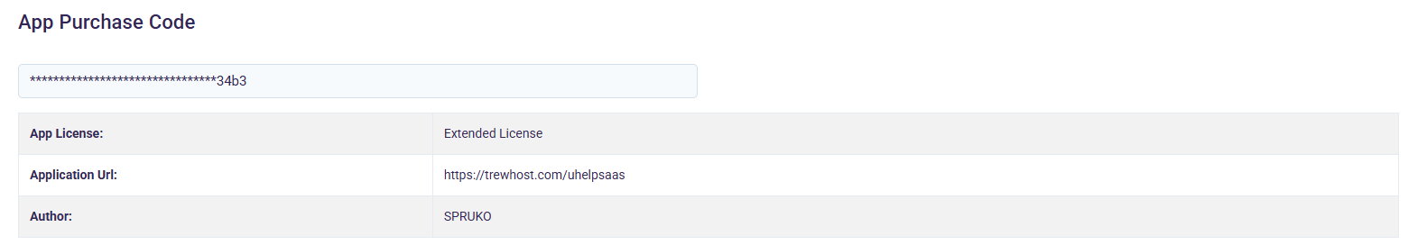 There you’ll see an input field, by default filled with your purchase code. and displays static information about your application, such as the app license, application url, and author.