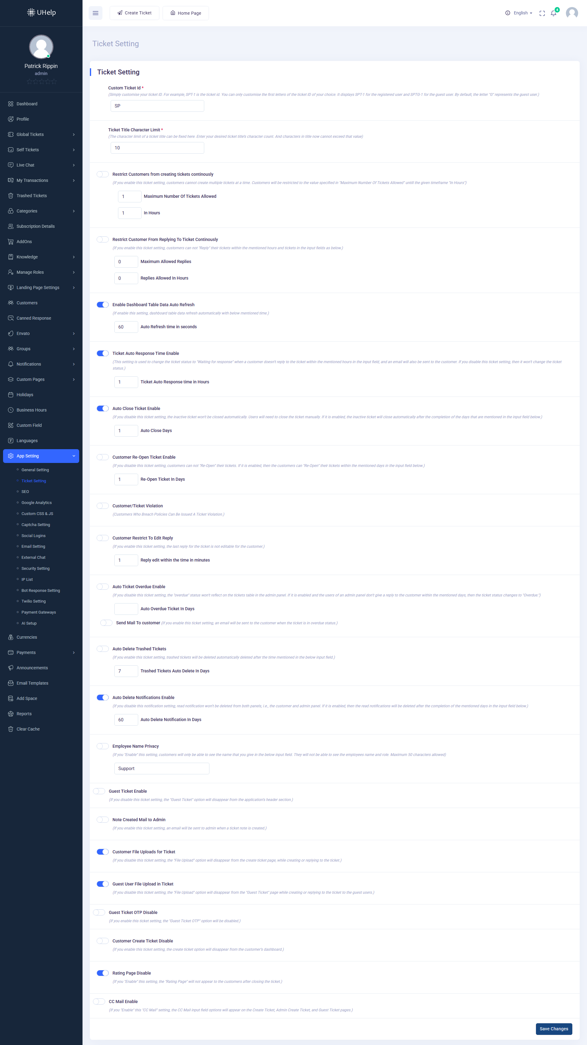Admin panel->App Setting->Ticket Settings. Please select options to control the ticket settings. Or else, you can also refer to the particular "Ticket Settings" page to get an overview of the ticket settings, example as shown in the below image.