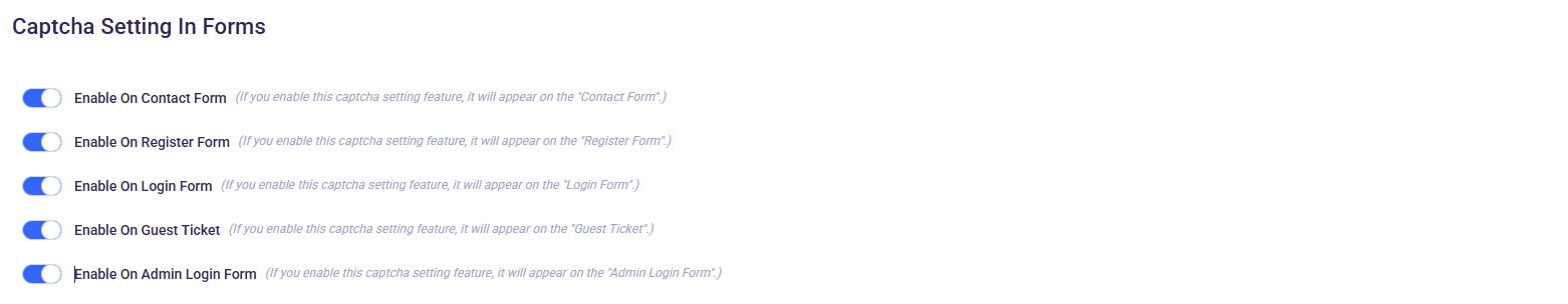 For example, if you want to use manual captcha in the above-mentioned forms, you must first activate the "Manual Captcha Enable" switch button from the above section, then enable the switch button of the forms where you want to use manual captcha.