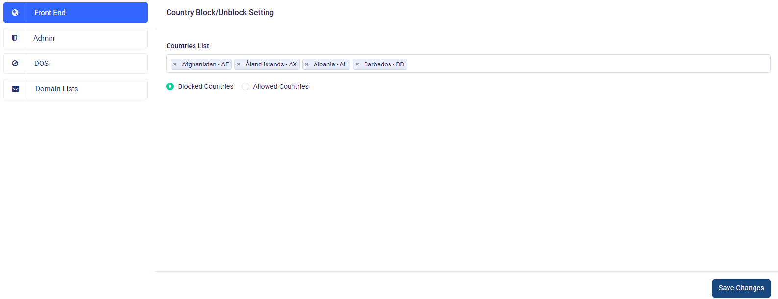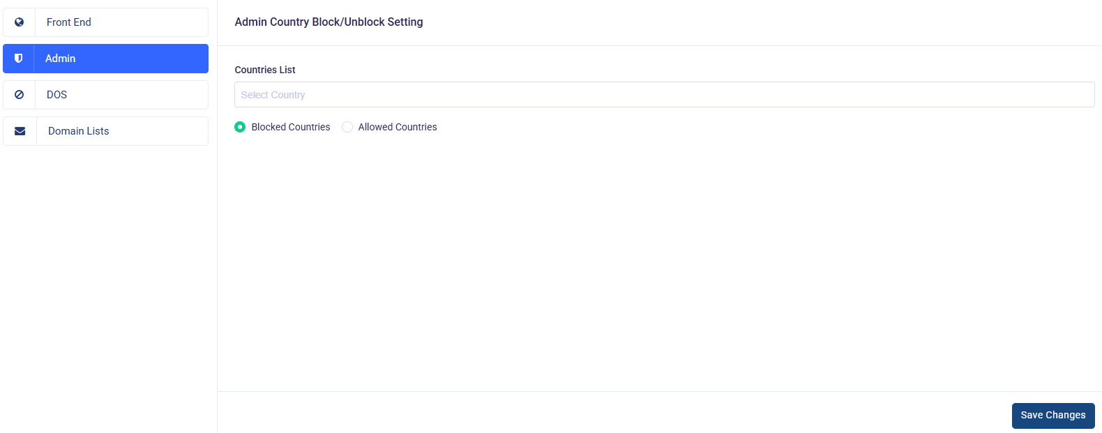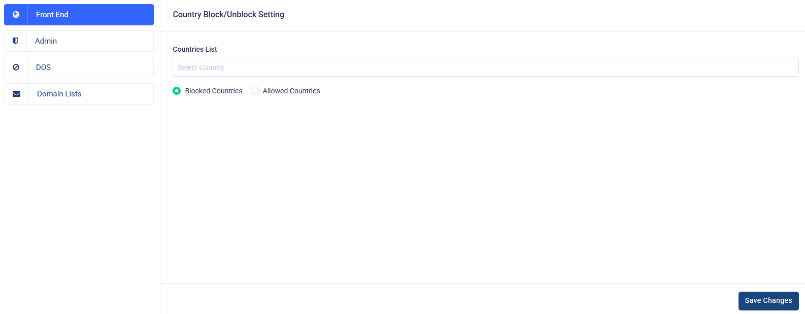 If you want to "Block" or "Allow" a country or multiple countries, then click and select the countries from the "Select Country" dropdown and click on the "Save changes" button to block or allow the countries you selected.