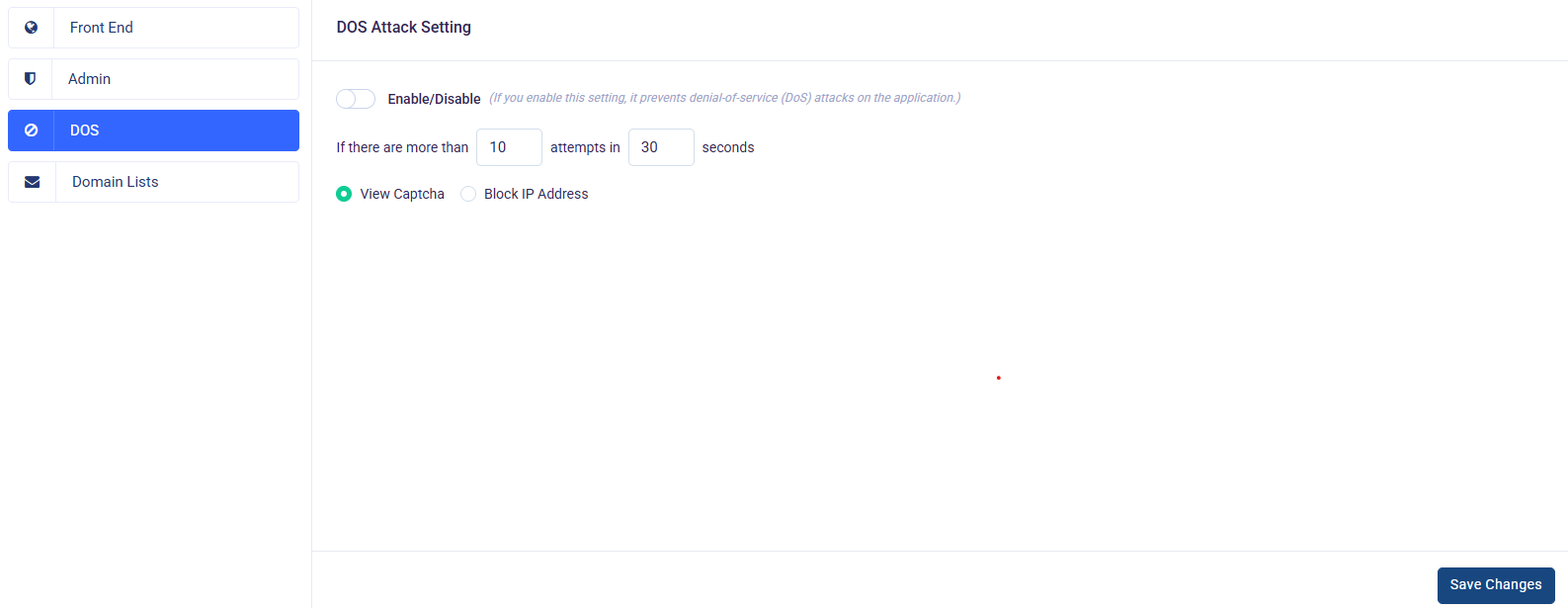 Example: First enable the toggle switch button, choose the "View Captcha" option from the "DOS Attack Setting" section and set 10 in the first input field ("Attempts") and 30 in the second input field ("Seconds") and click on the "Save Changes" button. If a user tries to access the application 10 times in 30 seconds, his or her IP address will be temporarily blocked and he or she will be redirected to the captcha page. Or if you choose "Block IP Address", then it will block the IP address permanently. If you don't want to use this feature, simply click on the above toggle switch button to disable it.