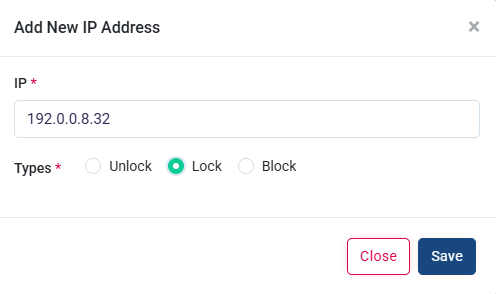 When you click on the "Add IP Address" button in the "IP List" table, a modal pop-up will appear with the "IP" input field and "Type". Fill in the input field and select the option from the "Type" and click on the "Save" button to apply the changes.