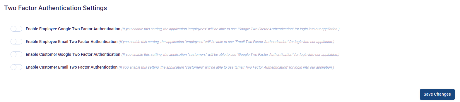 Admin Panel -> App Settings -> General Settings page, the "Two Factor Authentication Settings" section allows administrators to configure authentication options for employees and customers.