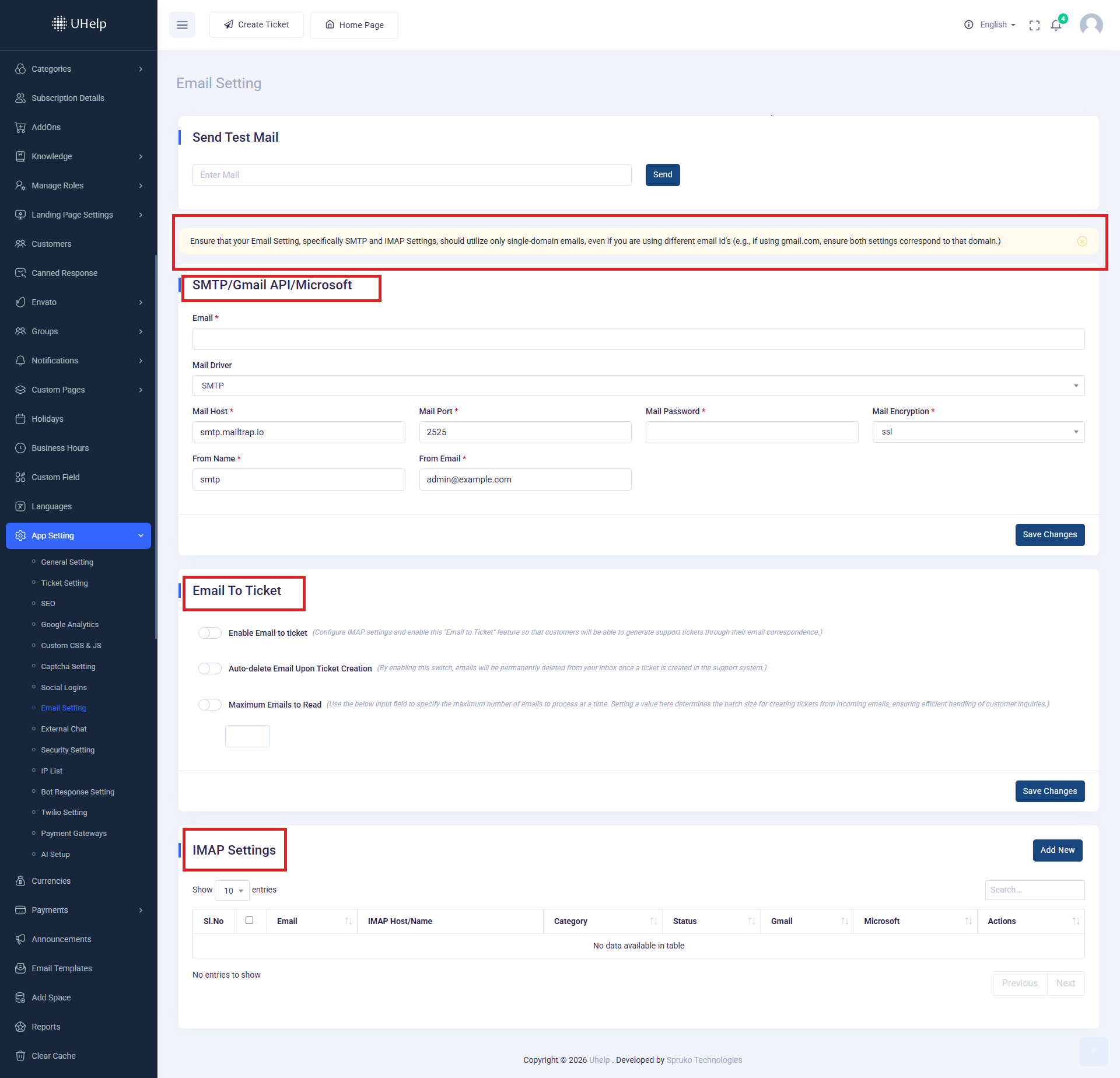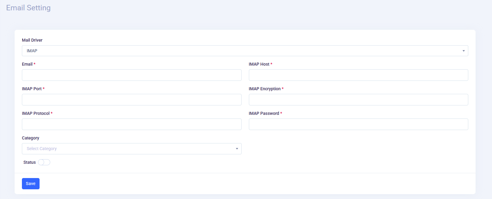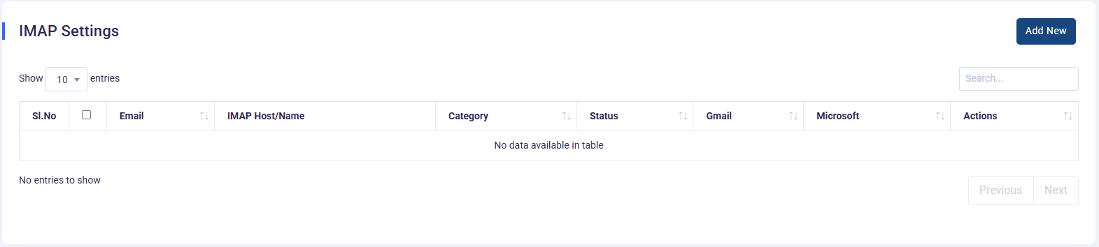To activate this feature, go to the Admin panel and navigate to App Settings. You will be redirected to the "Email Settings" page. Scroll down to the "IMAP Settings" section, where you'll find an "Add New" button.You can select Mail Driver from the given options called Gmail, Microsoft and Imap.