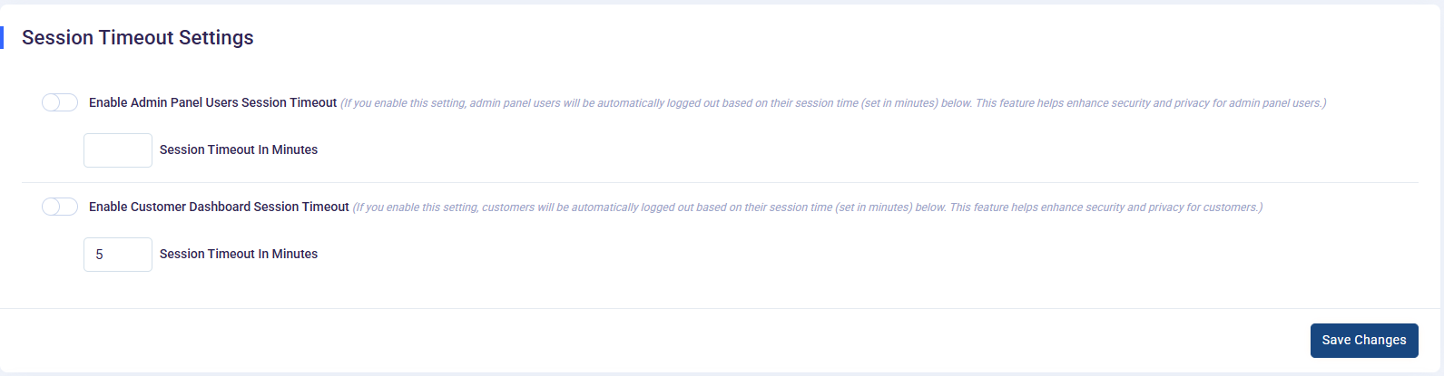 Admin Panel -> App Settings -> General Settings page, the "Session Timeout Settings" section empowers administrators to manage session durations for both admin panel users and customers, enhancing security and privacy.