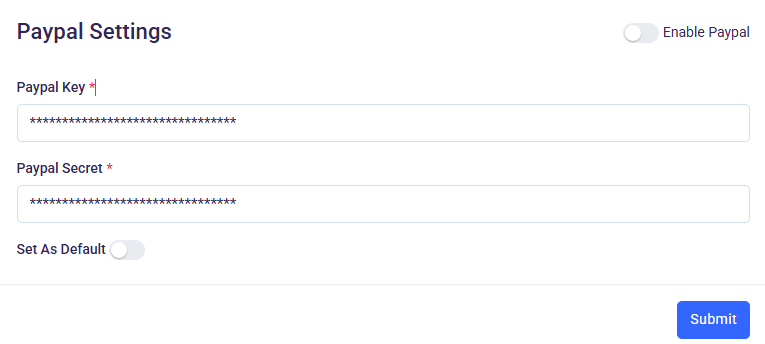 Admin Panel -> App Settings -> Payment Gateways page.To generate a PayPal client ID (key) and secret, follow these steps: