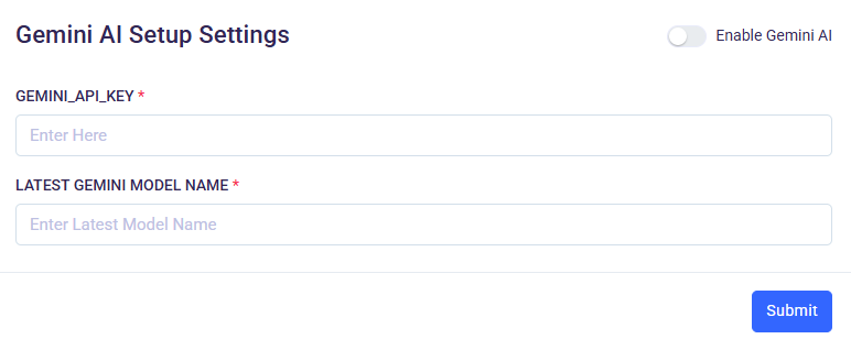 We have introduced the "AI Setup" page to enable AI in this application. For this, you need to generate a Gemini API key in Google AI Studio https://ai.google.dev/gemini-api/docs/api-key. Here, you can generate an API key by clicking on "Get a Gemini API key in Google AI Studio". This will ask you to log in using a Google account.