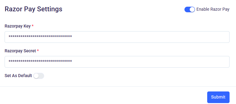 To generate Razorpay API keys (publishable and secret) for your application, follow these steps:
