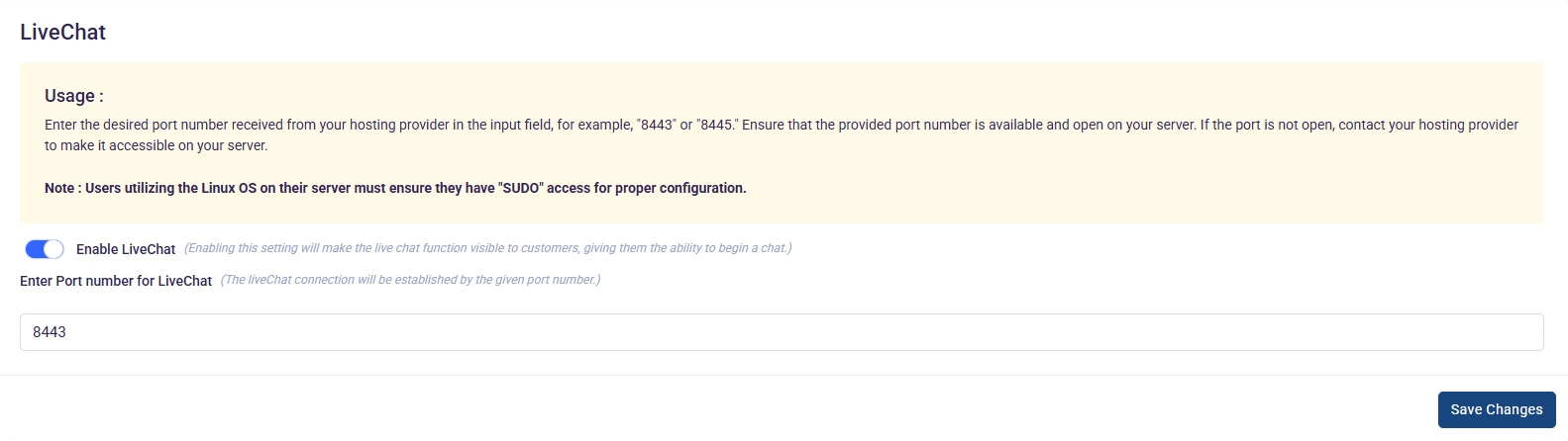 In this LiveChat section, we have to setup two settings. "Enable LiveChat" and "Enter Port number for LiveChat"