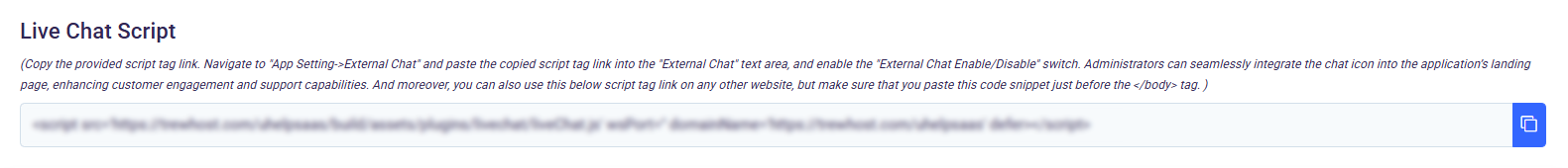 <script src='https://example.com/UHelp/build/assets/plugins/livechat/liveChat.js' wsPort='8443' domainName='https://example.com/UHelp' defer></script> . This link is crucial for integrating the chat icon into the application's interface/landing page.