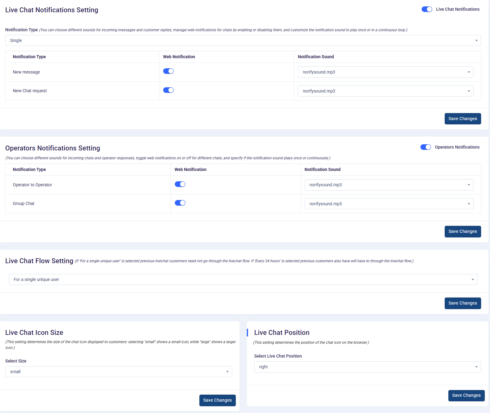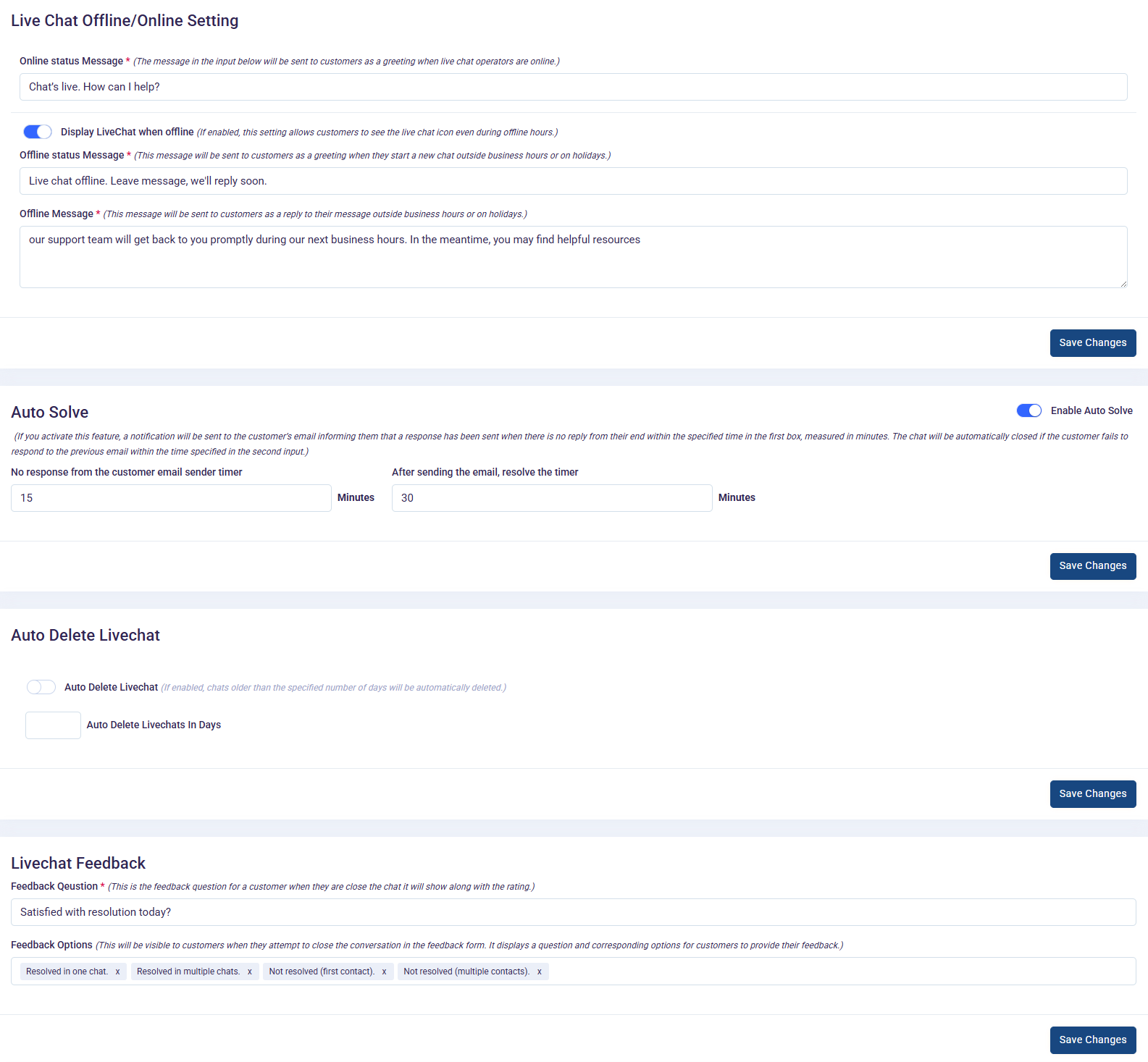 The "Live-chat Setting" page within the application serves as a centralized hub for configuring various settings related to live chat functionality. Let's delve into each setting available on this page: