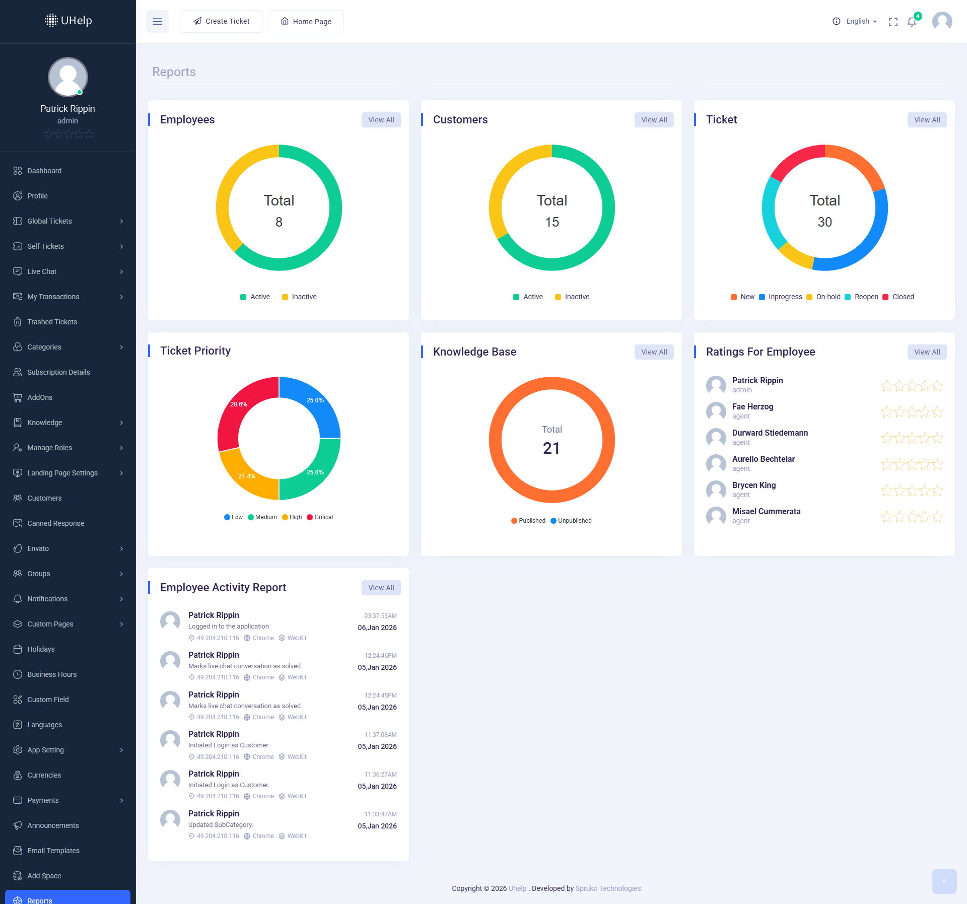 Go to Admin Panel->Reports page To monitor the total activities of all “Employees,” “Customer’s,” “tickets,” and it also contain a “Employee Reports” table.